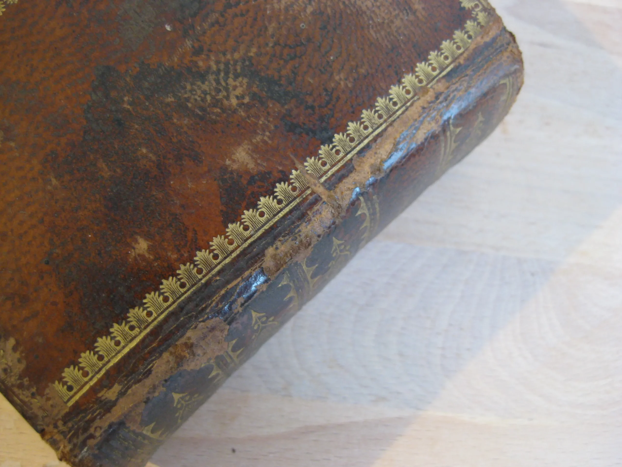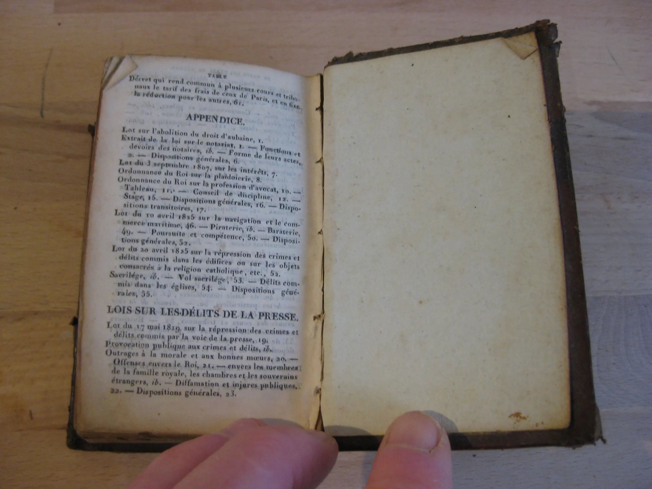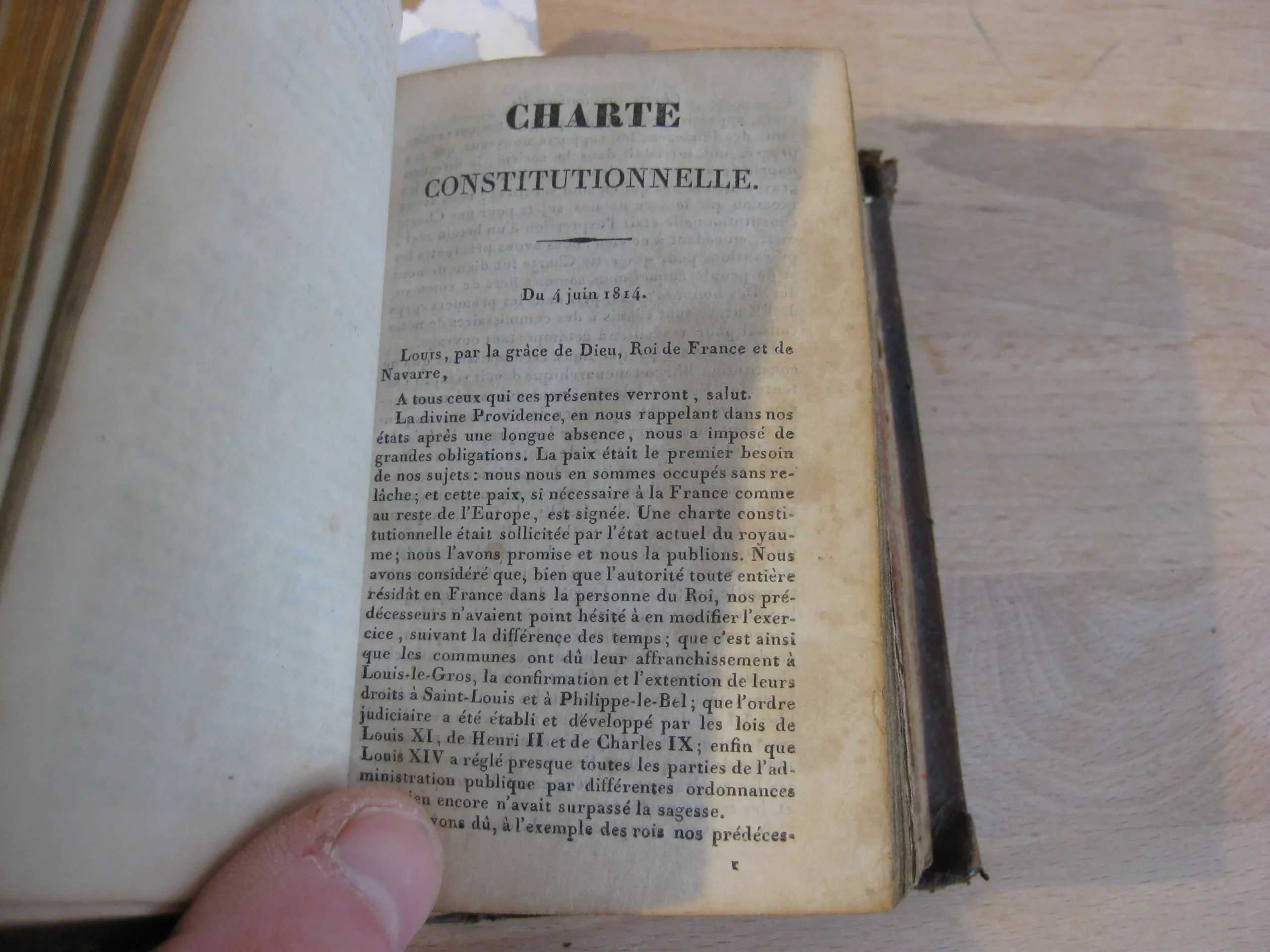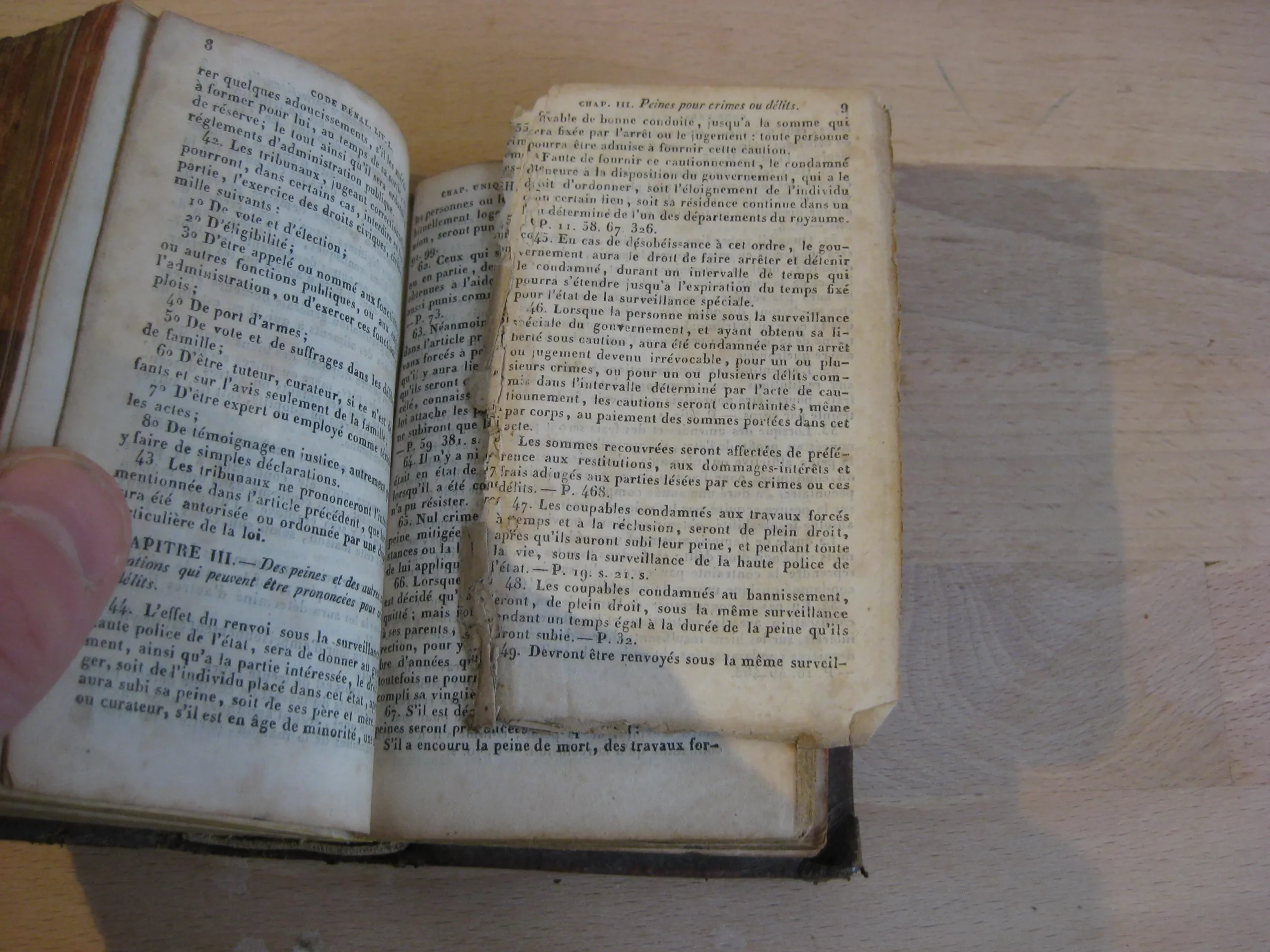 Plein veau marbré à dos long orné du titre et joliment décoré, plats ornés d’une frise, 105 x 66, 404p. 196p. 125p. 140p. et 113p. Suivis de : Appendice aux cinq codes, paginé 2-55 ; Table du : Code civil / Code de procédure civile / Code de commerce / Code pénal / Des frais et depens, 9p. In fine : Appendice ; Loi sur les délits de la presse, 1p. Avant la lettre : Table des frais et dépens pour le ressort de la Cour royale de Paris, paginé 2-63 ; Charte constitutionnelle du 04 juin 1814. ij-x (suivi de 1p. De notes). Sans date [ca 1822 date figurant sur une loi dans l’appendice aux cinq codes ; année correspondant à une édition]. Page de titre manquante. Intérieur insolé mais propre, rousseurs marginales. Coins et champs frottés, trois coins émoussés et un champ avec un petit manque. Plats frottés avec épidermures et petit manque en bordure de plat supérieur. Mors frottés avec épidermures, plus marquées en mors inférieur ; dos frotté mais bon, avec épidermures en coiffe et queue.