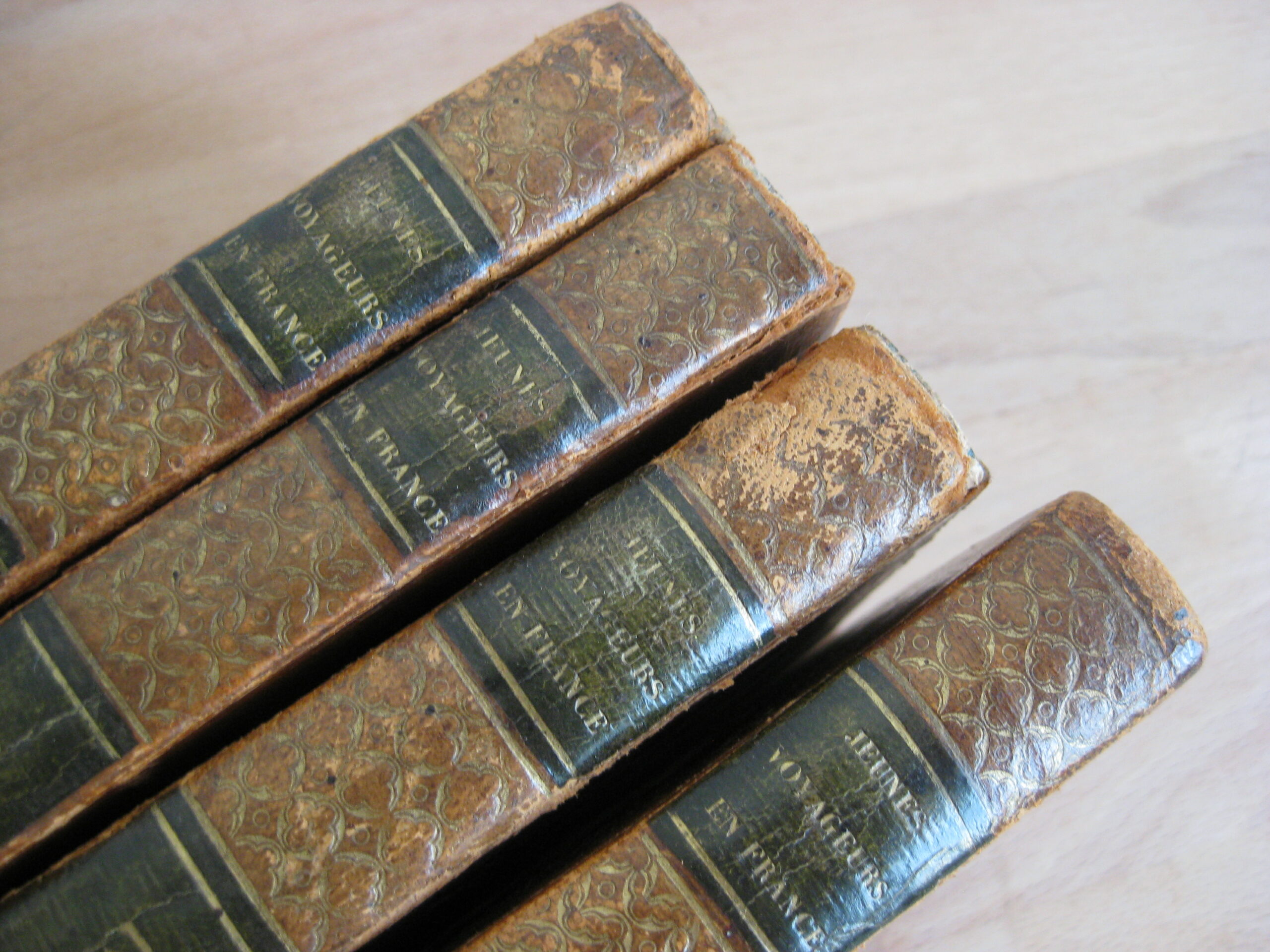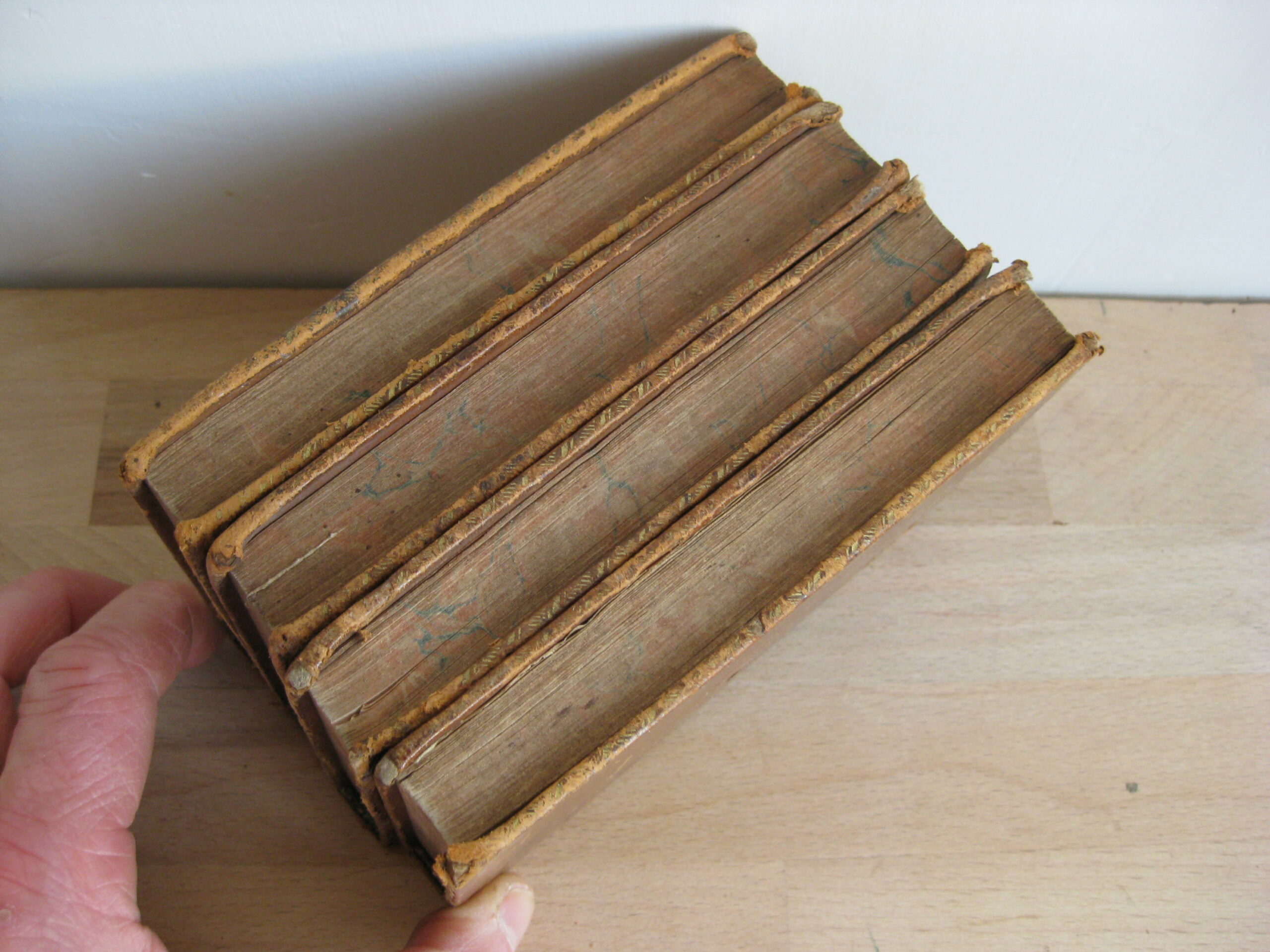 4 volumes in-16 veau raciné fauve, dos à décors de rosaces dorée, pièces de titre en maroquin noir en cuir à long grains, titre et tomaison dorés. Tranches marbrées à dominantes rouges (assez passées). Frontispice dans chacun des volumes, de même que page de titre gravé et 2 planches hors texte. De même deux pages de titre dont une non illustrée et datée (sauf T1 manquante) 137 x 85. 2Ème éd. 1829. Ex-libris « V. Chapuis » tamponné sur chaque volume dont un en page de titre, et un autre « Château de S-Jullin par Crémieu (Isère) » en garde en surimpression lettrée dans le papier sur chaque volume. T1, 214p. Avec table. T2, 216p. Avec table. . T3, 241p. Avec table. 2Ème éd. 1829. T4, 267p. Avec Table. En T1, une étiquette de prix collé en plein contrepat supérieur lié à M. Chapuis, classe de sixième du collège de Valence, – date arrachée. Une autre petite étiquette avec un code est collée au contreplat supérieur des 4 vols ; Rousseurs dans tous les volumes, d’intensité variable. Quelques petites cornes dans un volume et une dans un autre. Plats frottés avec épidermures. Coins et champs frottés, coins émoussés. Dos et mors frottés, 3 coiffes arasées ; queues avec épidermures, dos avec épidermures, plus marquées en T3. Bien fermes.