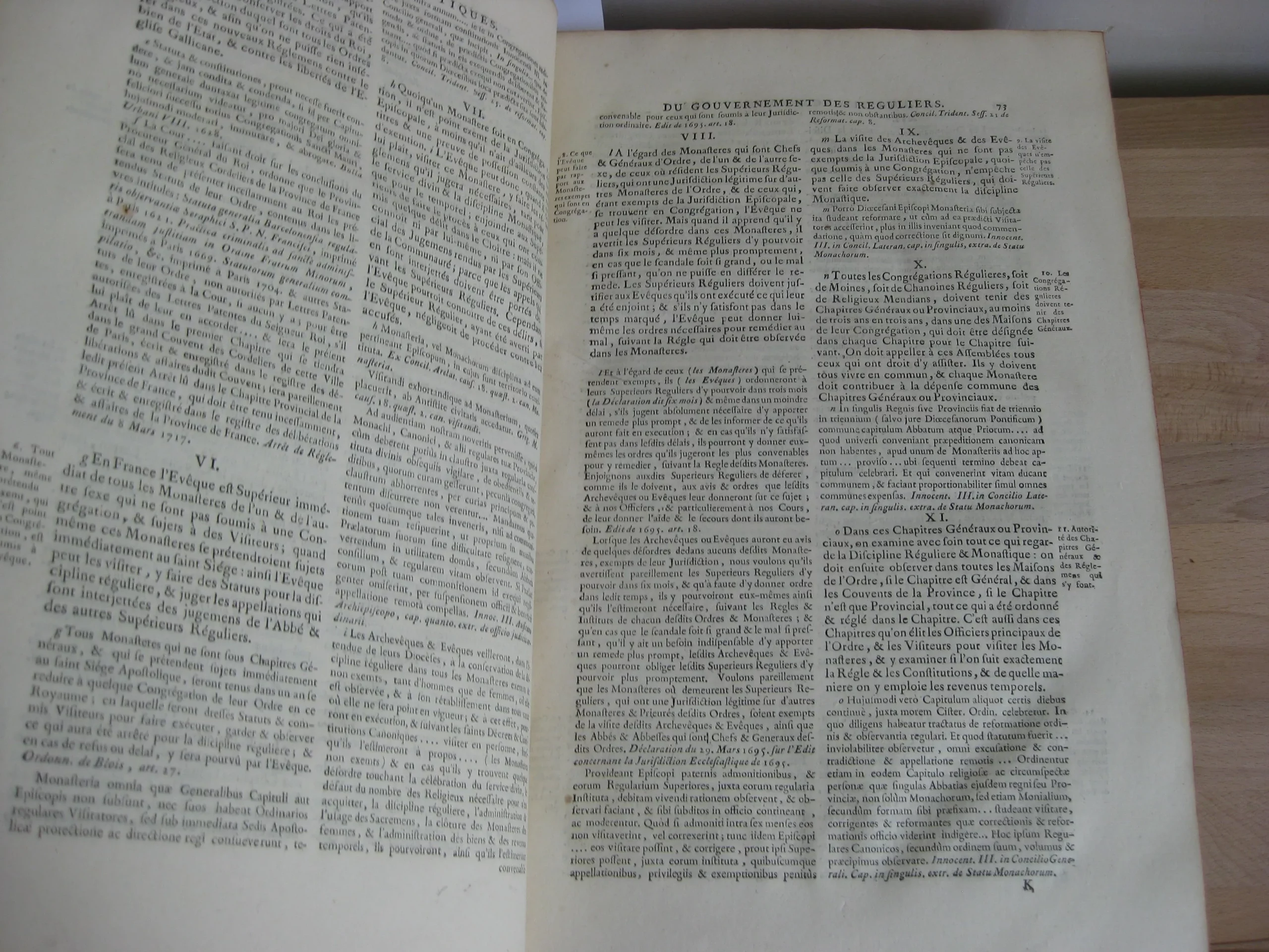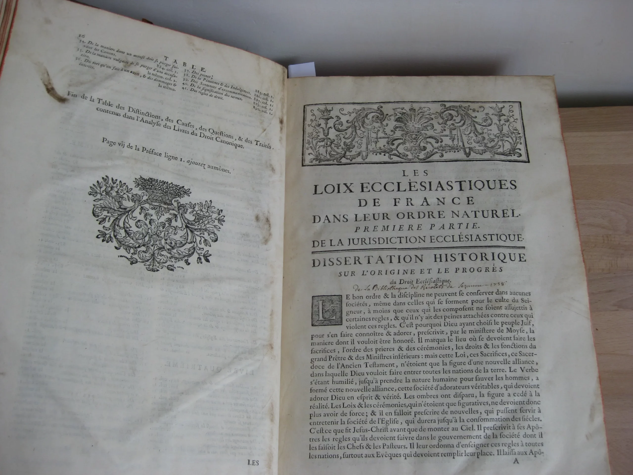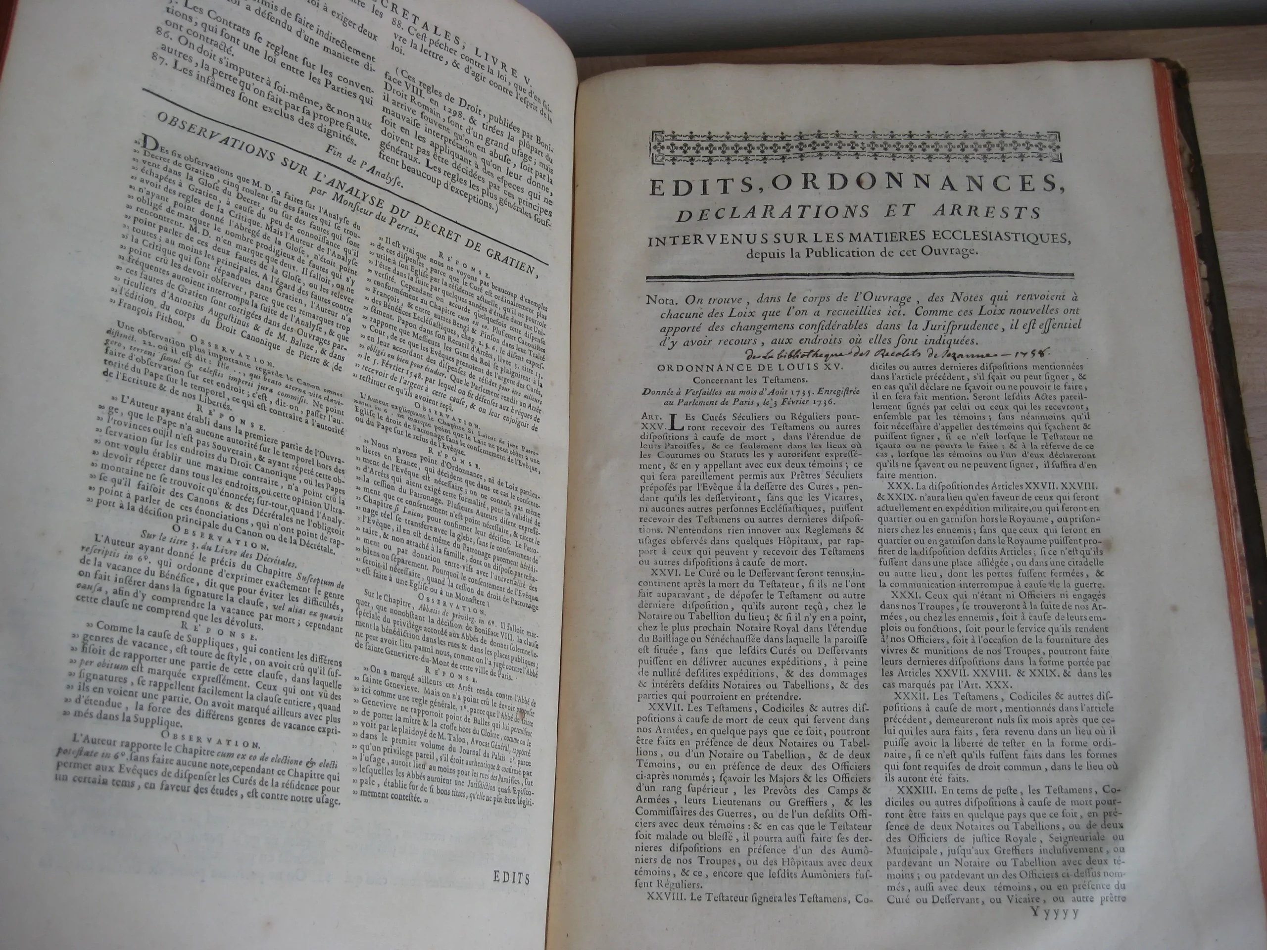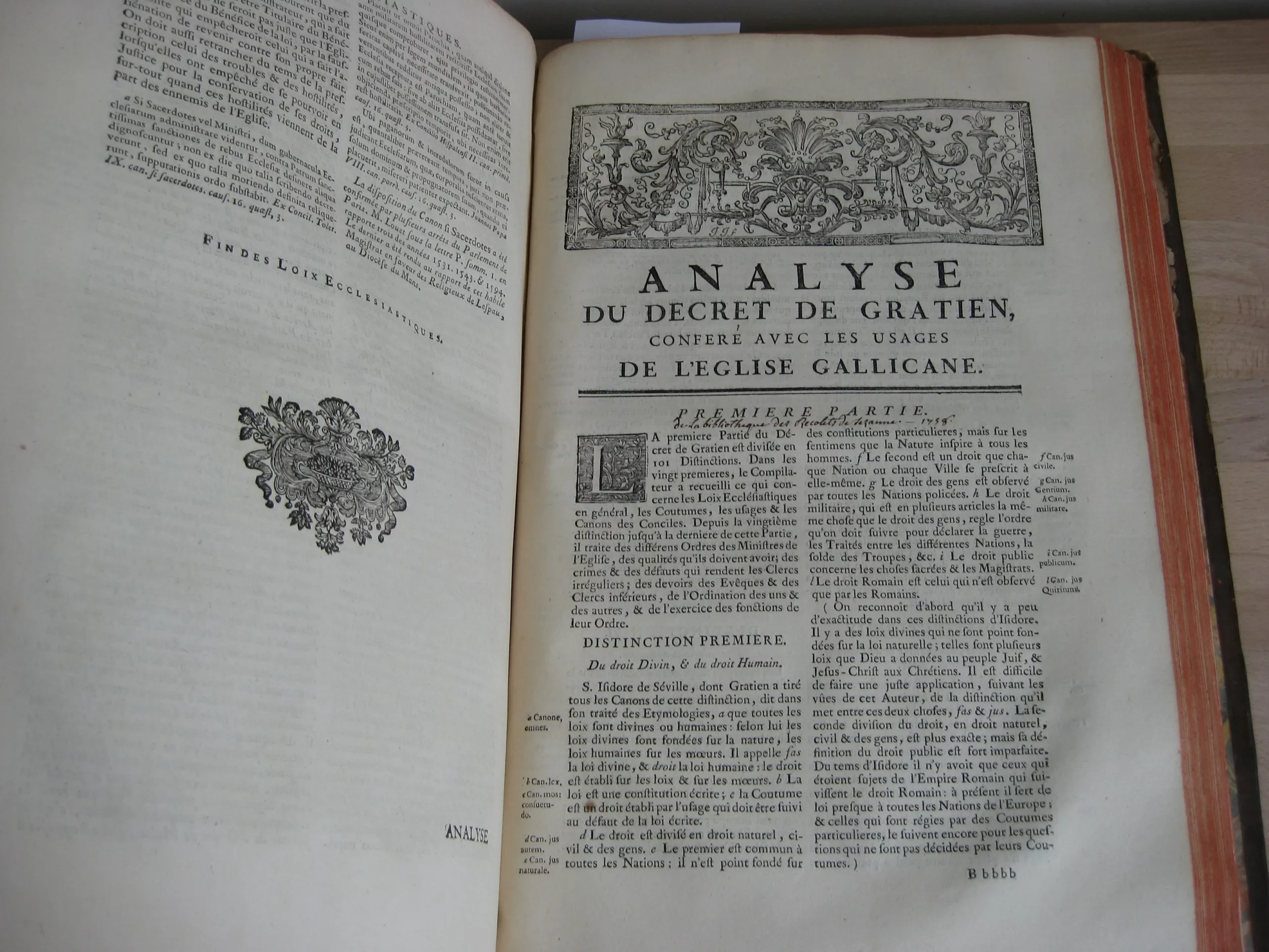 In-folio plein veau marbré, champs ornés, dos à six nerfs, pièce de titre, tranches rouges, 400 x 270, 926p. Hors table (54p.). 1756. Nouvelle édition, revue, corrigée et augmentée. Ex-libris manuscrit latin au tire des Recollets de Sézanne , 1758. Un tampon de la bibliothèque municipale de Sézanne au faux-titre et répété une fois en marge dans le texte. Comprend : Faux-titre, titre [vignette] ; Préface, Avertissement, Privilège, 8p. [entête, lettrine, cul-de-lampe] ; Table des parties, chapitres, articles contenus dans les Loix ecclésiastiques, et Table des distinctions, des causes, des questions & des titres contenus dans l’Analyse des livres du droit canonique etc ; et Table des décrétales de Grégoire IX Sexte de Boniface VIII, etc., pp.1-10 [2 culs-de-lampe]. Puis le texte [4 entêtes, 4 lettrines, 3 cul-de-lampe] ; Fin des Loix ecclésiastiques p.724. Puis Analyse du décret de Gratien conféré avec les usages de l’église Gallicane, pp. 734 à 892. [1 entête, 1 lettrine], reprise de l’ex-libris au titre en français cette fois « Bibliothèque des Recollets de Sézanne, 1758 ». Puis « Edits, ordonnances, déclarations et arrests intervenus sur les matières ecclésiastiques depuis la publication de cet ouvrage, p. 893 à fin ; ex-libris en français répété. Intérieur très frais, très propre, excepté 3 pages cornées en pied. Garde manquante ; dernière page de garde qui se détache. Reliure avec accidents : coins et champs frottés, coins émoussés ; plats frottés avec épidermures et petits manques. Mors supérieur ouvert sur trois caissons de tête et en pied sur demi-caisson de pied. Mors inférieur ouvert sur deux caissons en tête , brièvement en pied et fendu en plein. Dos avec coiffe et queue manquantes, manques en caisson de tête et queue. Exemplaire solide néanmoins. Juriste et avocat, Louis de Héricourt (1686-1752) est entré dans les ordres bénédictins puis oratoriens, après avoir été ingénieur dans l’armée de Flandre.