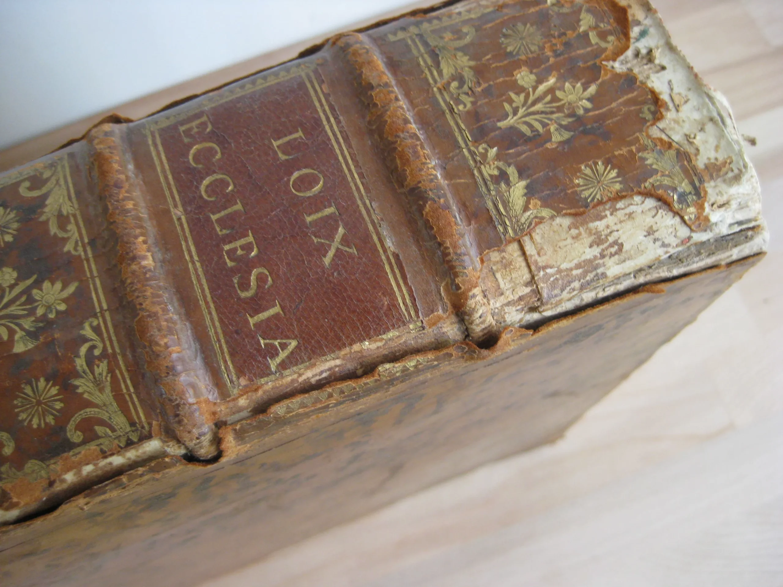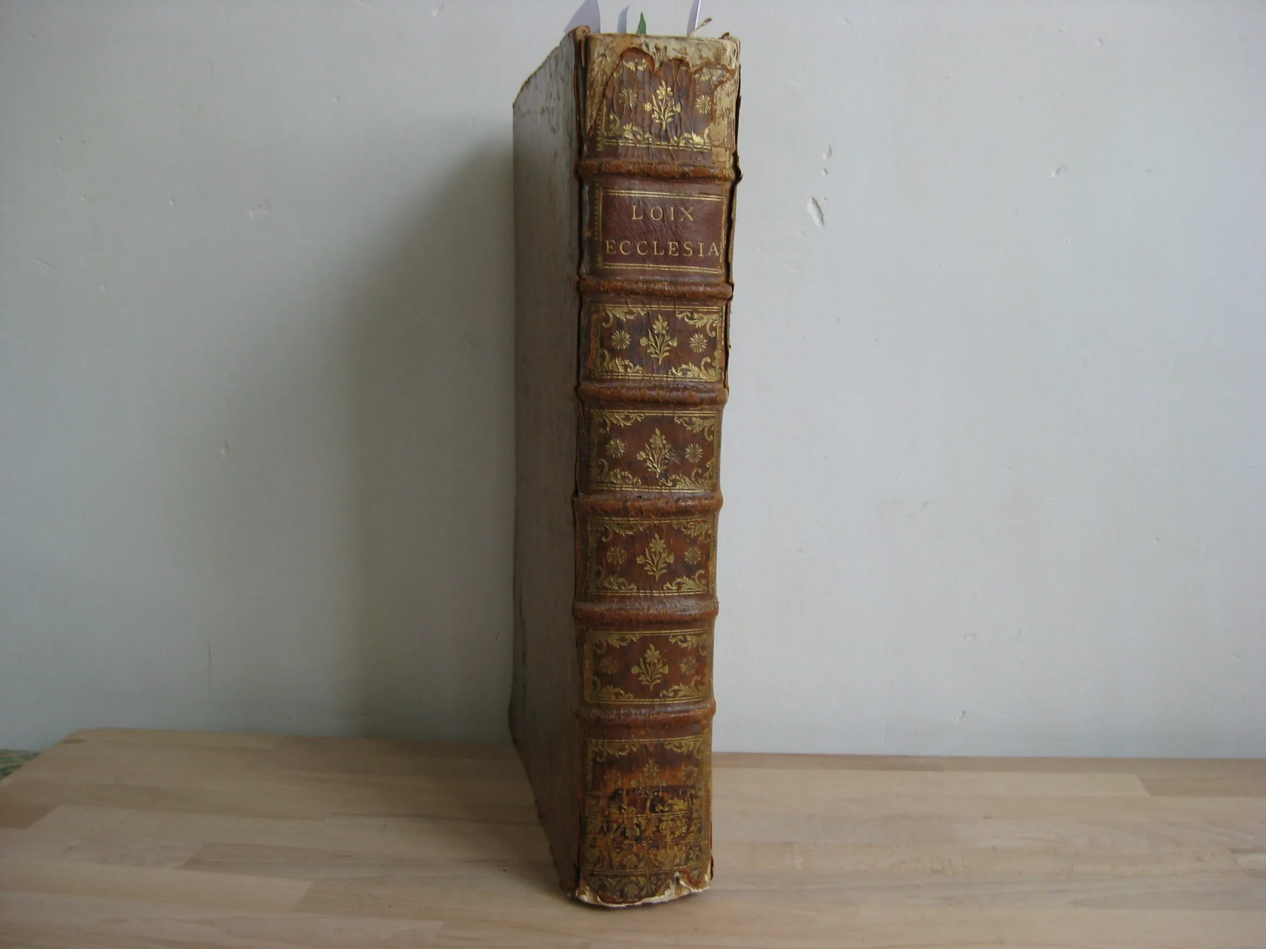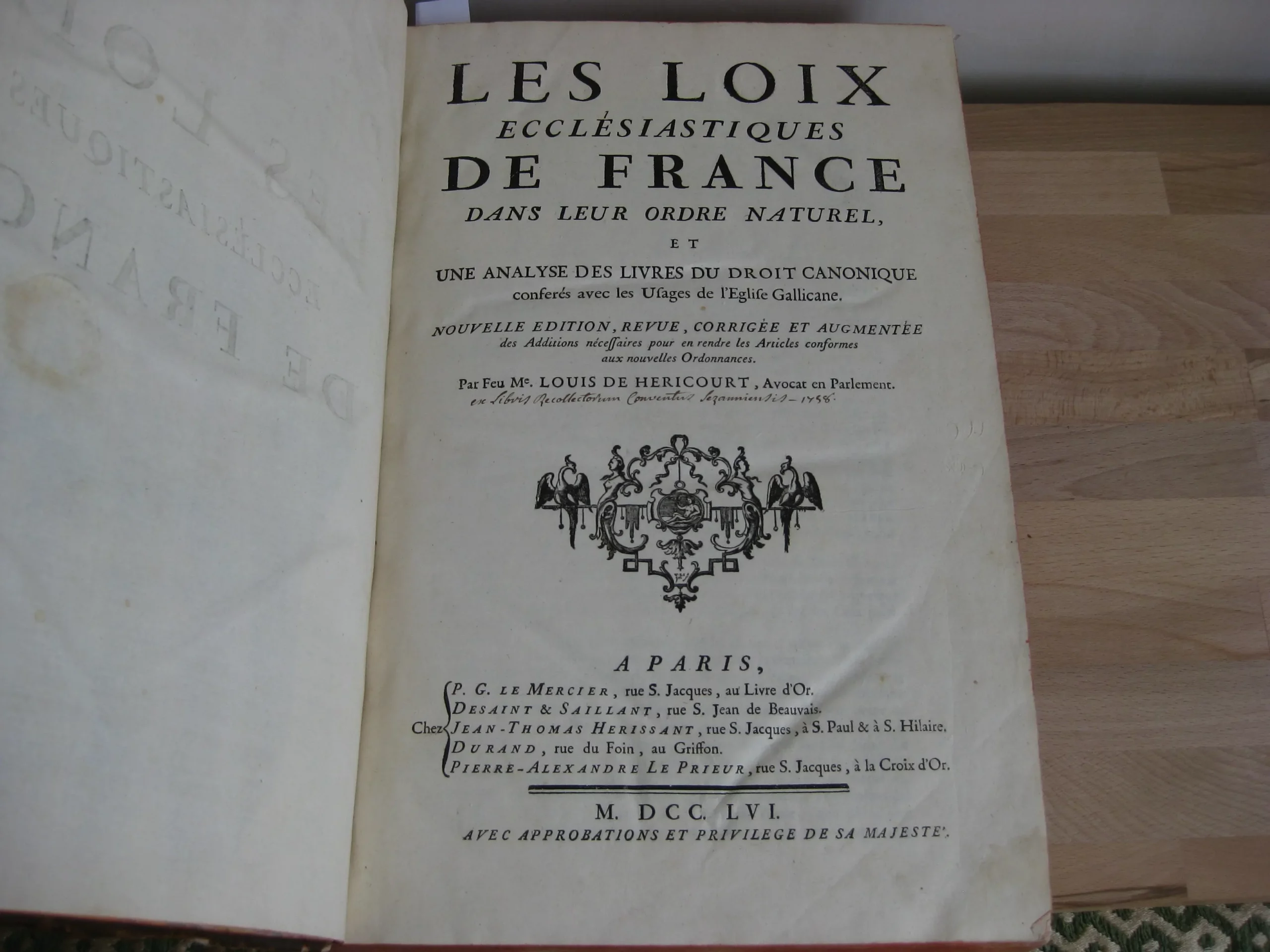 In-folio plein veau marbré, champs ornés, dos à six nerfs, pièce de titre, tranches rouges, 400 x 270, 926p. Hors table (54p.). 1756. Nouvelle édition, revue, corrigée et augmentée. Ex-libris manuscrit latin au tire des Recollets de Sézanne , 1758. Un tampon de la bibliothèque municipale de Sézanne au faux-titre et répété une fois en marge dans le texte. Comprend : Faux-titre, titre [vignette] ; Préface, Avertissement, Privilège, 8p. [entête, lettrine, cul-de-lampe] ; Table des parties, chapitres, articles contenus dans les Loix ecclésiastiques, et Table des distinctions, des causes, des questions & des titres contenus dans l’Analyse des livres du droit canonique etc ; et Table des décrétales de Grégoire IX Sexte de Boniface VIII, etc., pp.1-10 [2 culs-de-lampe]. Puis le texte [4 entêtes, 4 lettrines, 3 cul-de-lampe] ; Fin des Loix ecclésiastiques p.724. Puis Analyse du décret de Gratien conféré avec les usages de l’église Gallicane, pp. 734 à 892. [1 entête, 1 lettrine], reprise de l’ex-libris au titre en français cette fois « Bibliothèque des Recollets de Sézanne, 1758 ». Puis « Edits, ordonnances, déclarations et arrests intervenus sur les matières ecclésiastiques depuis la publication de cet ouvrage, p. 893 à fin ; ex-libris en français répété. Intérieur très frais, très propre, excepté 3 pages cornées en pied. Garde manquante ; dernière page de garde qui se détache. Reliure avec accidents : coins et champs frottés, coins émoussés ; plats frottés avec épidermures et petits manques. Mors supérieur ouvert sur trois caissons de tête et en pied sur demi-caisson de pied. Mors inférieur ouvert sur deux caissons en tête , brièvement en pied et fendu en plein. Dos avec coiffe et queue manquantes, manques en caisson de tête et queue. Exemplaire solide néanmoins. Juriste et avocat, Louis de Héricourt (1686-1752) est entré dans les ordres bénédictins puis oratoriens, après avoir été ingénieur dans l’armée de Flandre.
