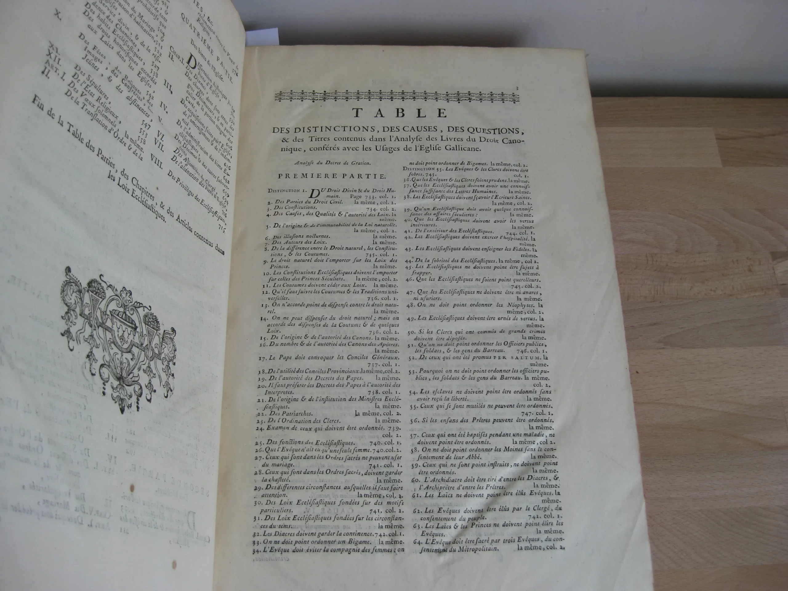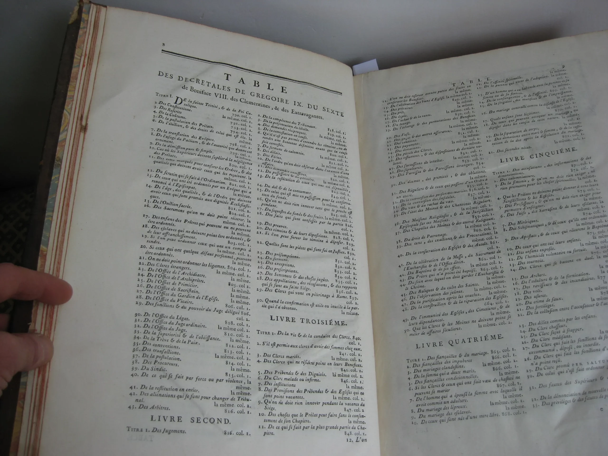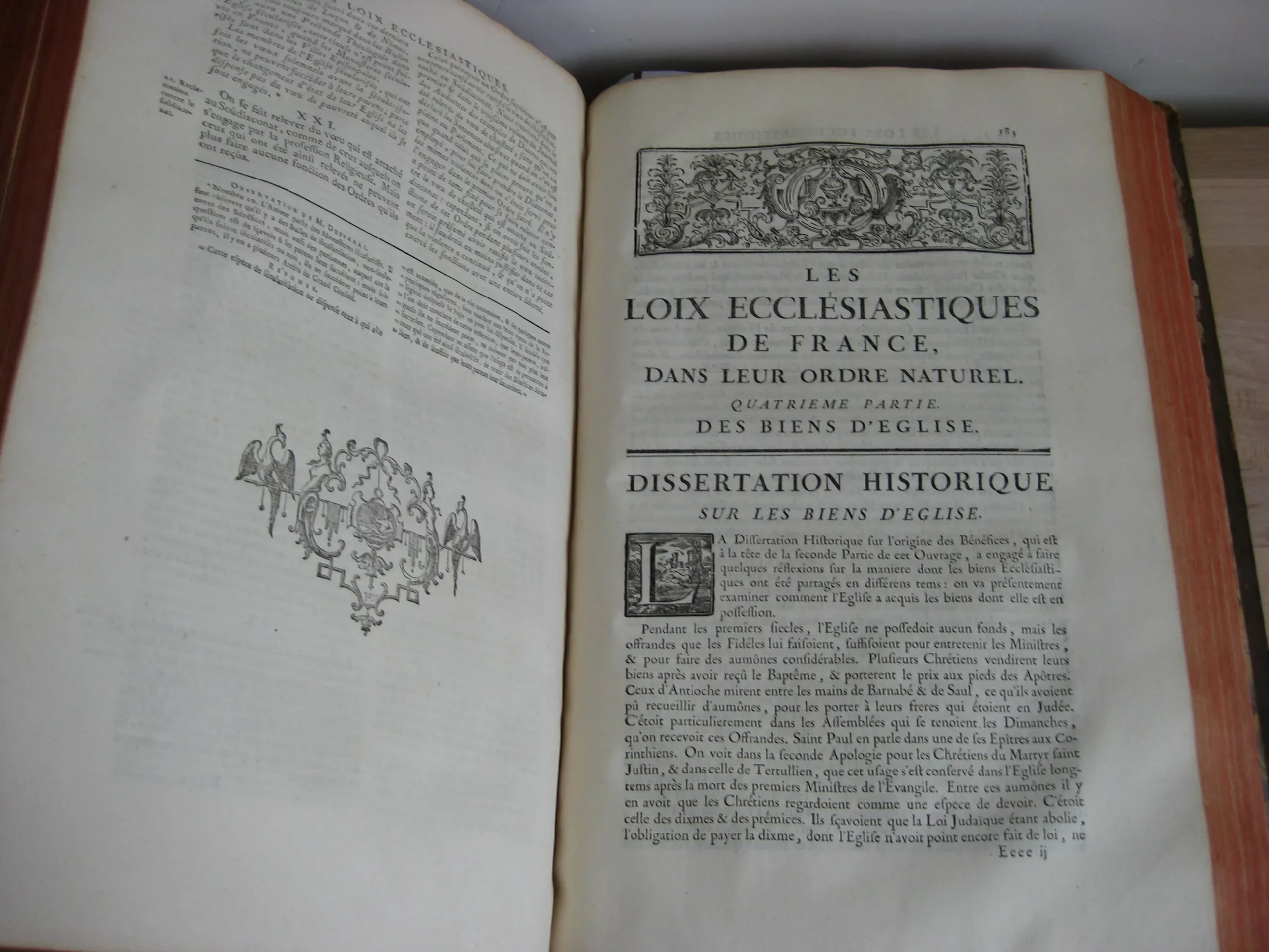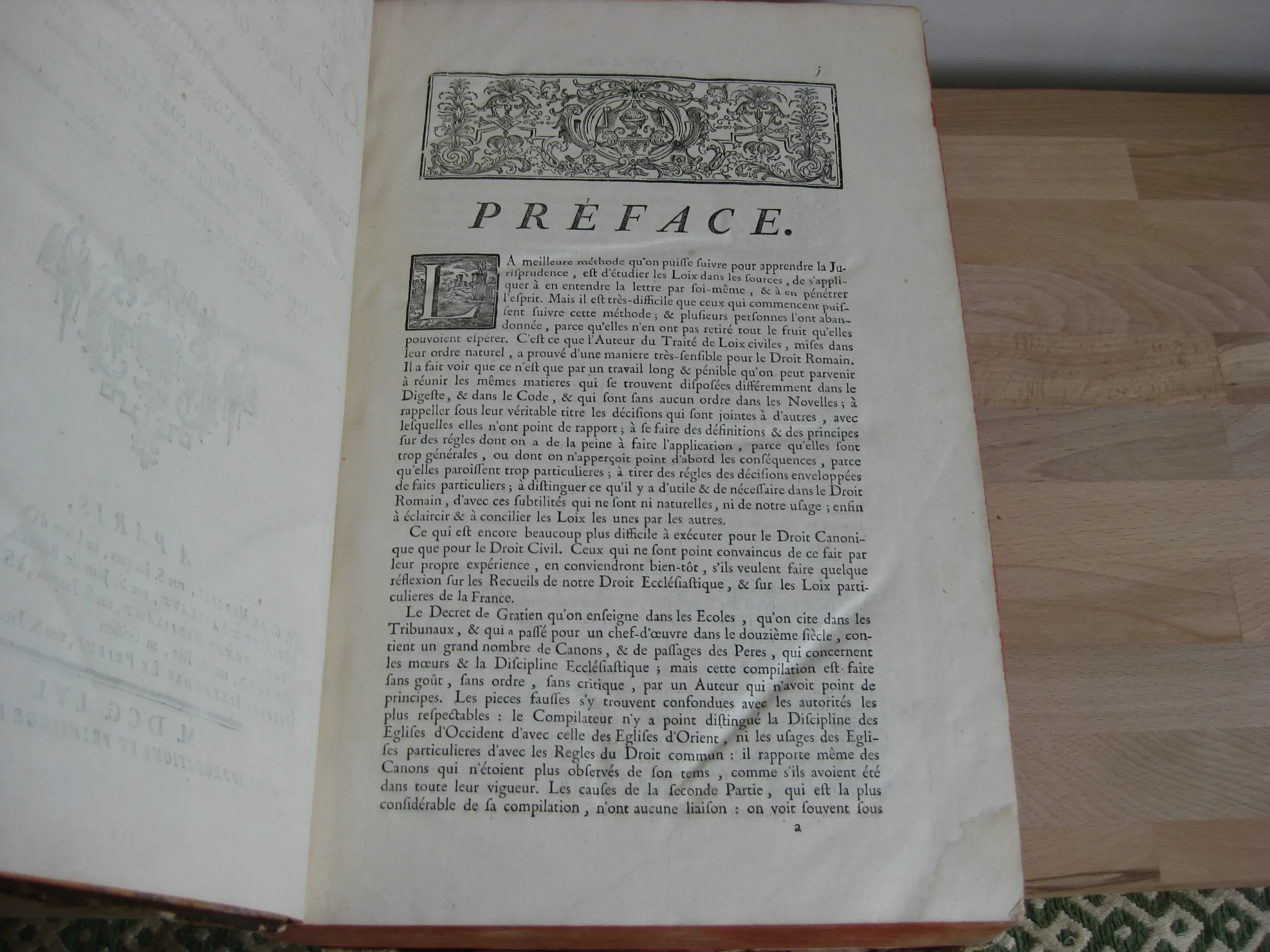 In-folio plein veau marbré, champs ornés, dos à six nerfs, pièce de titre, tranches rouges, 400 x 270, 926p. Hors table (54p.). 1756. Nouvelle édition, revue, corrigée et augmentée. Ex-libris manuscrit latin au tire des Recollets de Sézanne , 1758. Un tampon de la bibliothèque municipale de Sézanne au faux-titre et répété une fois en marge dans le texte. Comprend : Faux-titre, titre [vignette] ; Préface, Avertissement, Privilège, 8p. [entête, lettrine, cul-de-lampe] ; Table des parties, chapitres, articles contenus dans les Loix ecclésiastiques, et Table des distinctions, des causes, des questions & des titres contenus dans l’Analyse des livres du droit canonique etc ; et Table des décrétales de Grégoire IX Sexte de Boniface VIII, etc., pp.1-10 [2 culs-de-lampe]. Puis le texte [4 entêtes, 4 lettrines, 3 cul-de-lampe] ; Fin des Loix ecclésiastiques p.724. Puis Analyse du décret de Gratien conféré avec les usages de l’église Gallicane, pp. 734 à 892. [1 entête, 1 lettrine], reprise de l’ex-libris au titre en français cette fois « Bibliothèque des Recollets de Sézanne, 1758 ». Puis « Edits, ordonnances, déclarations et arrests intervenus sur les matières ecclésiastiques depuis la publication de cet ouvrage, p. 893 à fin ; ex-libris en français répété. Intérieur très frais, très propre, excepté 3 pages cornées en pied. Garde manquante ; dernière page de garde qui se détache. Reliure avec accidents : coins et champs frottés, coins émoussés ; plats frottés avec épidermures et petits manques. Mors supérieur ouvert sur trois caissons de tête et en pied sur demi-caisson de pied. Mors inférieur ouvert sur deux caissons en tête , brièvement en pied et fendu en plein. Dos avec coiffe et queue manquantes, manques en caisson de tête et queue. Exemplaire solide néanmoins. Juriste et avocat, Louis de Héricourt (1686-1752) est entré dans les ordres bénédictins puis oratoriens, après avoir été ingénieur dans l’armée de Flandre.