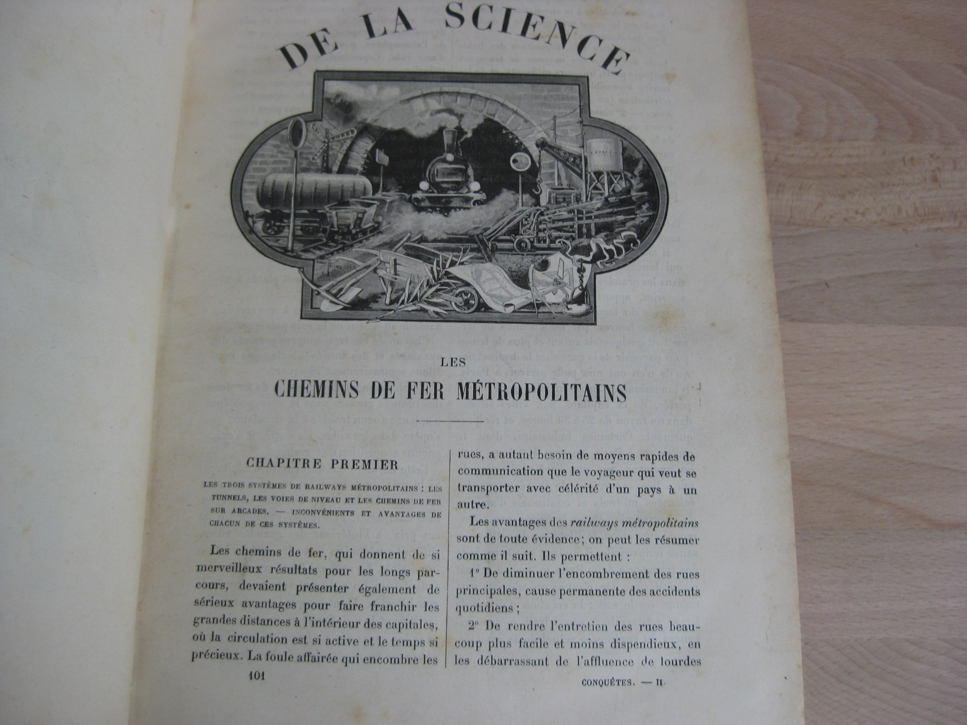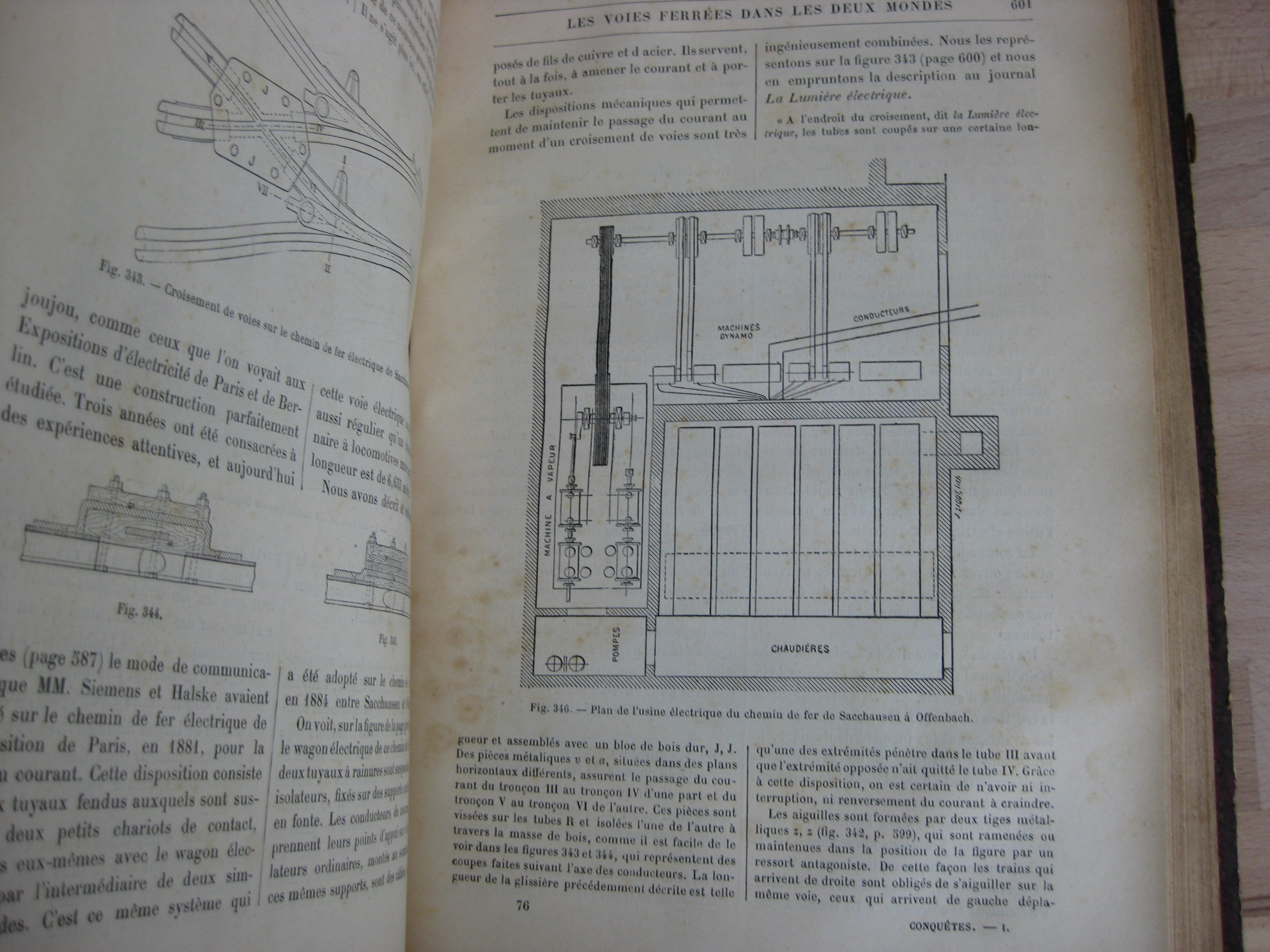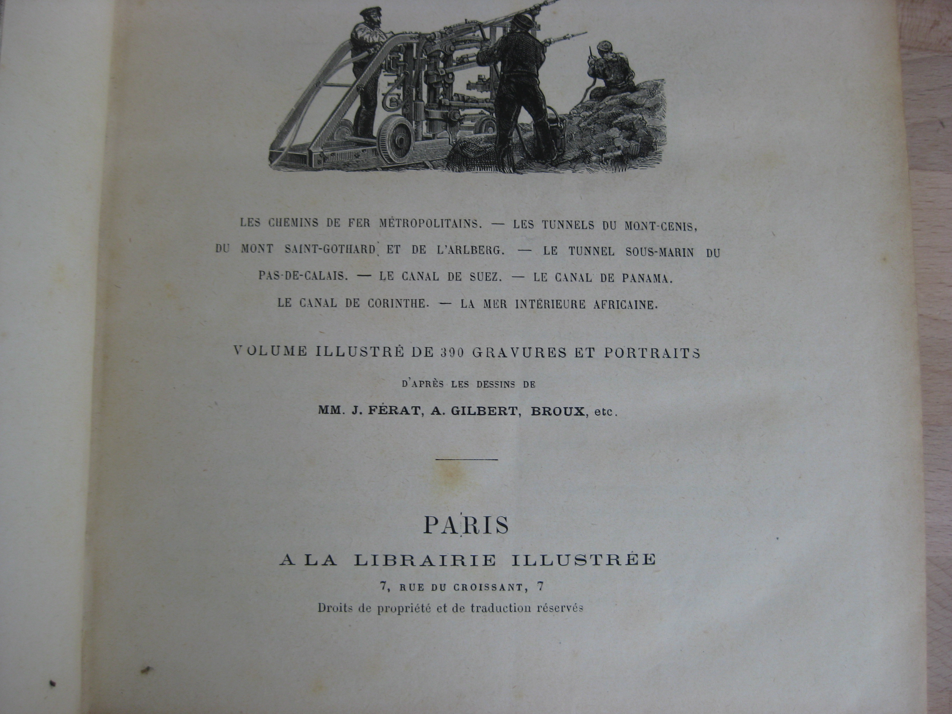 T2, Les chemins de fer, 399 gravures et portraits, comprend : LES CHEMINS DE FER METROPOLITAINS – LES TUNNELS DU MONT-CENIS, DU MONT SAINT-GOTHARD ET DE L’ARLBERG – LE TUNNEL SOUS-MARIN DU PAS-DE-CALAIS – LE CANAL DE SUEZ – LE CANAL DE PANAMA – LE CANAL DE CORINTHE – LA MER INTERIEURE AFRICAINE. Intérieurs propres et intègres. Des frottements et épidermures aux plats, coins et champs. Demi-basane avec épidermures et griffes et mais en bon état. Bons exemplaires bien ferme.