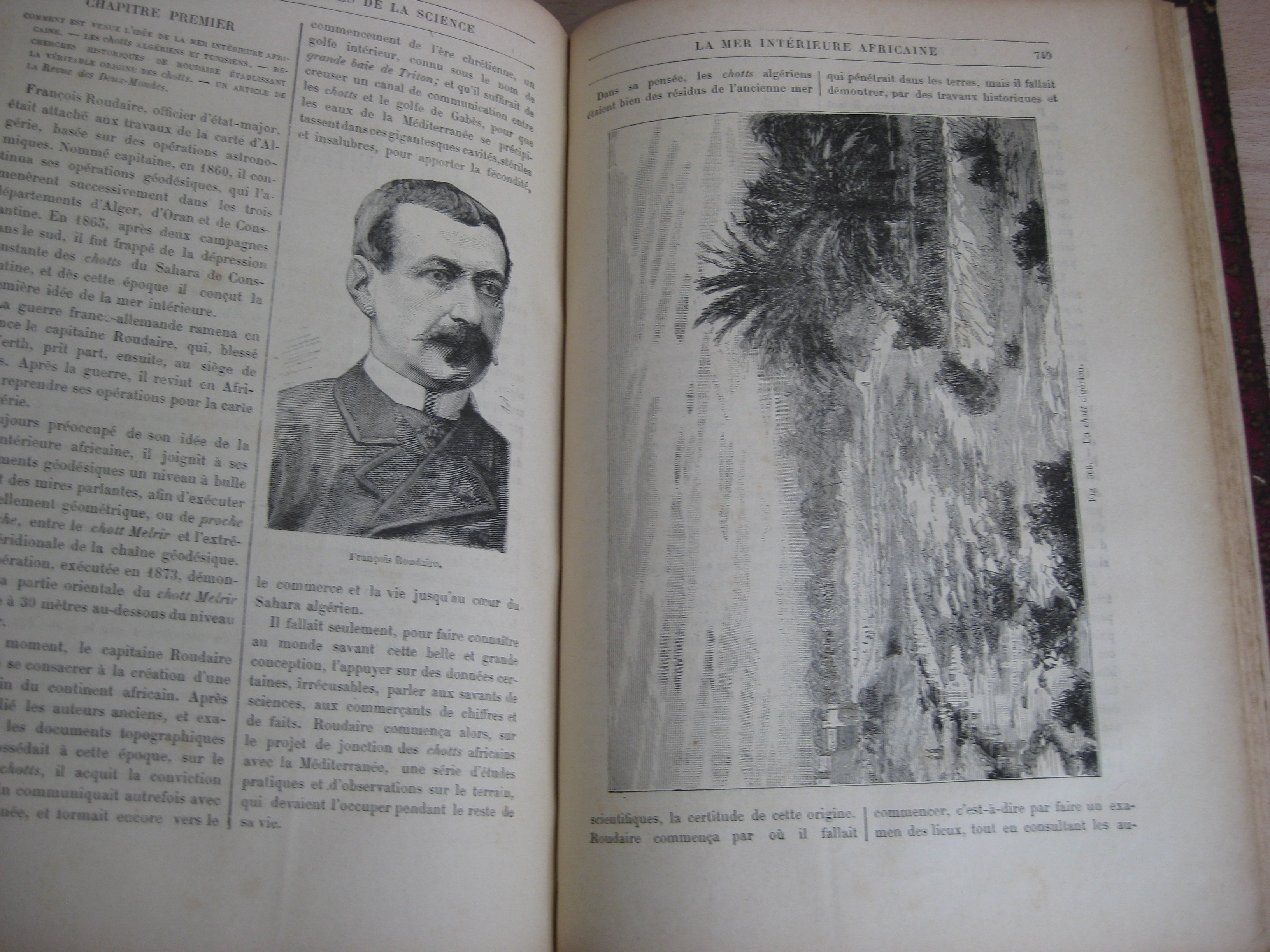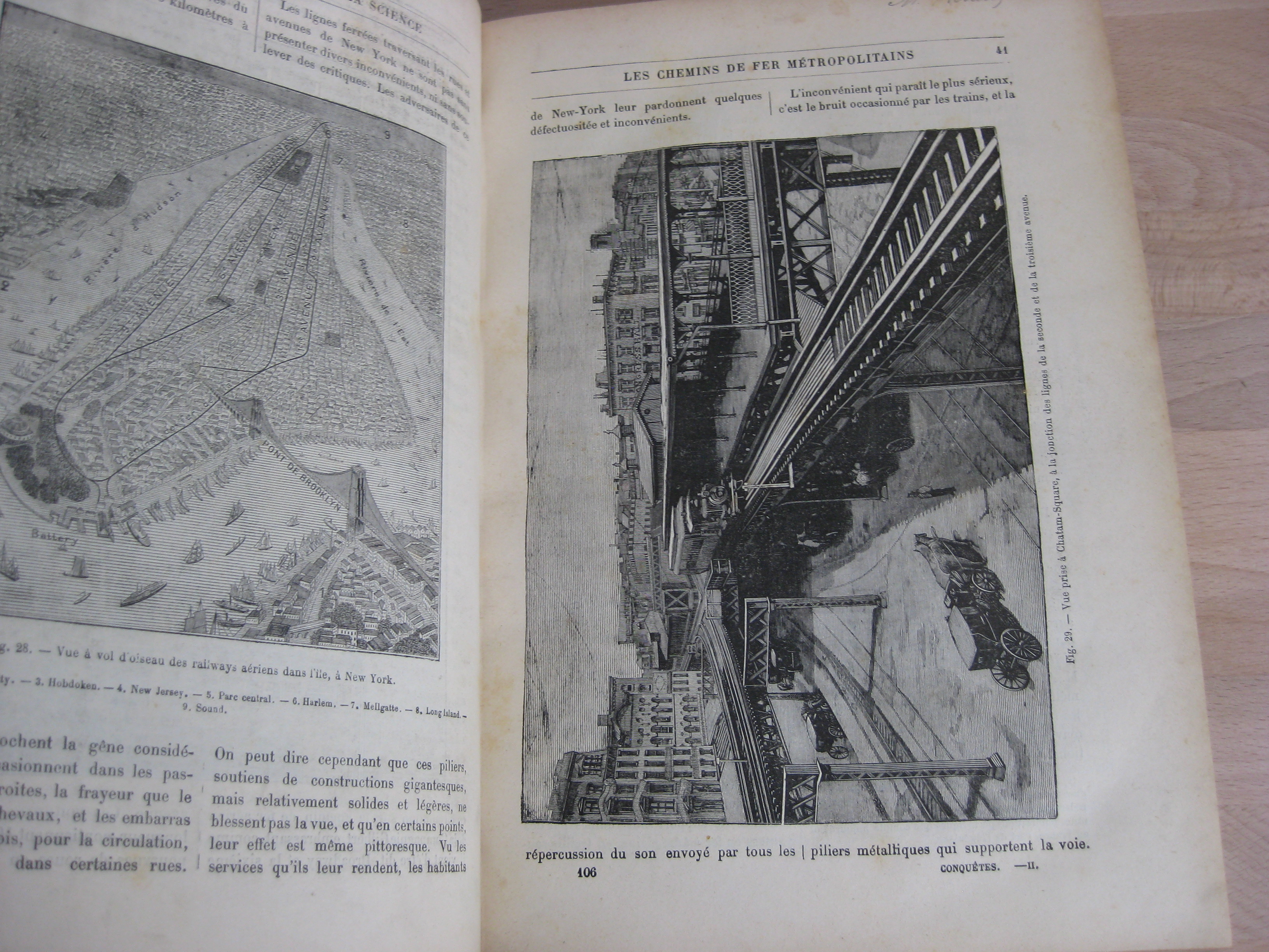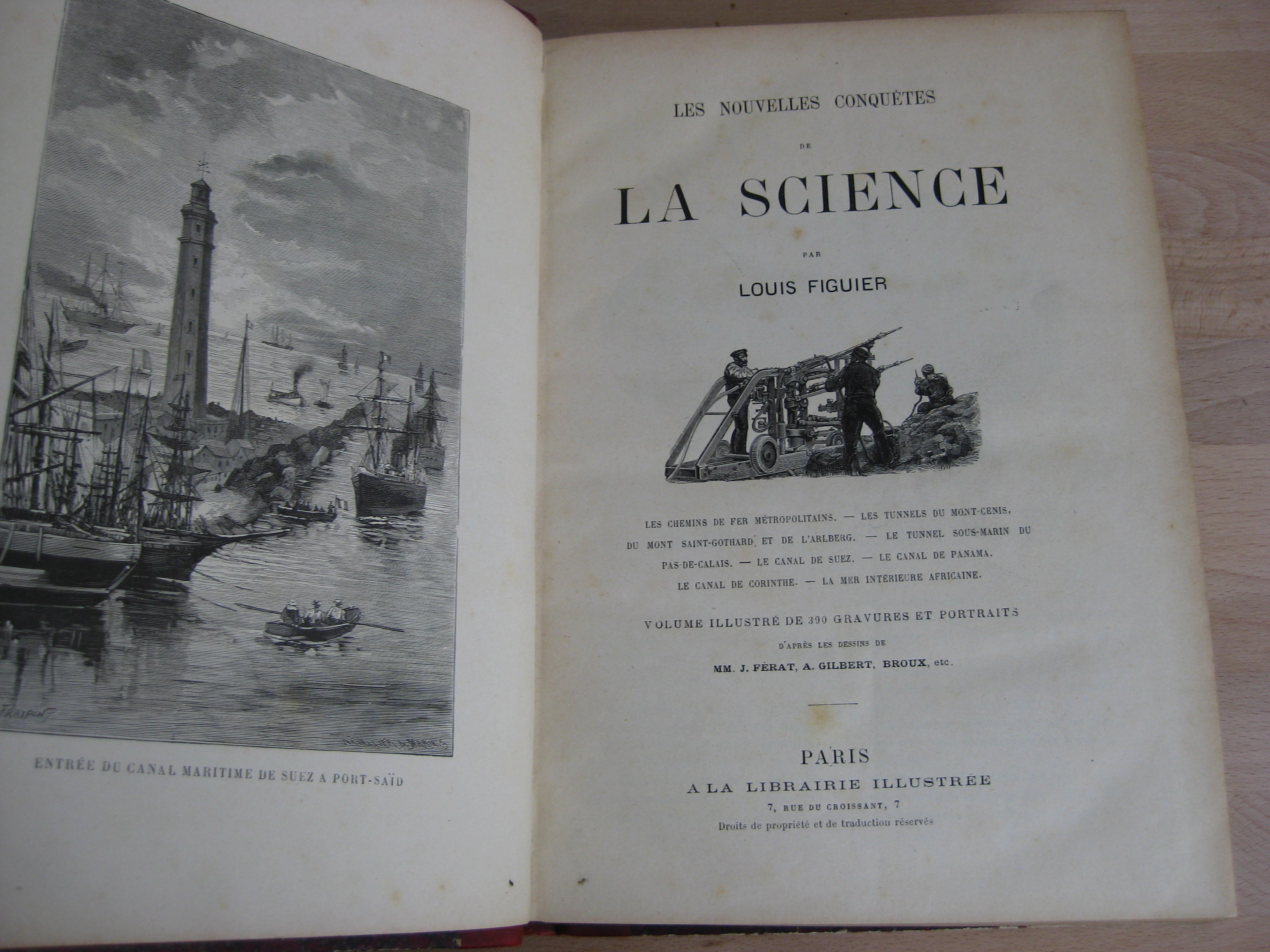 T2, Les chemins de fer, 399 gravures et portraits, comprend : LES CHEMINS DE FER METROPOLITAINS – LES TUNNELS DU MONT-CENIS, DU MONT SAINT-GOTHARD ET DE L’ARLBERG – LE TUNNEL SOUS-MARIN DU PAS-DE-CALAIS – LE CANAL DE SUEZ – LE CANAL DE PANAMA – LE CANAL DE CORINTHE – LA MER INTERIEURE AFRICAINE. Intérieurs propres et intègres. Des frottements et épidermures aux plats, coins et champs. Demi-basane avec épidermures et griffes et mais en bon état. Bons exemplaires bien ferme.
