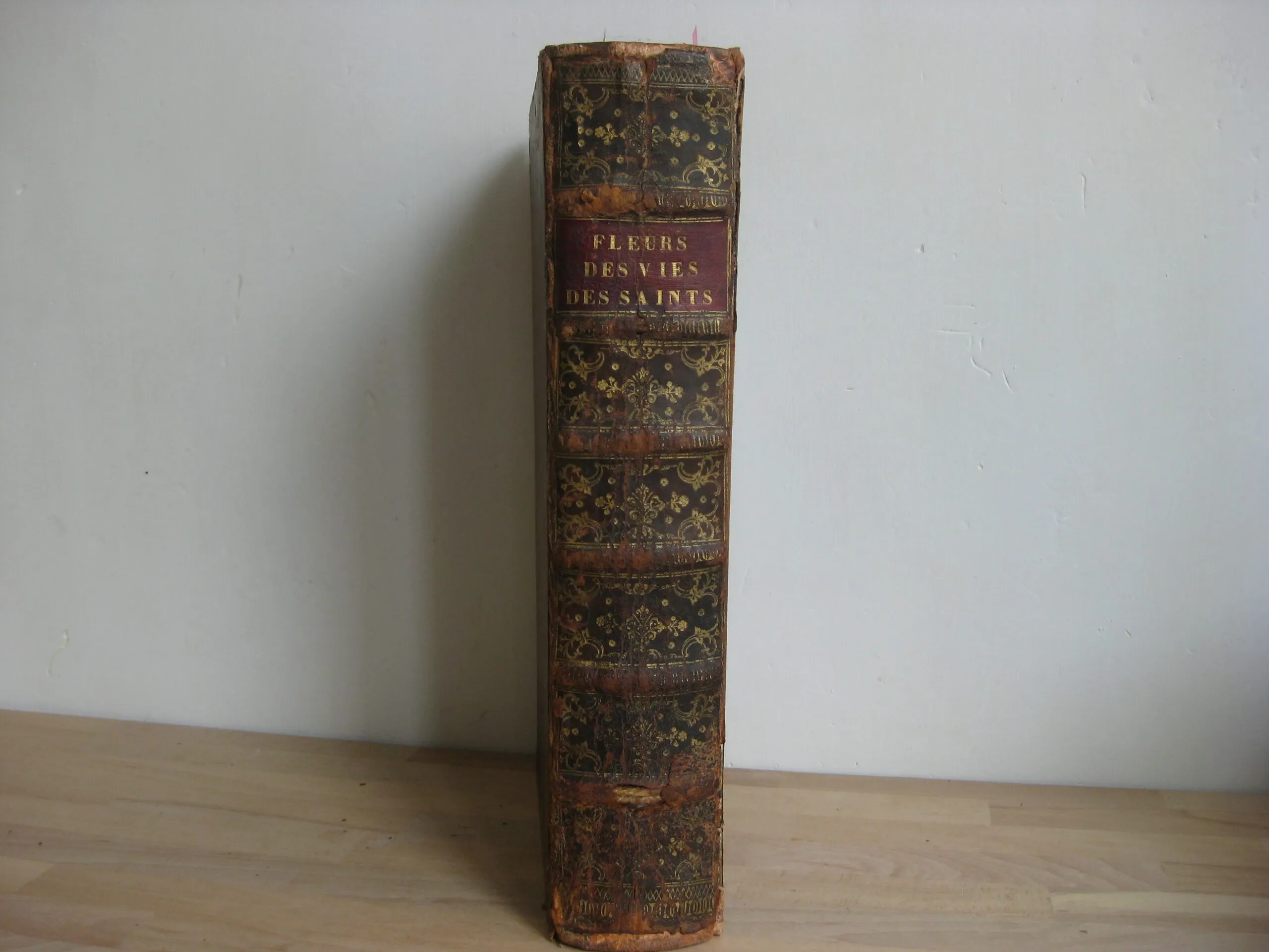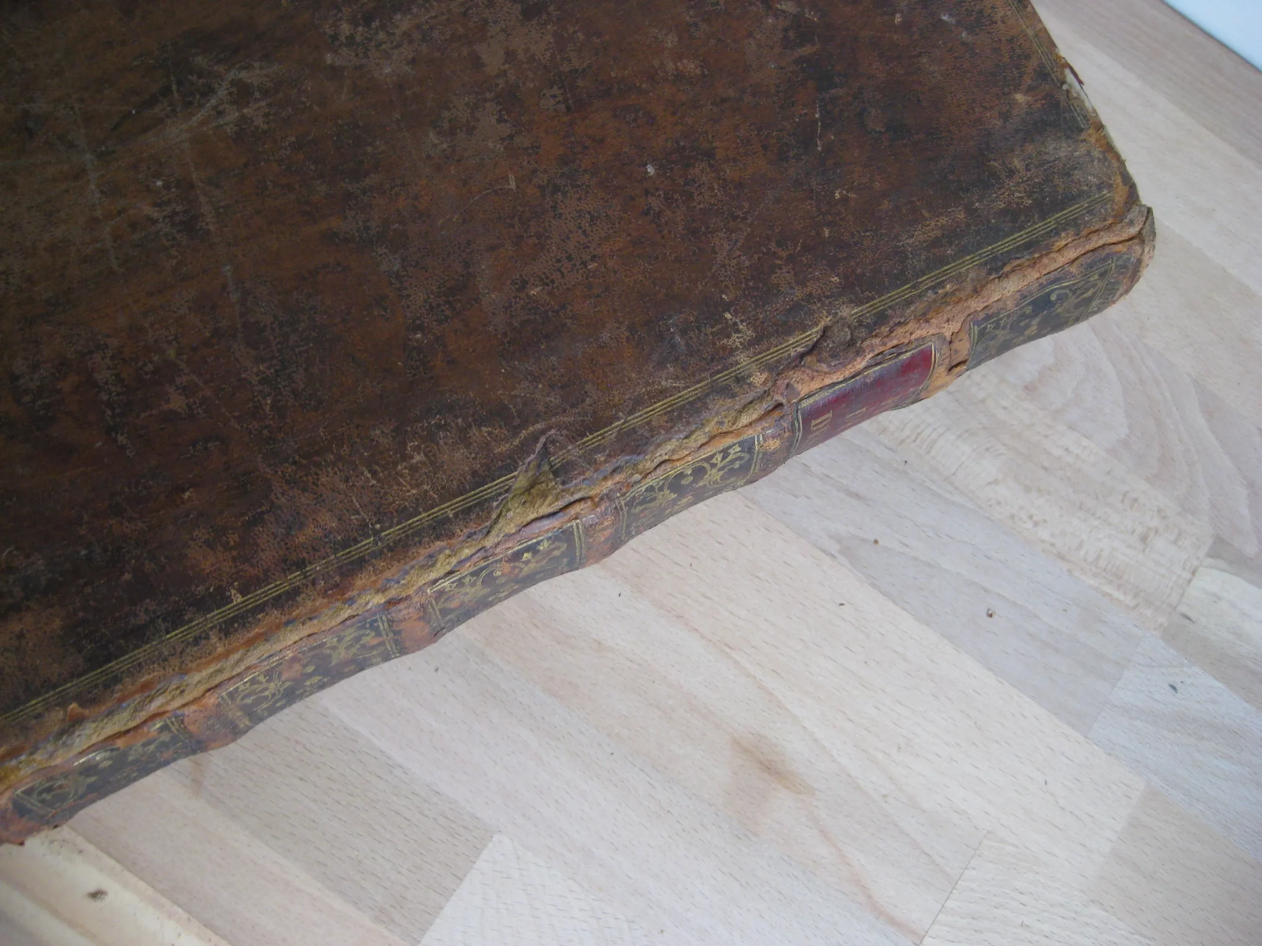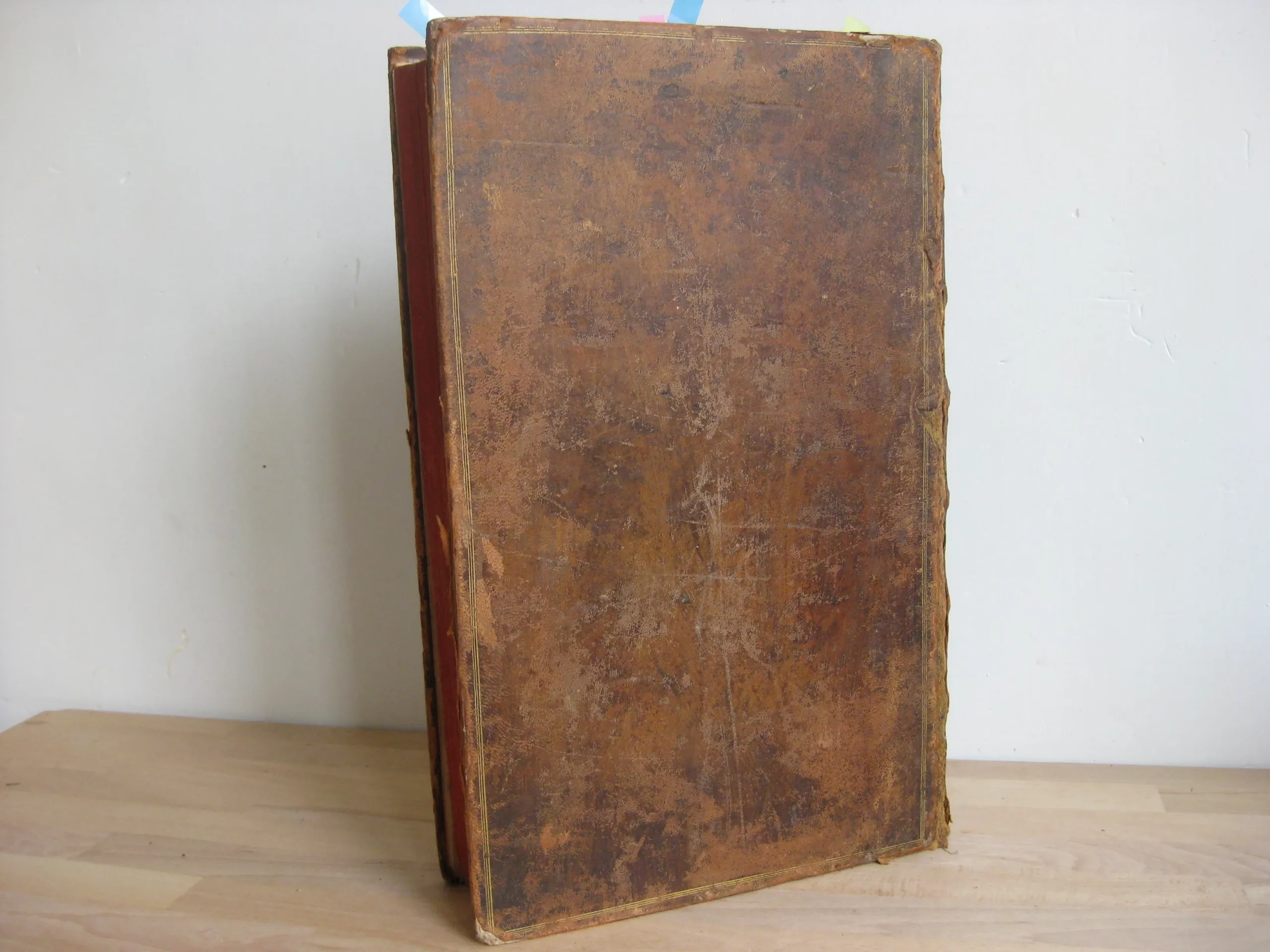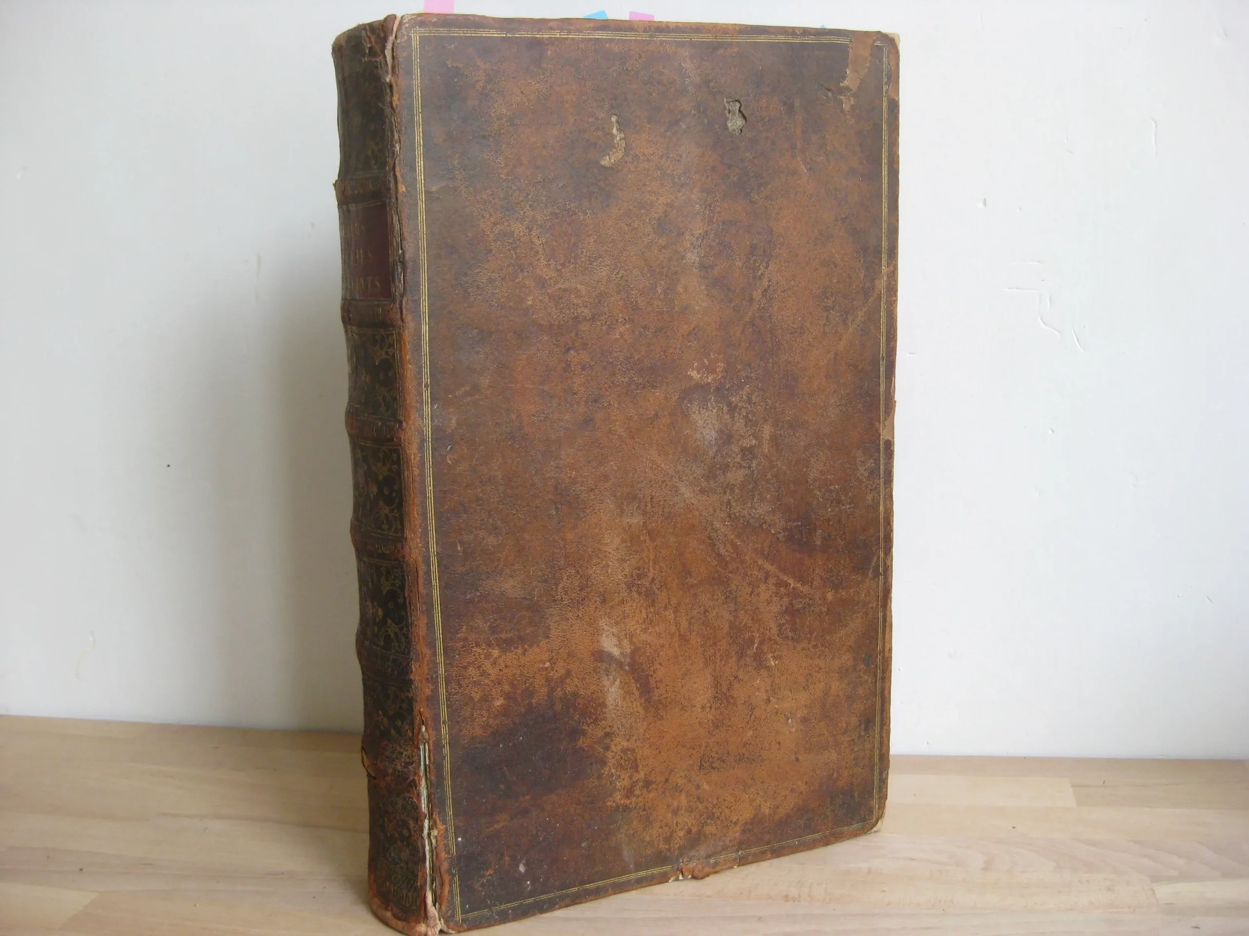 Intérieur propre, rousseurs régulières et plutôt marginales, quelques petites cornes, une déchirure en marge sans manque, mouillures marginales. Coins et champs frottés, mais bons. Plats frottés avec griffes et épidemrures, pîed de plat supérieur cogné, avec un petit manque de cuir, travail de vers en tête de plat supérieur, Mors frottés, épidermures, mors supérieur fendu sur deux nerfs en tête et un nerfs et demi en pied. Dos frotté épidermures, queue manquante, deux nerfs avec manque, coiffe en partie manquante, un manque en caisson de tête.