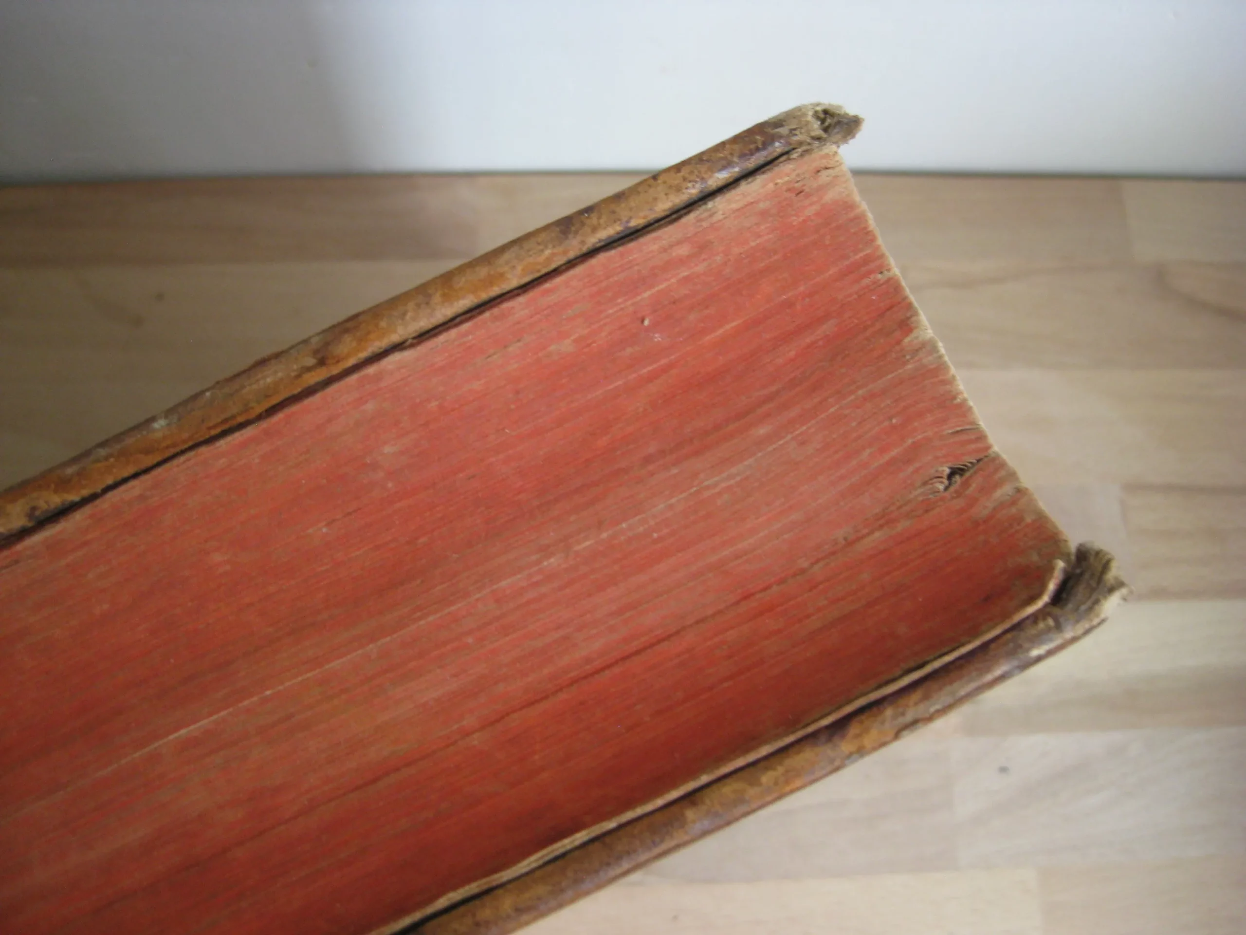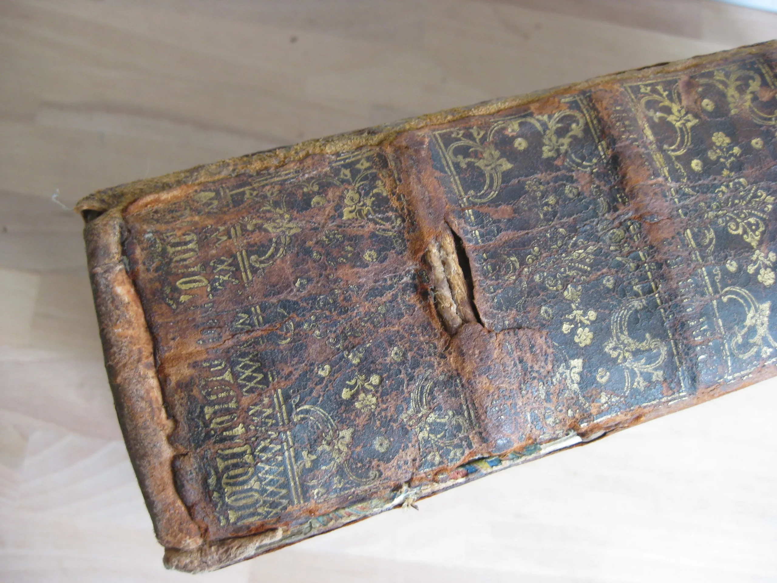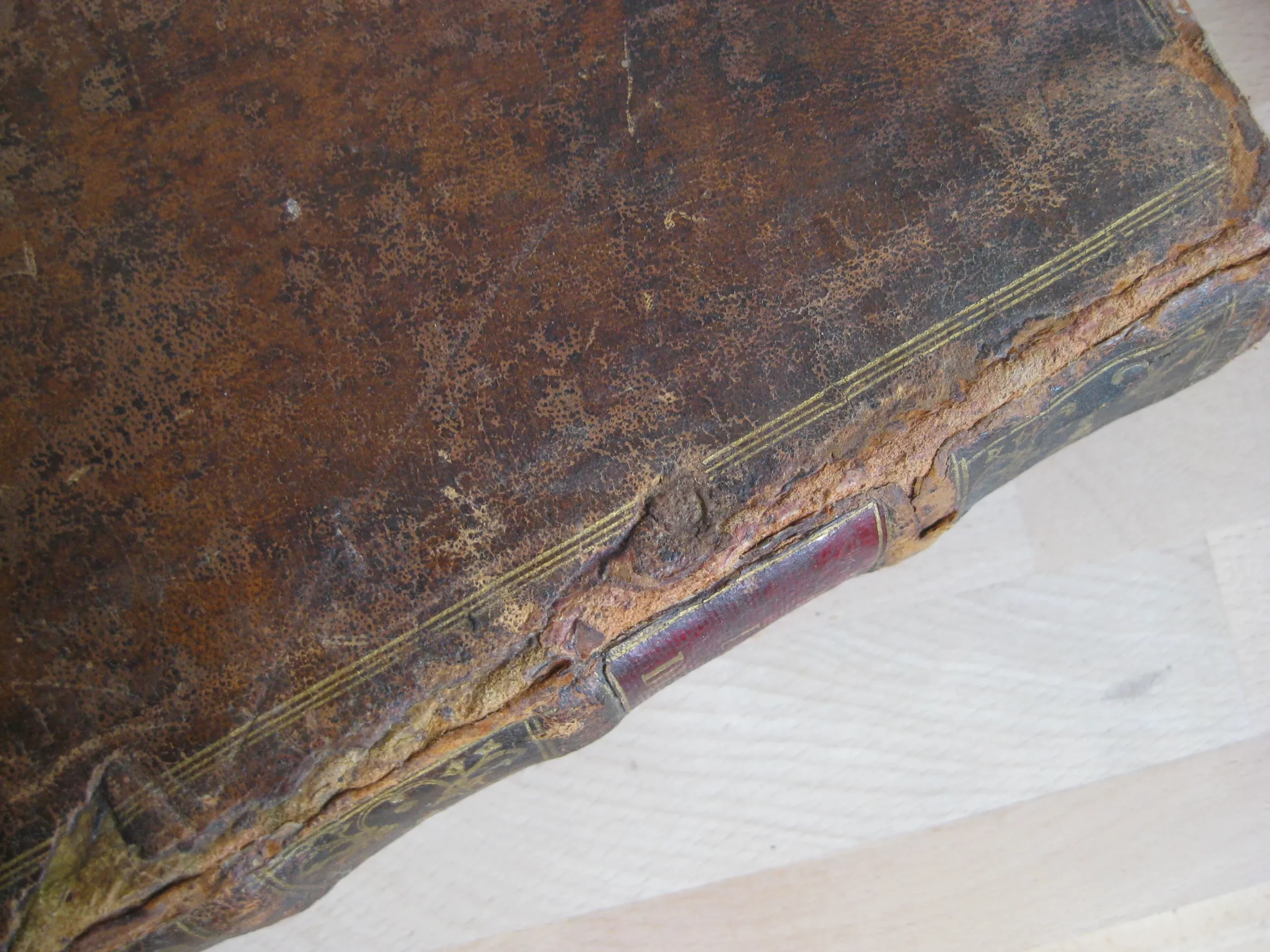 Intérieur propre, rousseurs régulières et plutôt marginales, quelques petites cornes, une déchirure en marge sans manque, mouillures marginales. Coins et champs frottés, mais bons. Plats frottés avec griffes et épidemrures, pîed de plat supérieur cogné, avec un petit manque de cuir, travail de vers en tête de plat supérieur, Mors frottés, épidermures, mors supérieur fendu sur deux nerfs en tête et un nerfs et demi en pied. Dos frotté épidermures, queue manquante, deux nerfs avec manque, coiffe en partie manquante, un manque en caisson de tête.