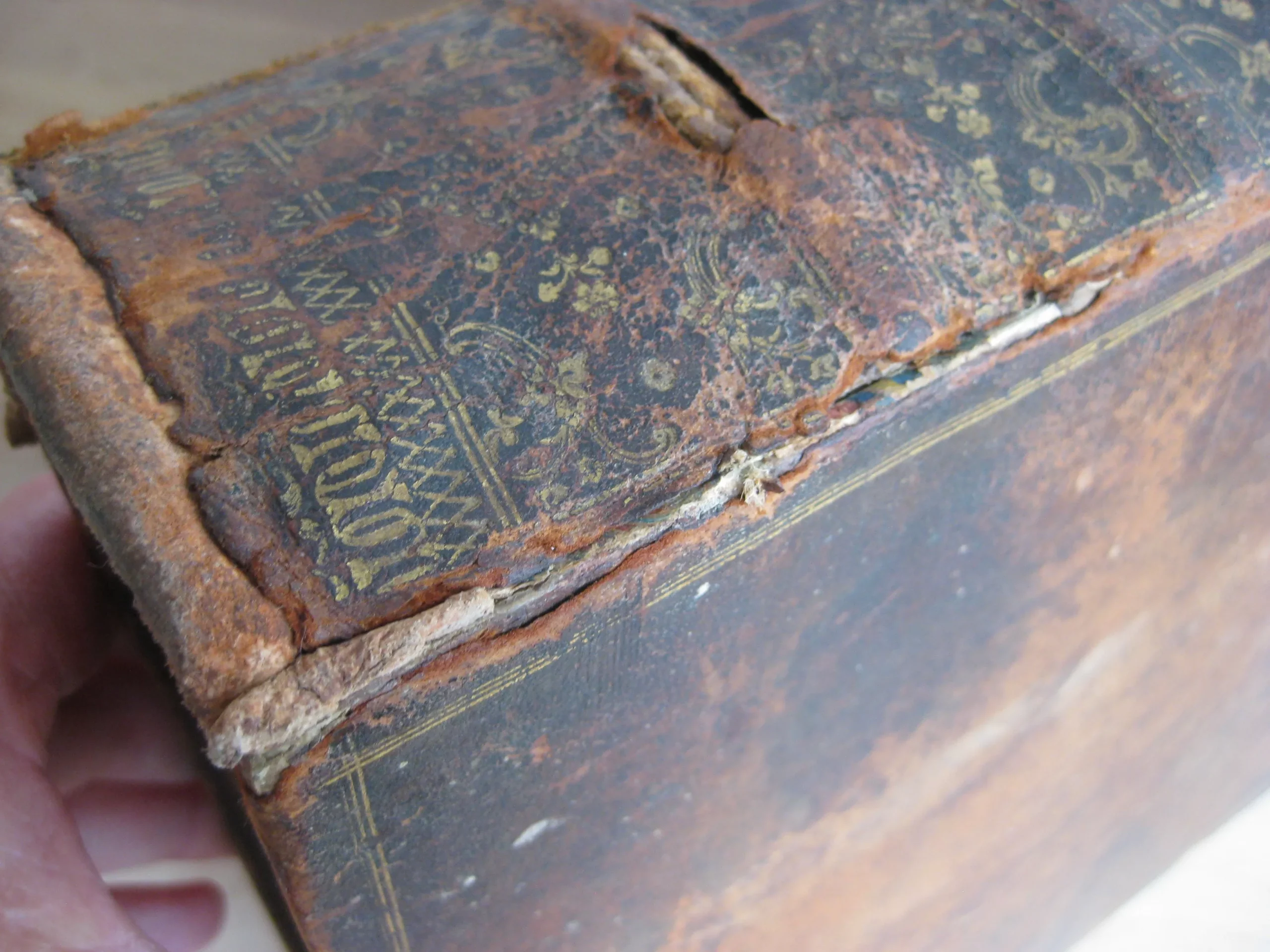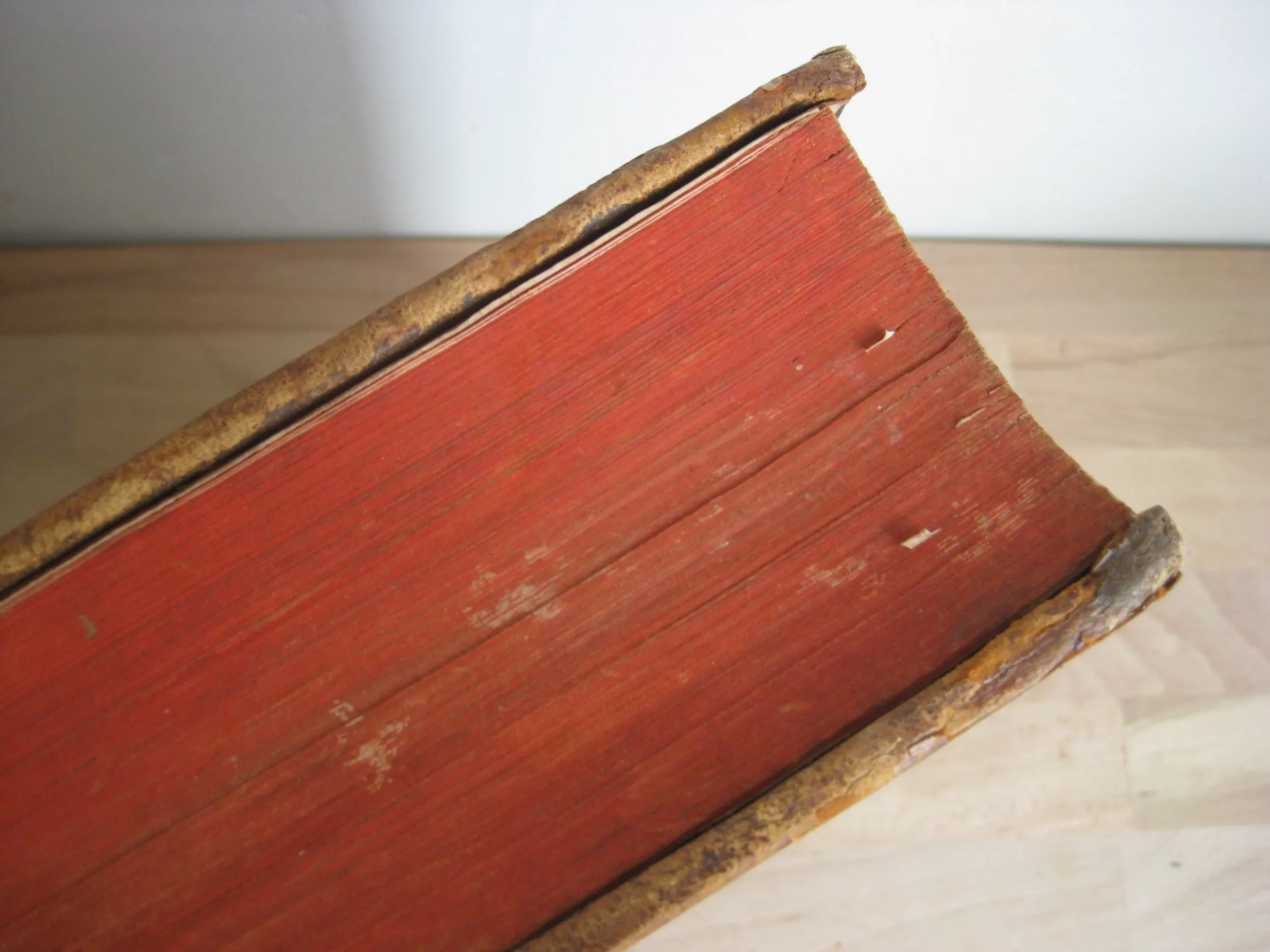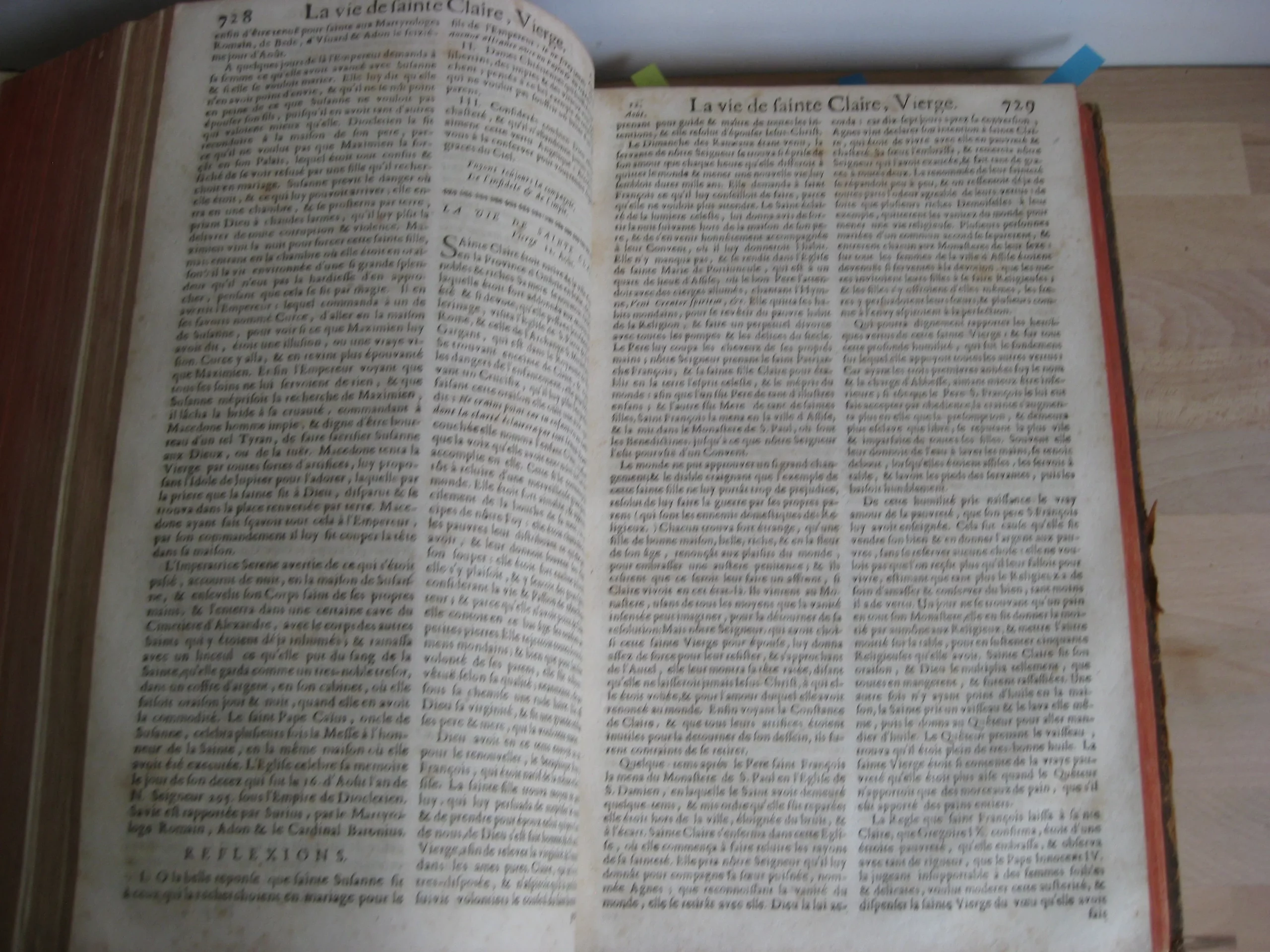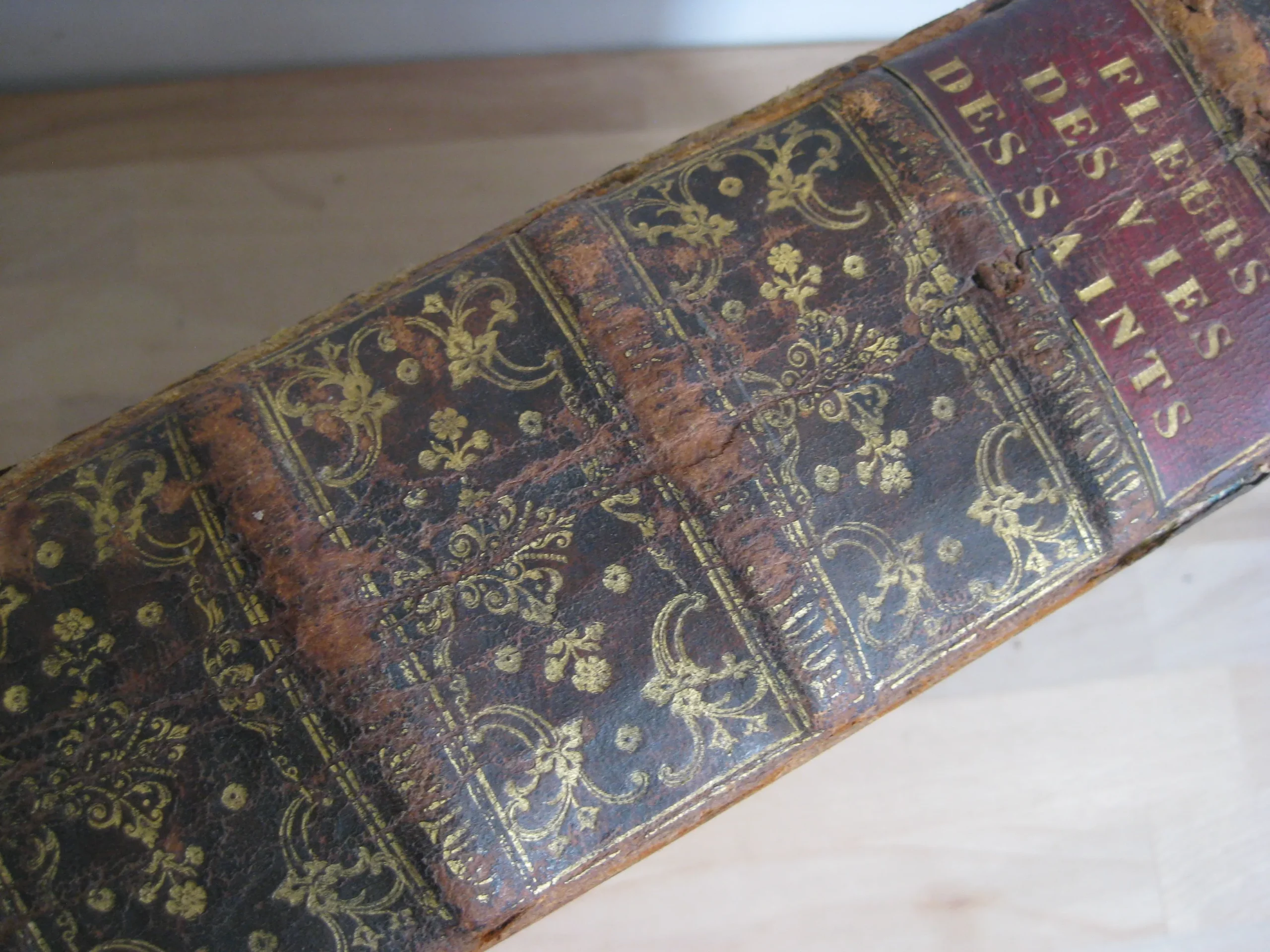 Intérieur propre, rousseurs régulières et plutôt marginales, quelques petites cornes, une déchirure en marge sans manque, mouillures marginales. Coins et champs frottés, mais bons. Plats frottés avec griffes et épidemrures, pîed de plat supérieur cogné, avec un petit manque de cuir, travail de vers en tête de plat supérieur, Mors frottés, épidermures, mors supérieur fendu sur deux nerfs en tête et un nerfs et demi en pied. Dos frotté épidermures, queue manquante, deux nerfs avec manque, coiffe en partie manquante, un manque en caisson de tête.