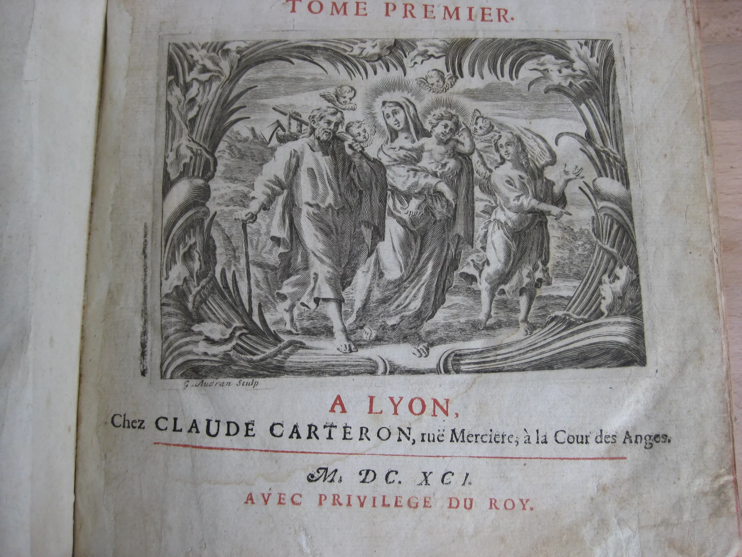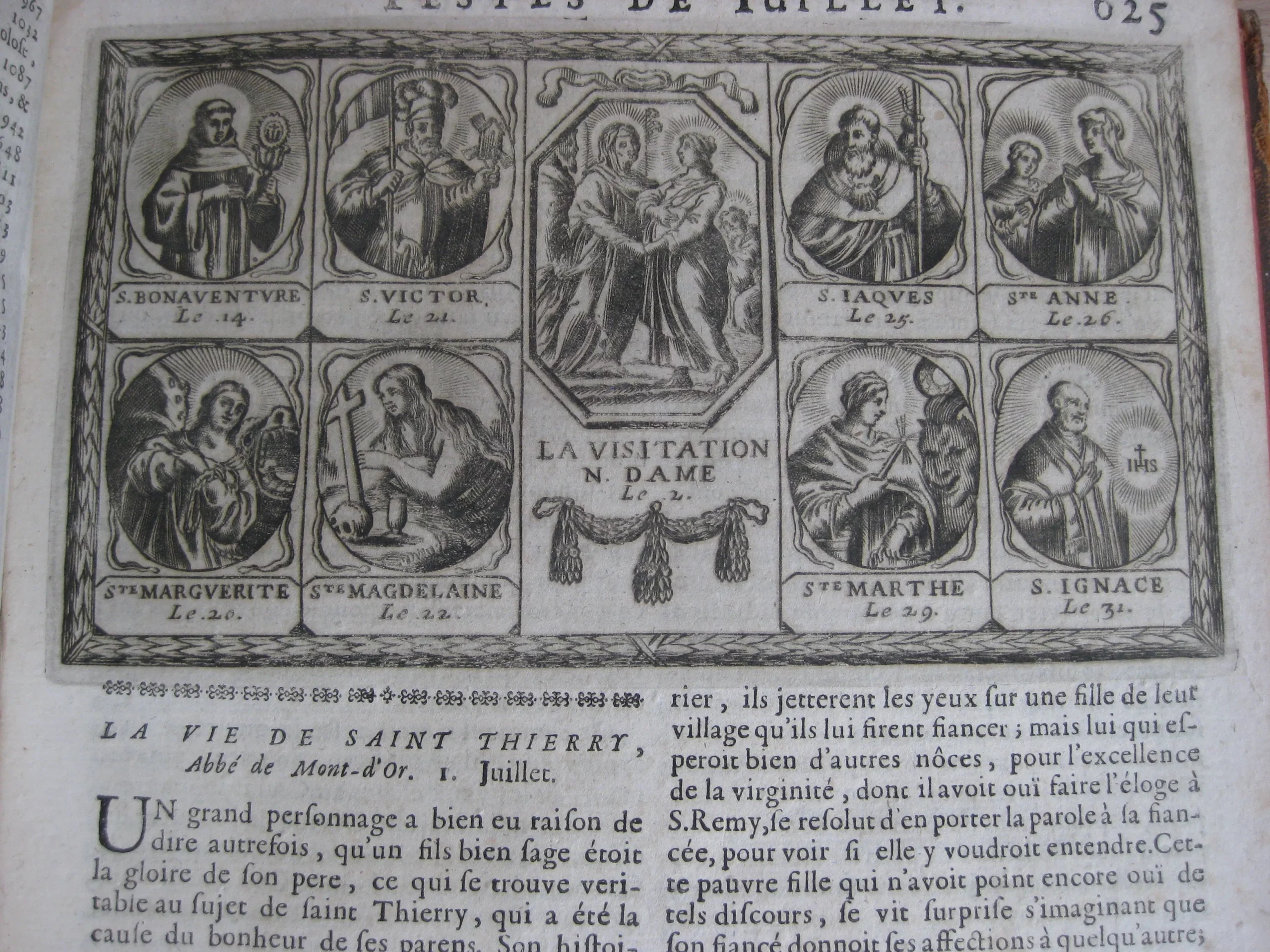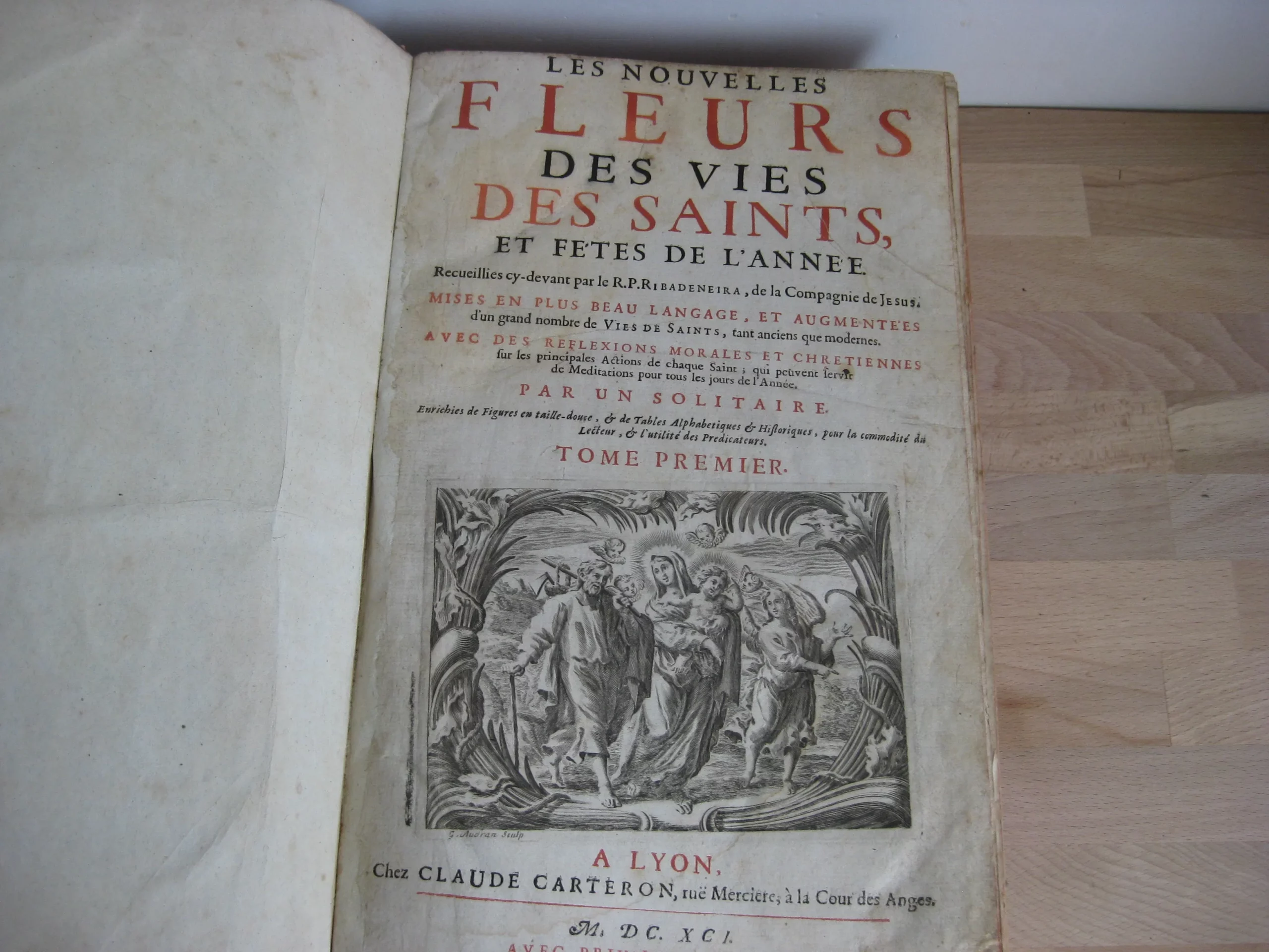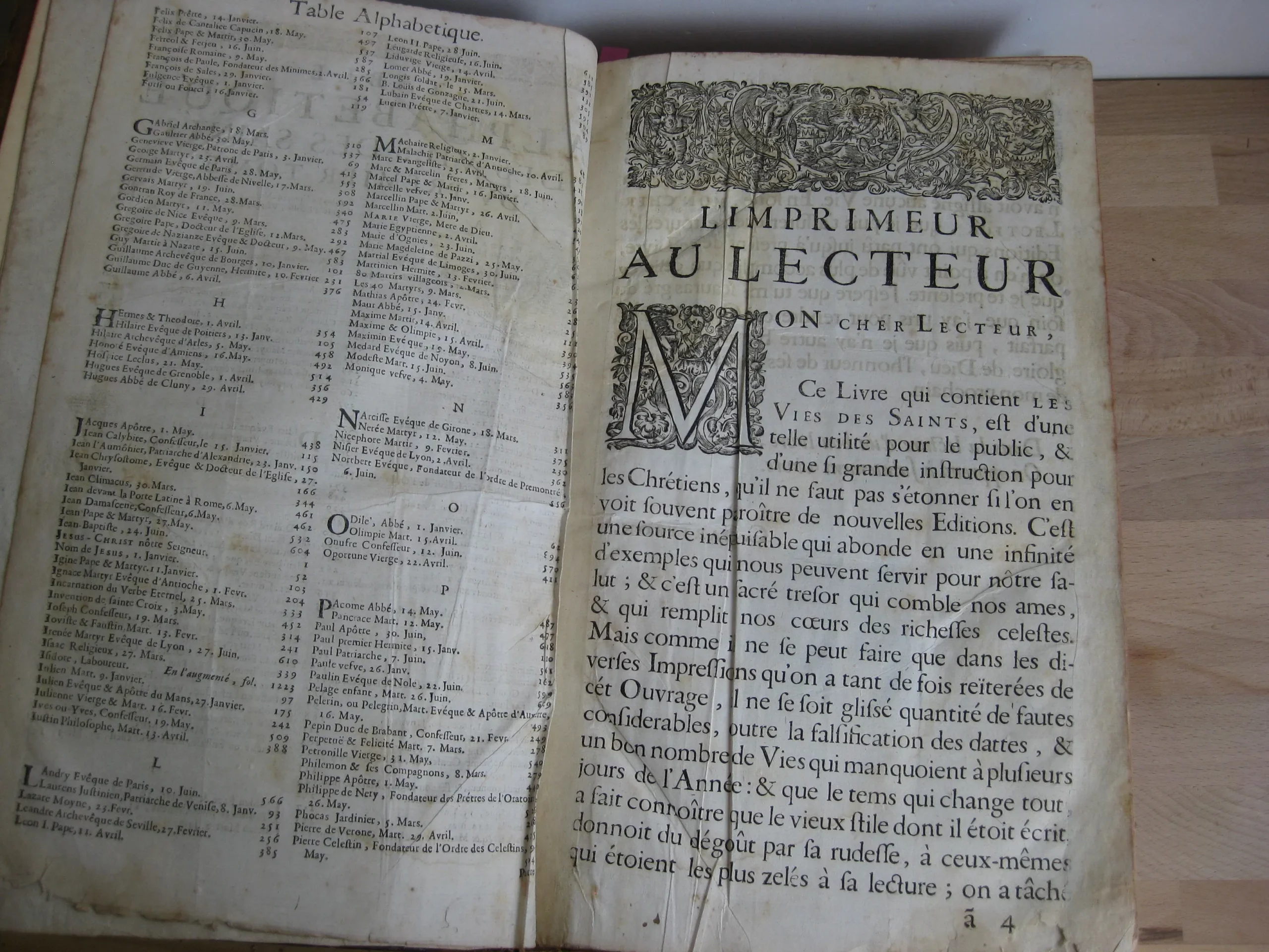 Comprend : table alphabétique, adresse au lecteur, privilège, 6p. [L’adresse au lecteur est insérée entre les pages de la table, avec un bel entête et une lettrine gravés]. Puis le texte du tome premier, 624p. entête et lettrine gravés, et 6 gravures, une pour chaque mois, représentant chacune 8 saints en vignettes encadrant une scène christique.