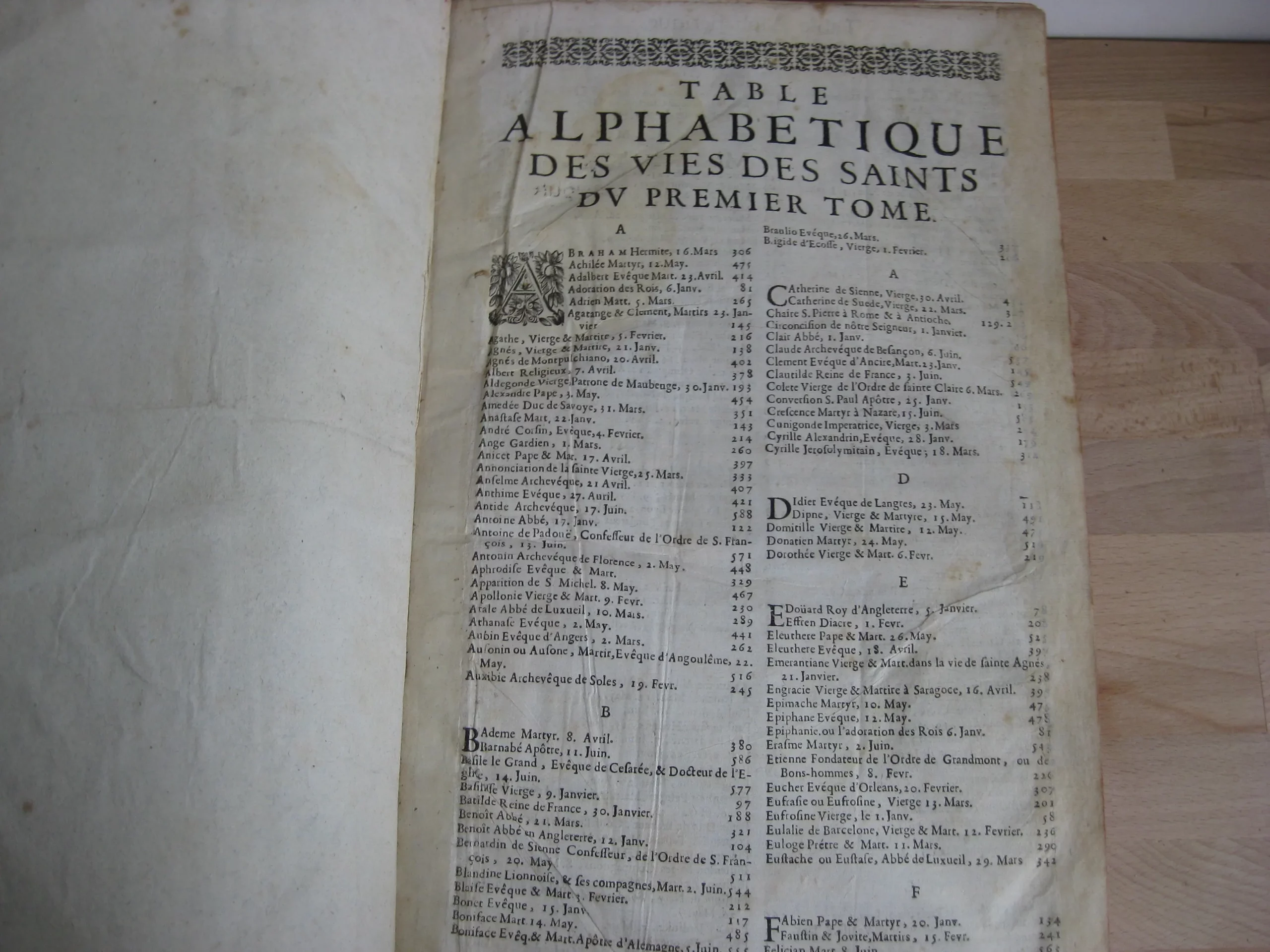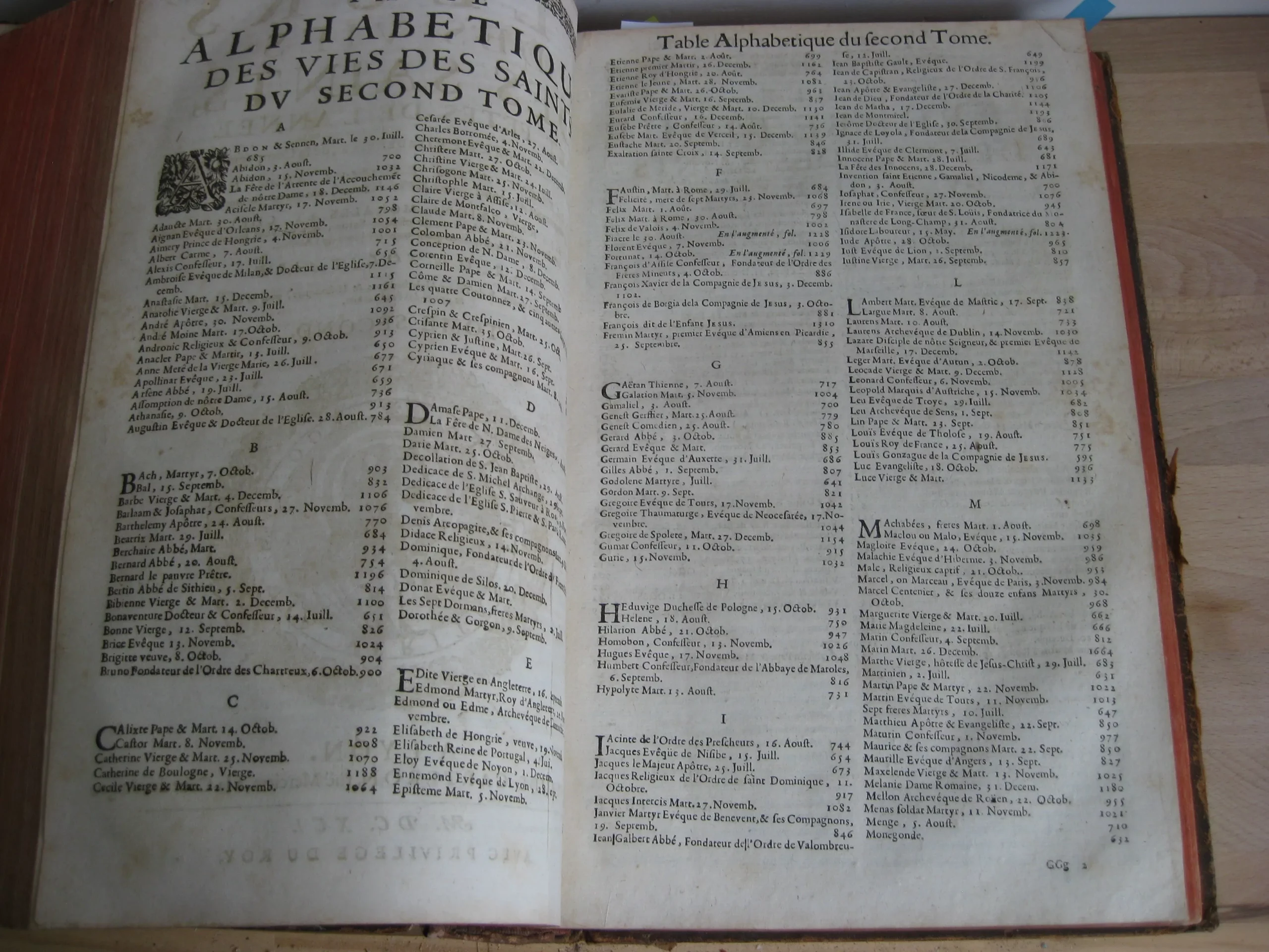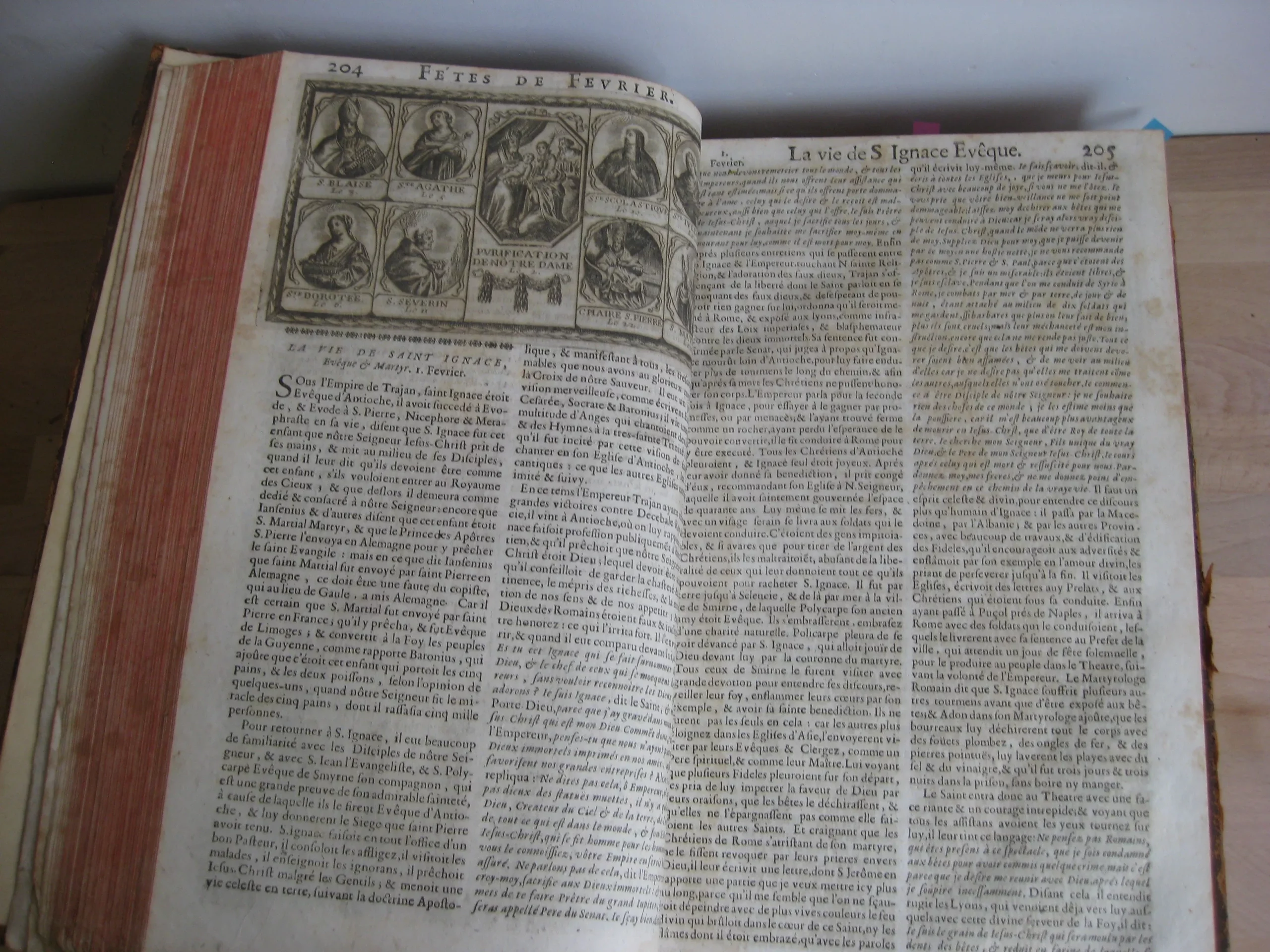 Comprend : table alphabétique, adresse au lecteur, privilège, 6p. [L’adresse au lecteur est insérée entre les pages de la table, avec un bel entête et une lettrine gravés]. Puis le texte du tome premier, 624p. entête et lettrine gravés, et 6 gravures, une pour chaque mois, représentant chacune 8 saints en vignettes encadrant une scène christique.