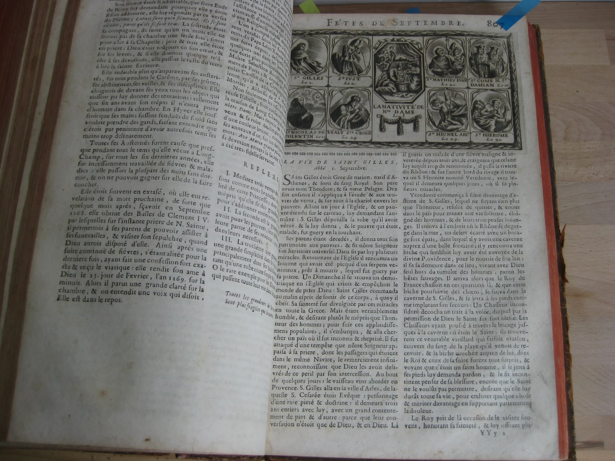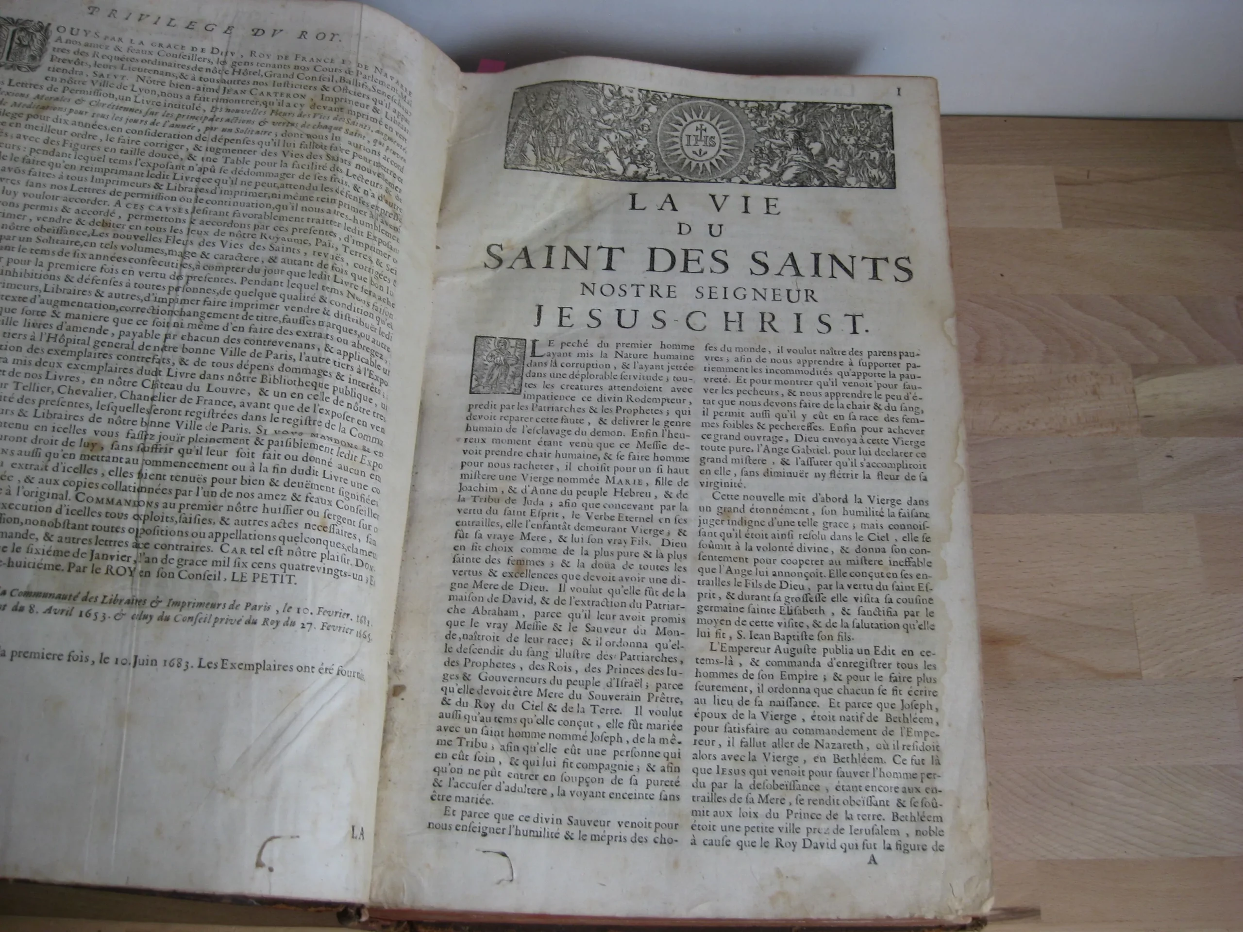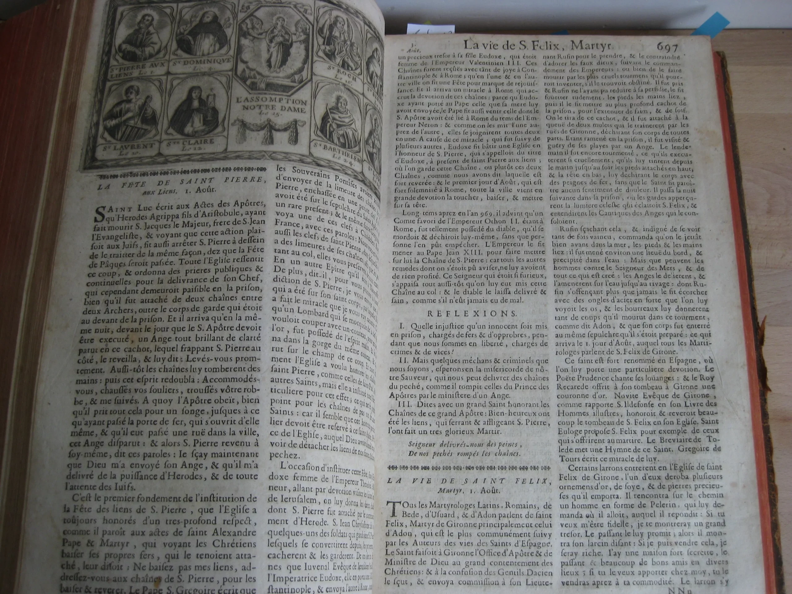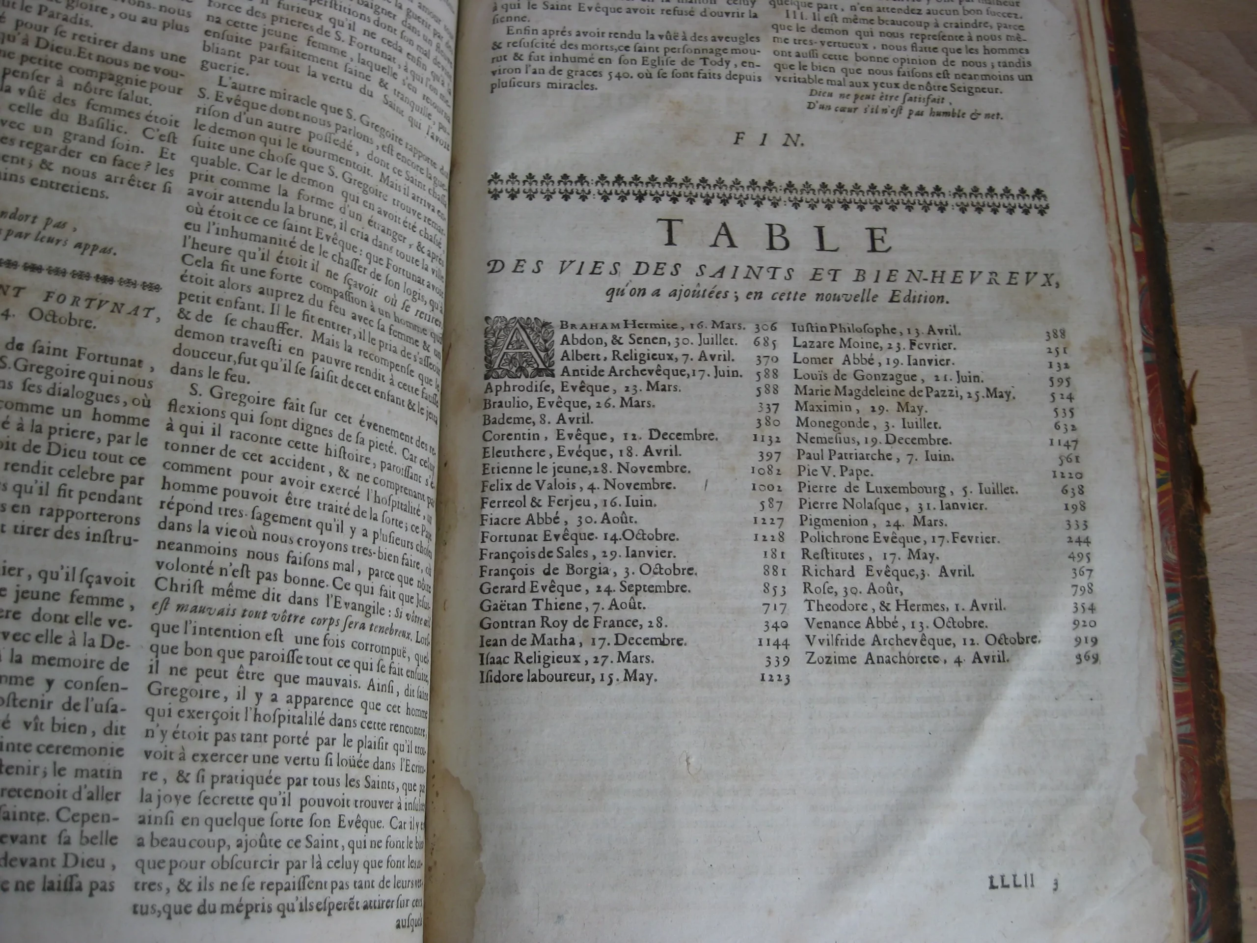 Comprend : table alphabétique, adresse au lecteur, privilège, 6p. [L’adresse au lecteur est insérée entre les pages de la table, avec un bel entête et une lettrine gravés]. Puis le texte du tome premier, 624p. entête et lettrine gravés, et 6 gravures, une pour chaque mois, représentant chacune 8 saints en vignettes encadrant une scène christique.