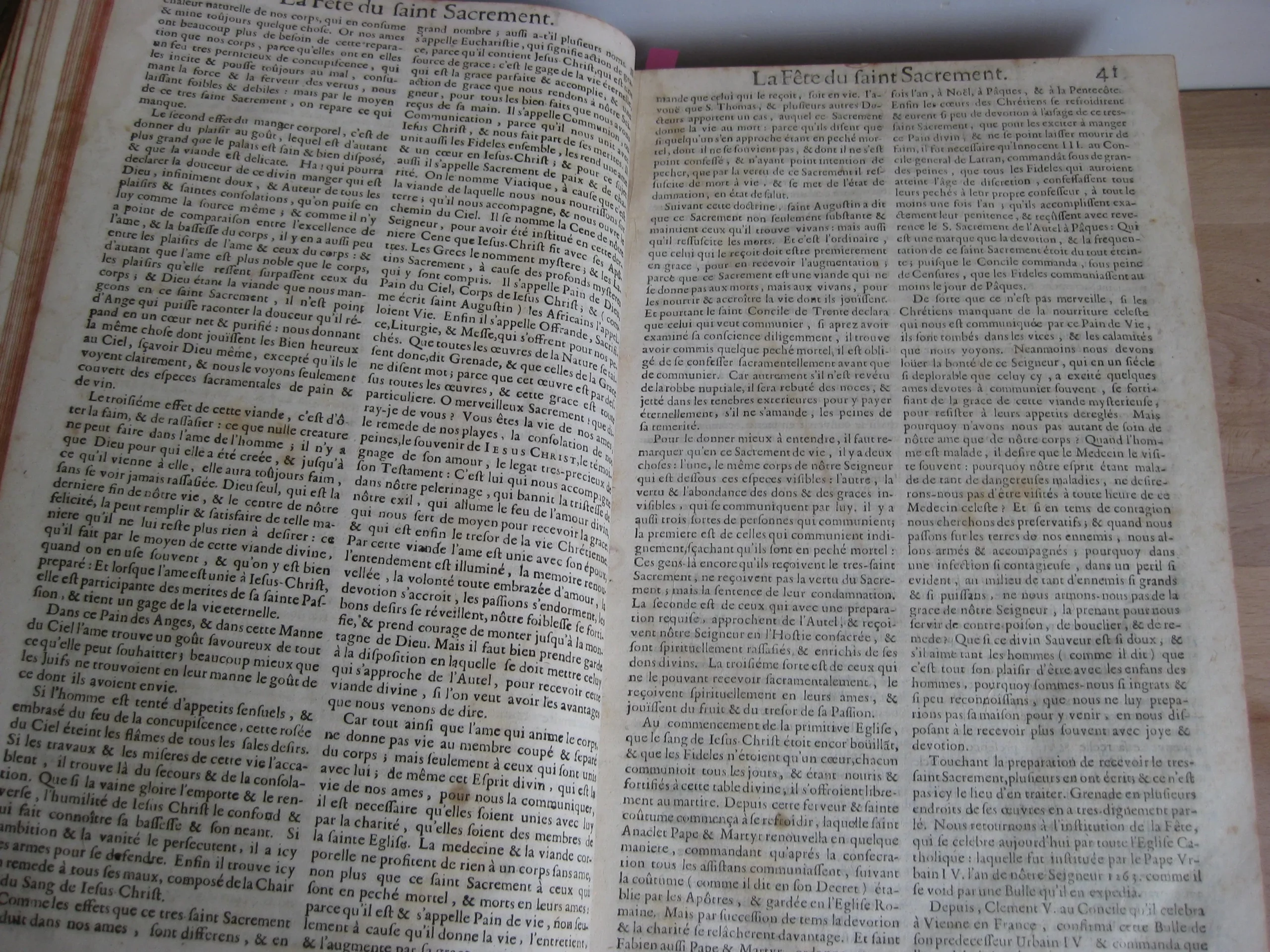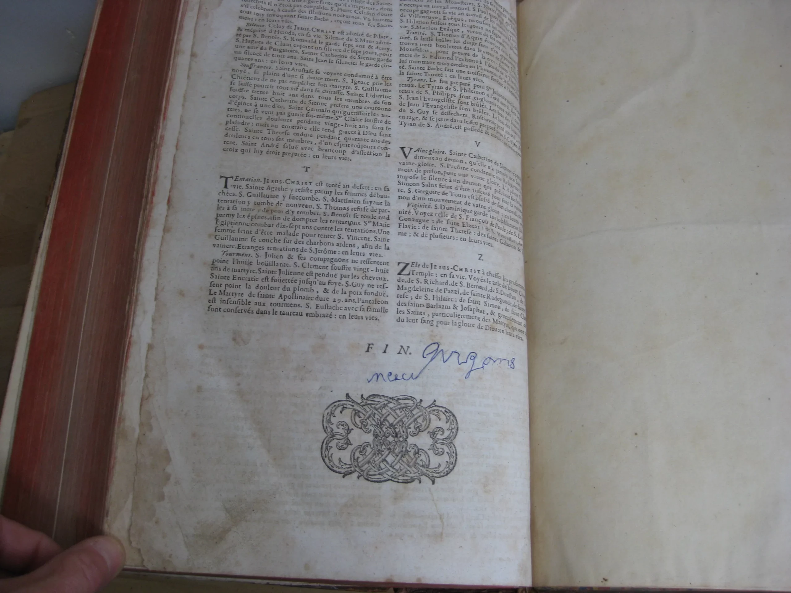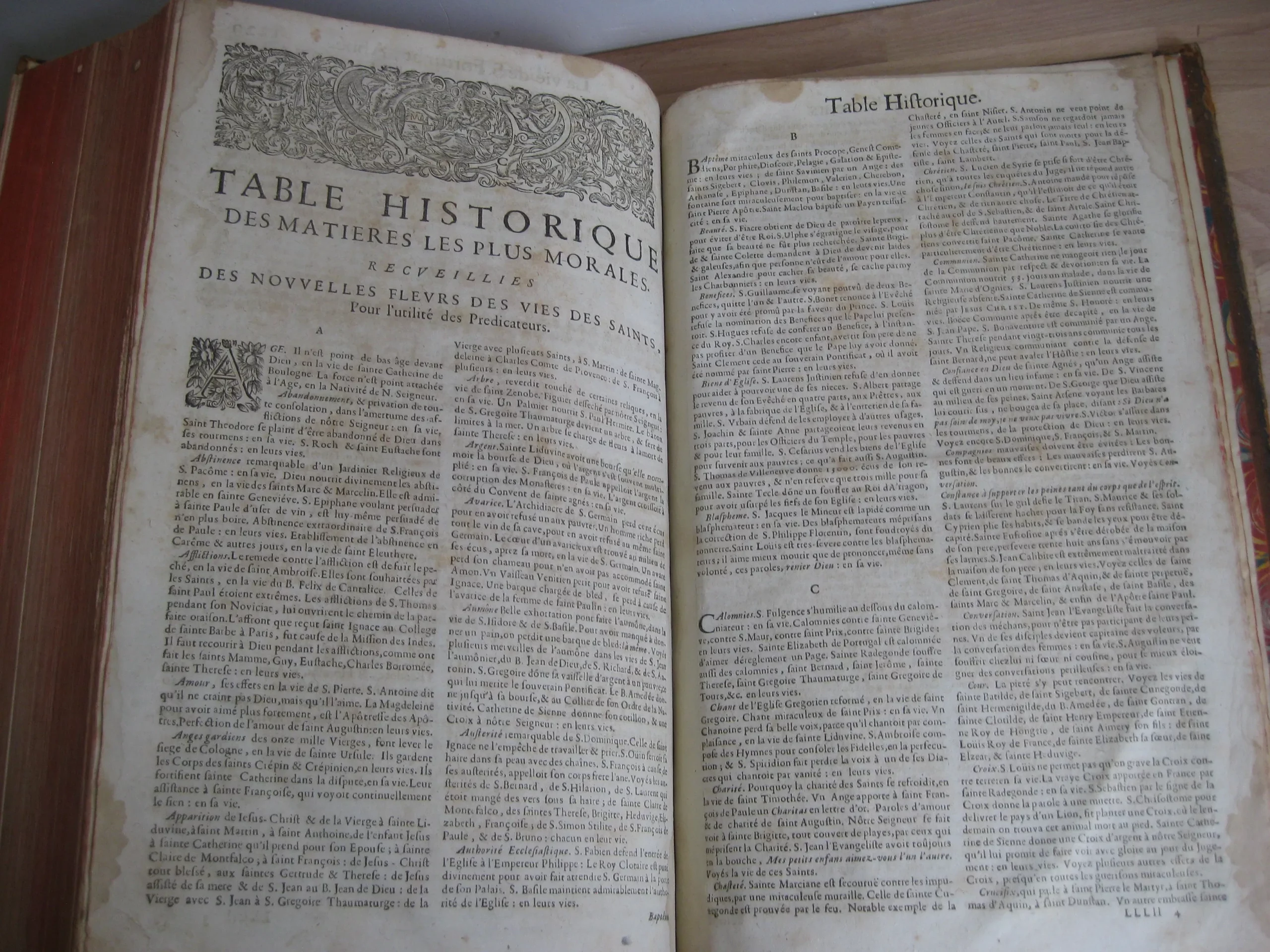 In-folio plein veau marbré, dos à six nerfs fleuronnés aux caisson, pièce de titre maroquin lie de vin, tranches rouges, plats à encadrement triple liseré, 362 x 225, 1691 Enrichies de figures en taille-douce & de tables alphabétiques & historiques, pour la commodité du lecteur & l’utilité des prédicateurs. Avec un frontispice gravé qui a été restauré/réinséré [et incomplet, avec manque en bordure latérales et dans sa hauteur]. Très belle vignette gravée au titre par G. Audran. Page de titre restaurée en marge. En garde restaurée, un ex-libris manuscrit « Mr Perboyre ». Texte sur deux colonnes.