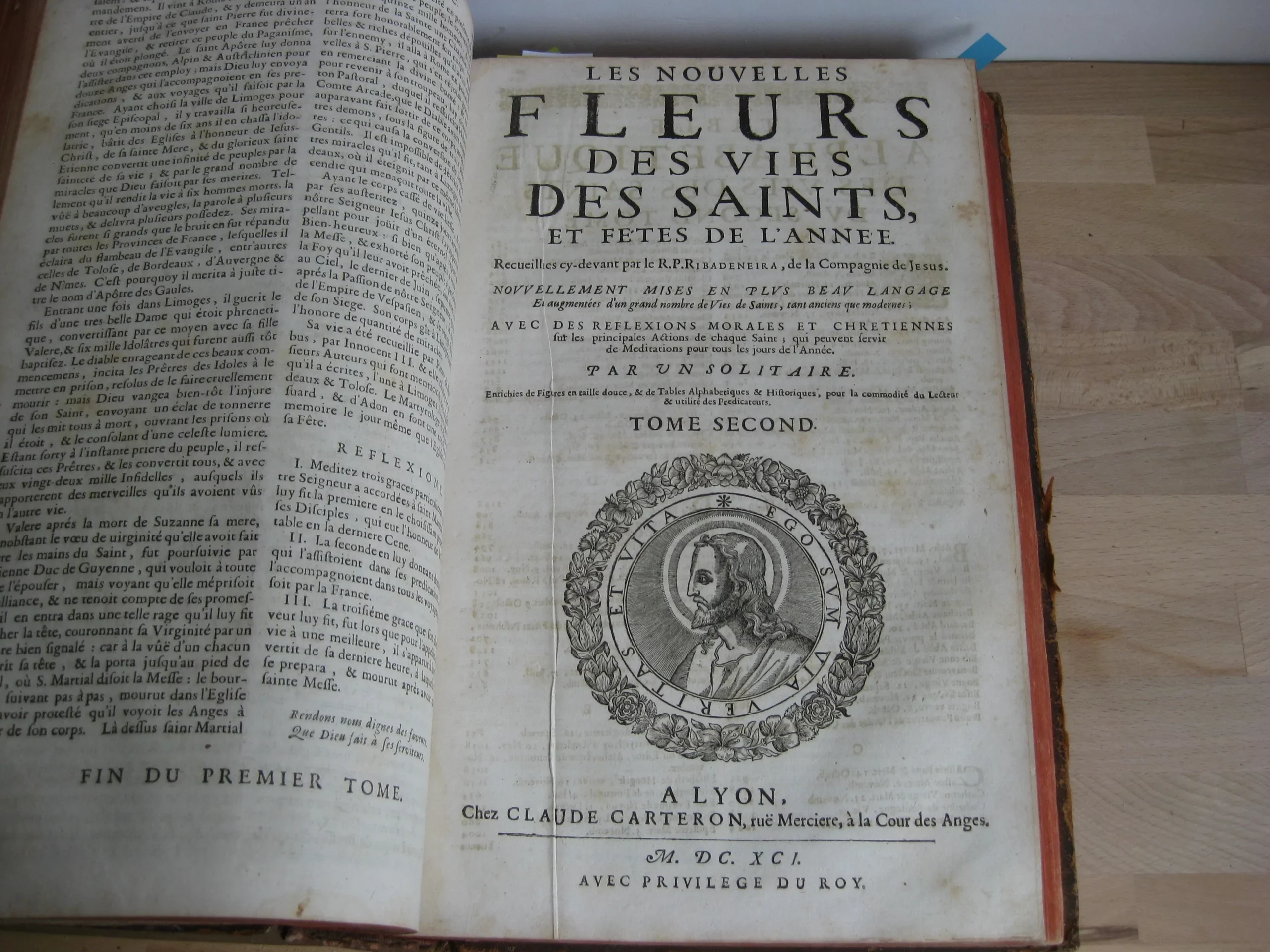 Tome second, vignette au titre [le Christ en médaillon]. 3p. de table alphabétique, puis le texte, 1029p. Avec pareillement qu’au premier tome : 6 gravures pour chaque mois, avec 8 vignettes de saints encadrant une scène. In fine : Table historique des matières les plus morales recueillies des nouvelles fleurs des vies des saints pour l’utilité des prédicateurs, entête, lettrine, cul-de-lampe, 7p.