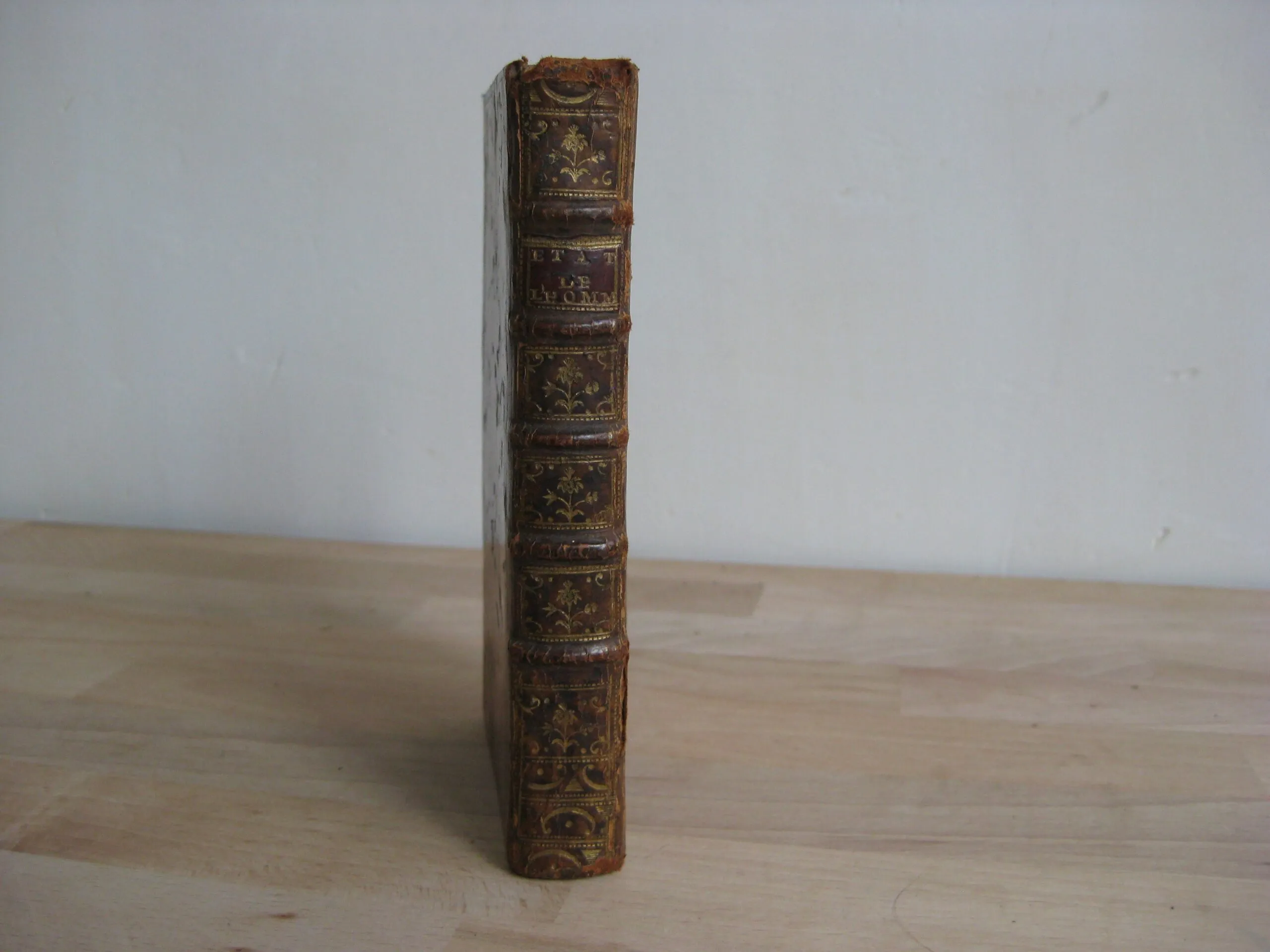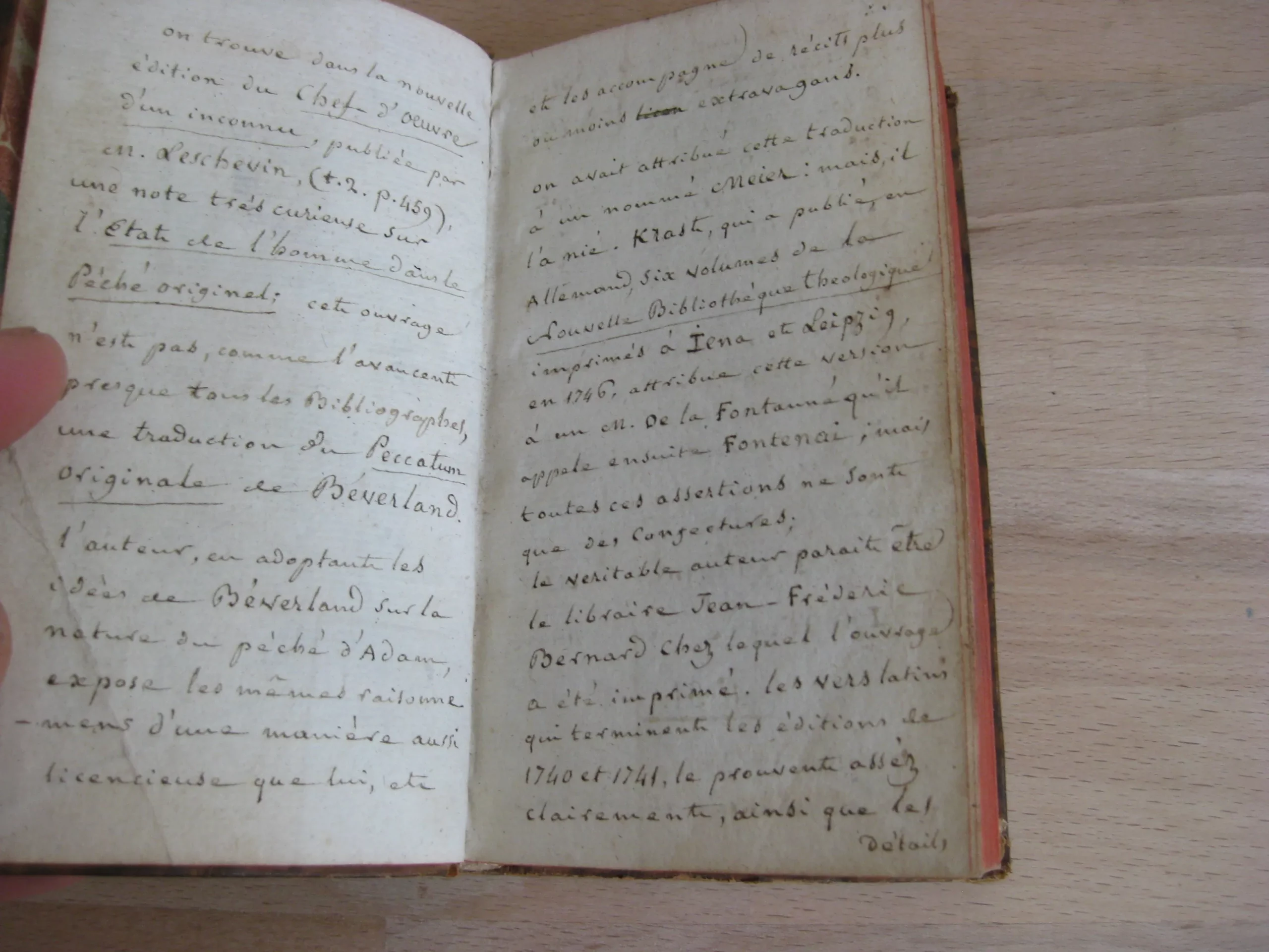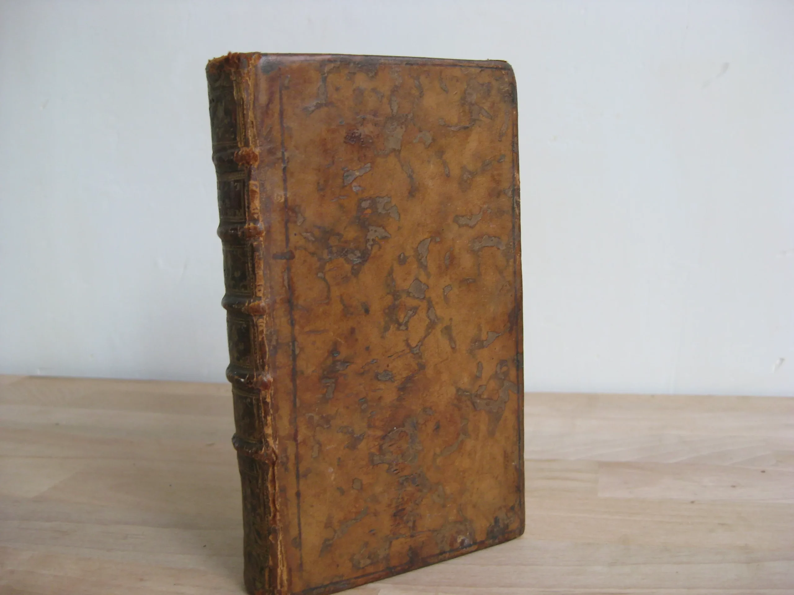 Pleine basane marbrée, dos 5 nerfs, orné d’une pièce de titre en maroquin lie de vin, richement orné également de caissons floraux à encadrement, avec variation des motifs en queue et coiffe, toutes tranches rouges, tranchefile, signet, champs à liserés, plats avec encadrement à liseré noir, 134 x 80, 241p. Hors table. (Erreur de pagination en dernière page corrigée à la plume). Sans date. Mais conforme à la 3ème édition de 1731, comme l’indique d’ailleurs une note bibliographique manuscrite reliée avec (voir ci-dessous). Page de titre manquante. Première page en partie restaurée, avec petit manque de texte en pied. Pour le reste complet. Une double page avec un passage souligné au crayon de couleur rouge ; sinon une note manuscrite en marge de pied des pp30-31. Une vignette de bilbiothèque (?) collée en têtre de garde. Intérieur globalement propre et intègre. Plats légèrement frottés mais très bons, propres et intègres. Champs et coins frottés. Mors frottés. Mors supérieur brièvement ouvert en tête du plat inférieur. Coiffe et queue frottés avec épidermures. Nerfs frottés. Bon exemplaire. Exemplaire fort intéressant car enrichi d’une note bibliographique manuscrite reliée avec, en début de volume (verso de la garde -1- à 3), et en fin de volume 2p. On remarque également, sans doute du même, pp30-31, en marge de pied, une note manuscrite au sujet d’un passage souligné. Cette note bibliographique réfute (en citant partiellement ses sources) qu’il s’agit d’une traduction du Peccatum originale de Béverland, mais (bien qu’il soit proche dans le raisonnement) l’attribue au libraire Jean-Frédéric Bernard, chez lequel il aurait été imprimé. Il s’appuie notamment sur les éditions de 1740 et 1741 pour le justifier. Il s’agirait donc bien ici de la 3ème éd. augmentée et corrigée de 1731. Suit une note biographique dudit libraire.