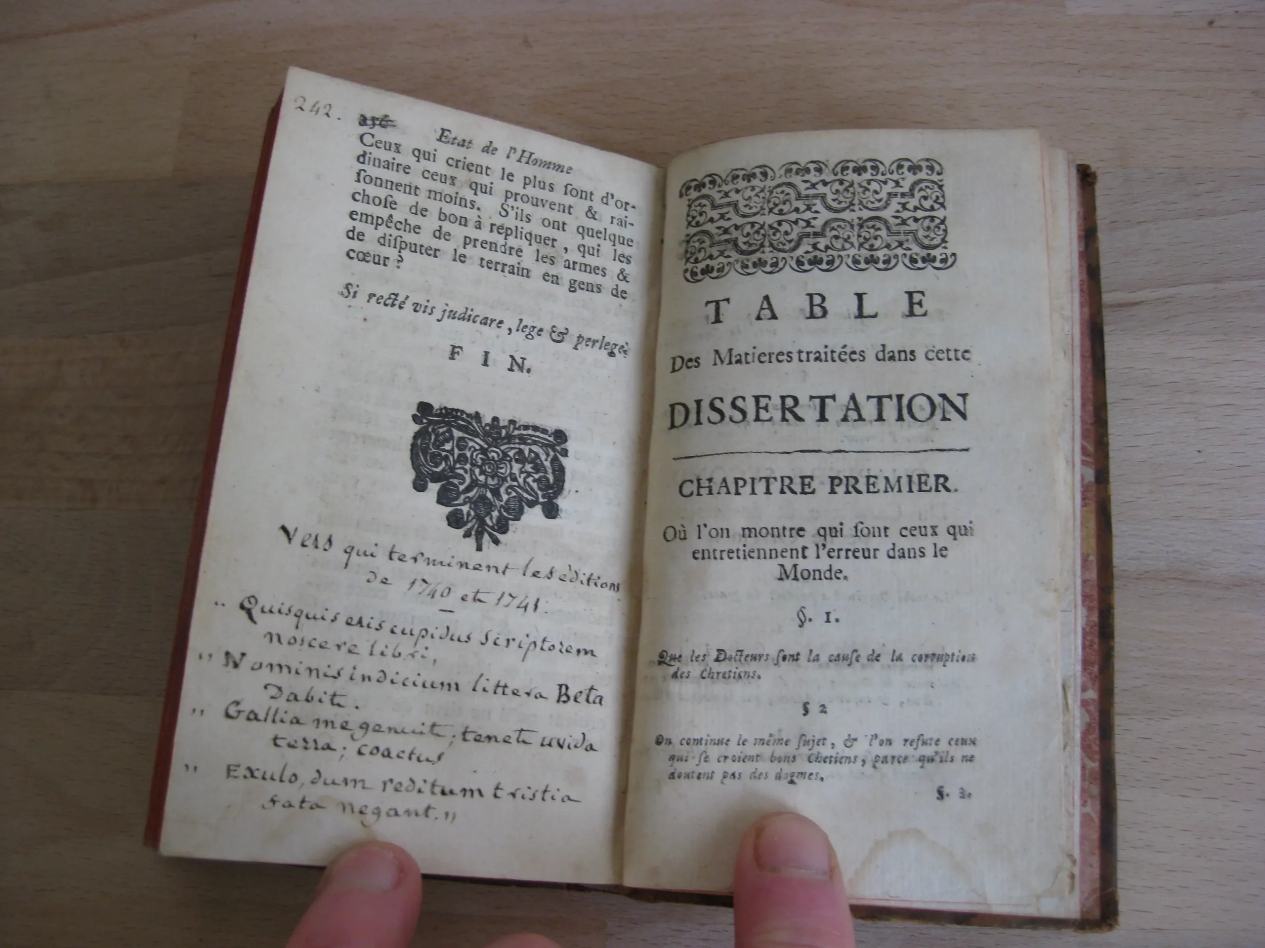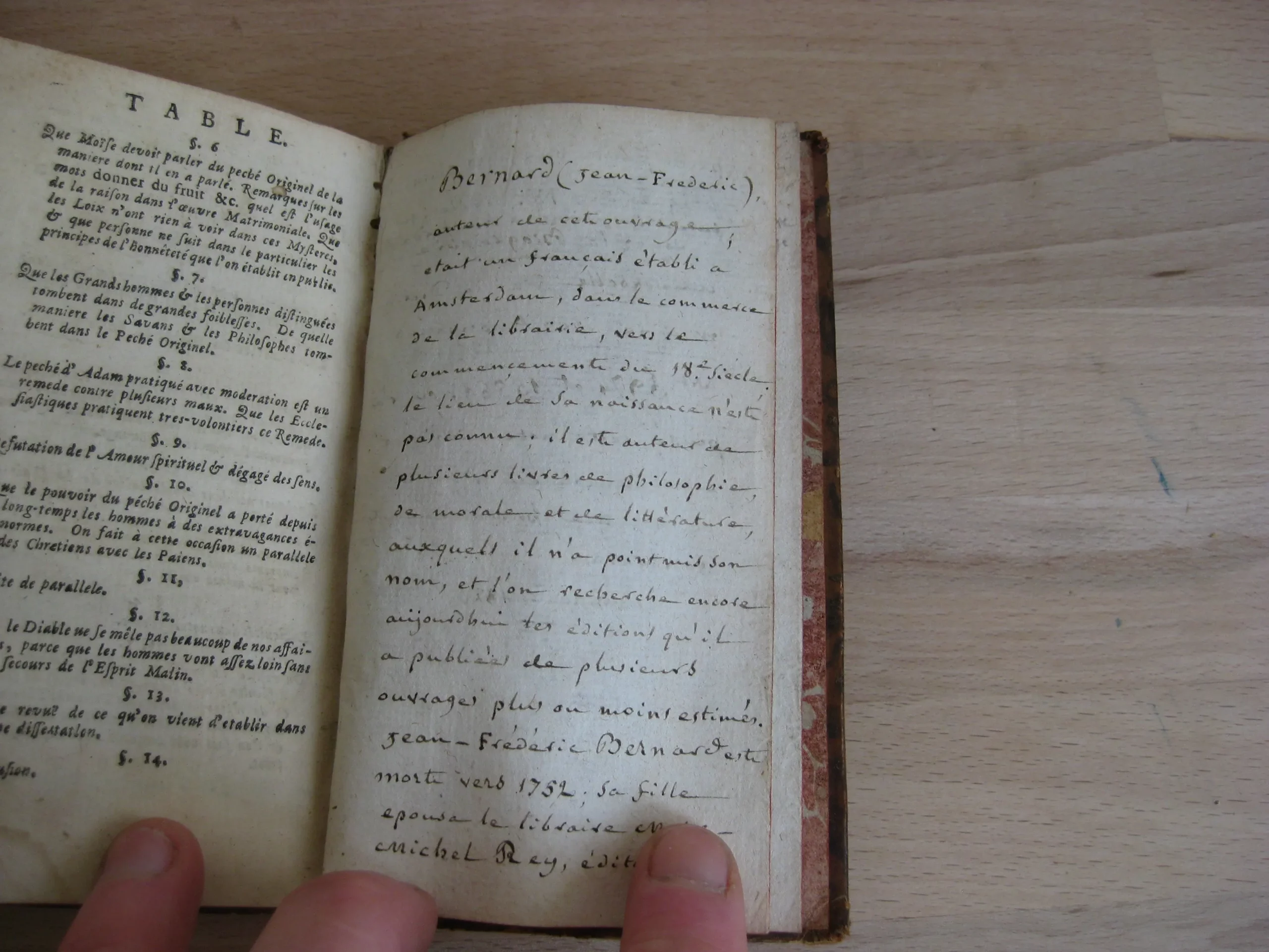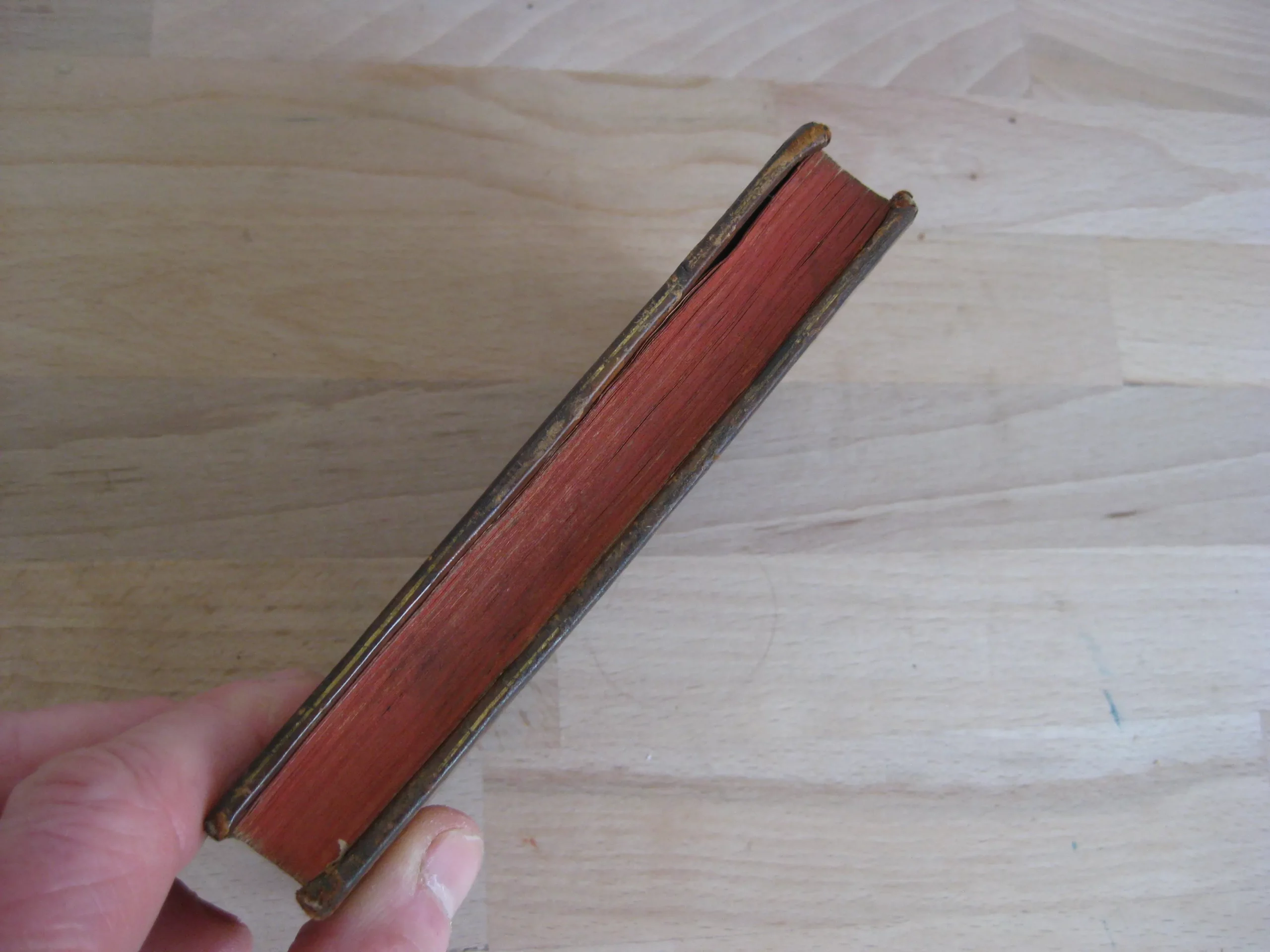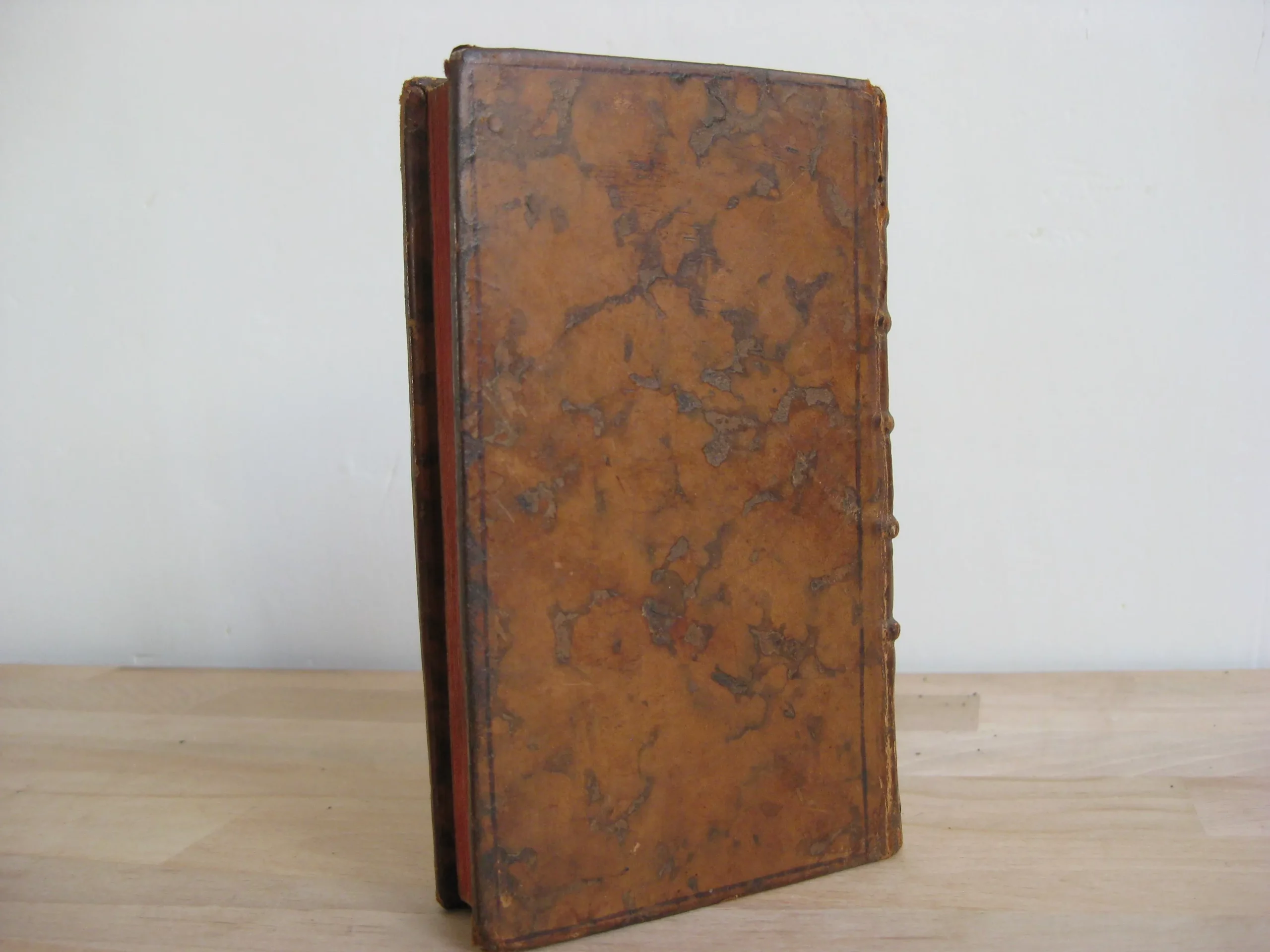 Pleine basane marbrée, dos 5 nerfs, orné d’une pièce de titre en maroquin lie de vin, richement orné également de caissons floraux à encadrement, avec variation des motifs en queue et coiffe, toutes tranches rouges, tranchefile, signet, champs à liserés, plats avec encadrement à liseré noir, 134 x 80, 241p. Hors table. (Erreur de pagination en dernière page corrigée à la plume). Sans date. Mais conforme à la 3ème édition de 1731, comme l’indique d’ailleurs une note bibliographique manuscrite reliée avec (voir ci-dessous). Page de titre manquante. Première page en partie restaurée, avec petit manque de texte en pied. Pour le reste complet. Une double page avec un passage souligné au crayon de couleur rouge ; sinon une note manuscrite en marge de pied des pp30-31. Une vignette de bilbiothèque (?) collée en têtre de garde. Intérieur globalement propre et intègre. Plats légèrement frottés mais très bons, propres et intègres. Champs et coins frottés. Mors frottés. Mors supérieur brièvement ouvert en tête du plat inférieur. Coiffe et queue frottés avec épidermures. Nerfs frottés. Bon exemplaire. Exemplaire fort intéressant car enrichi d’une note bibliographique manuscrite reliée avec, en début de volume (verso de la garde -1- à 3), et en fin de volume 2p. On remarque également, sans doute du même, pp30-31, en marge de pied, une note manuscrite au sujet d’un passage souligné. Cette note bibliographique réfute (en citant partiellement ses sources) qu’il s’agit d’une traduction du Peccatum originale de Béverland, mais (bien qu’il soit proche dans le raisonnement) l’attribue au libraire Jean-Frédéric Bernard, chez lequel il aurait été imprimé. Il s’appuie notamment sur les éditions de 1740 et 1741 pour le justifier. Il s’agirait donc bien ici de la 3ème éd. augmentée et corrigée de 1731. Suit une note biographique dudit libraire.