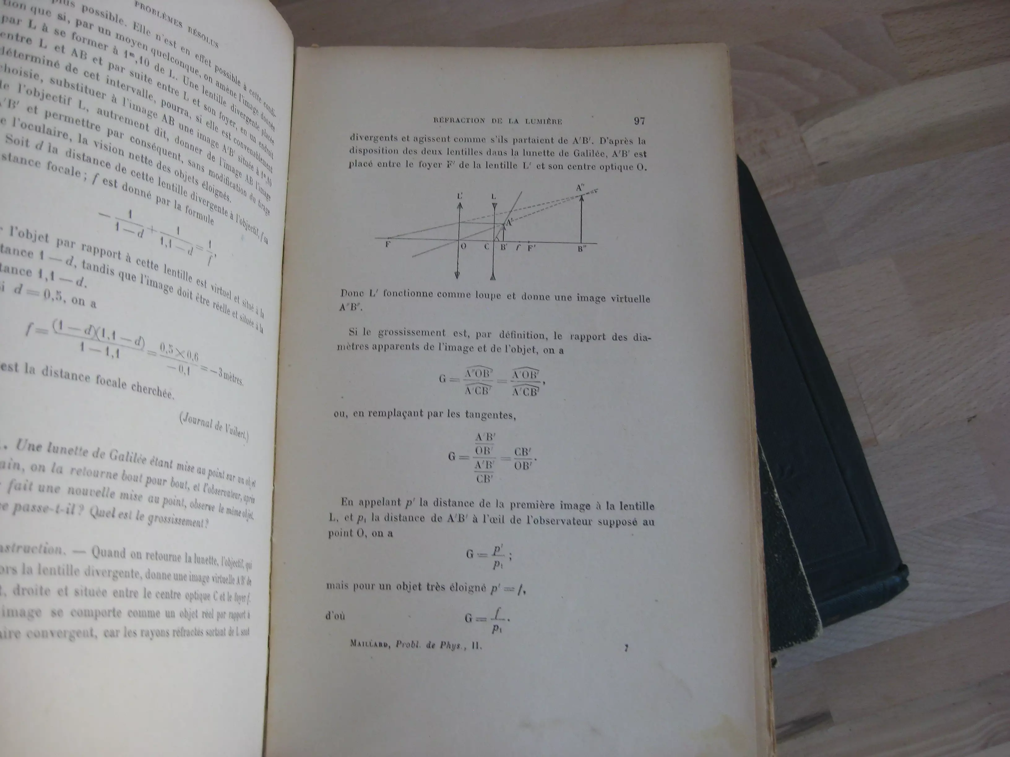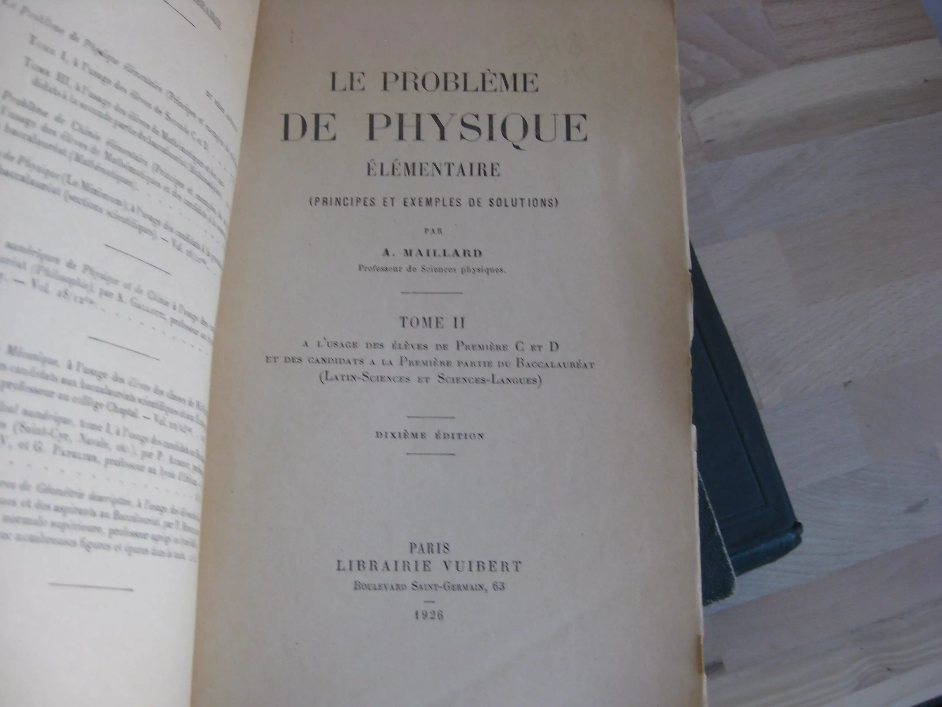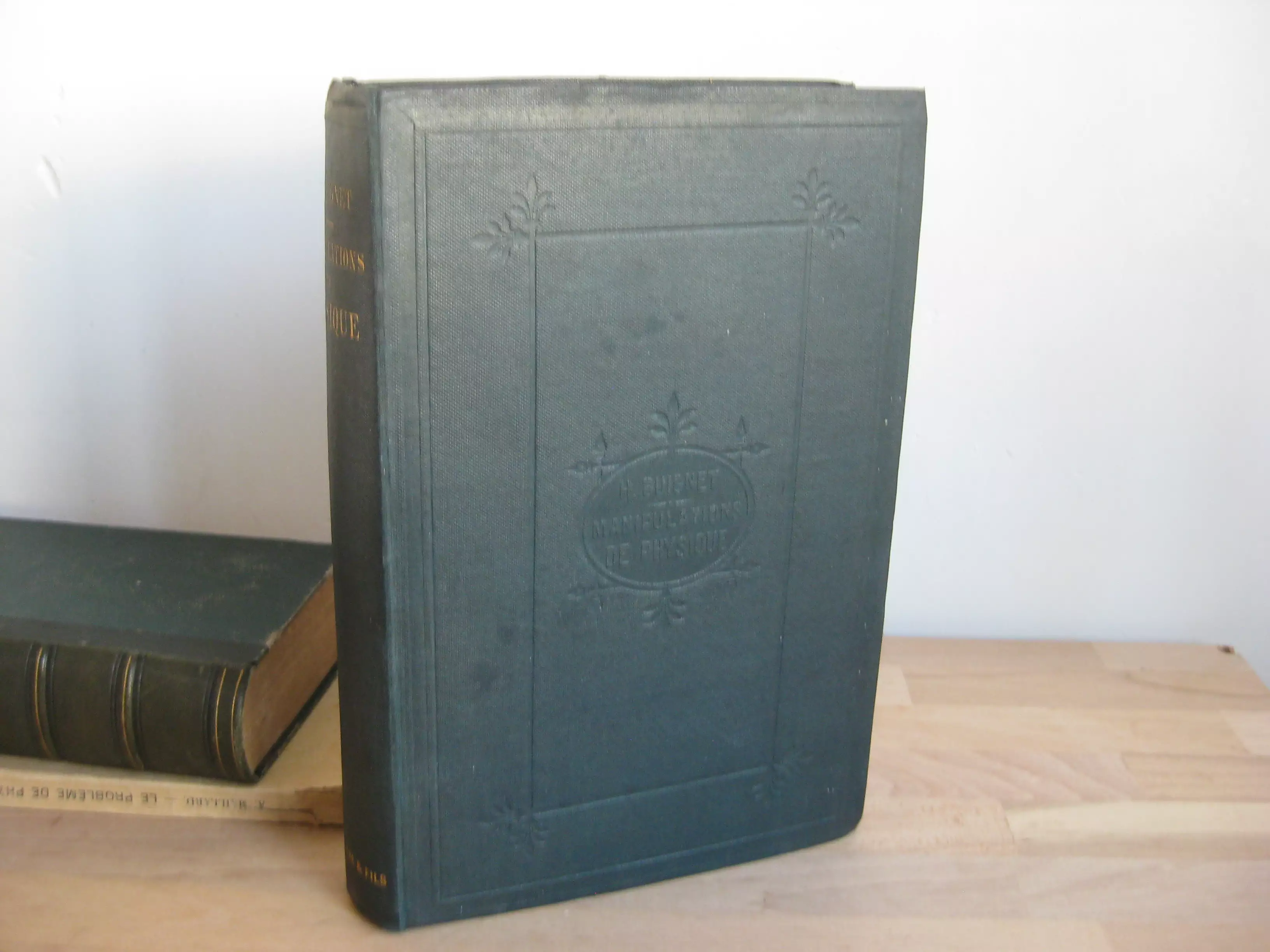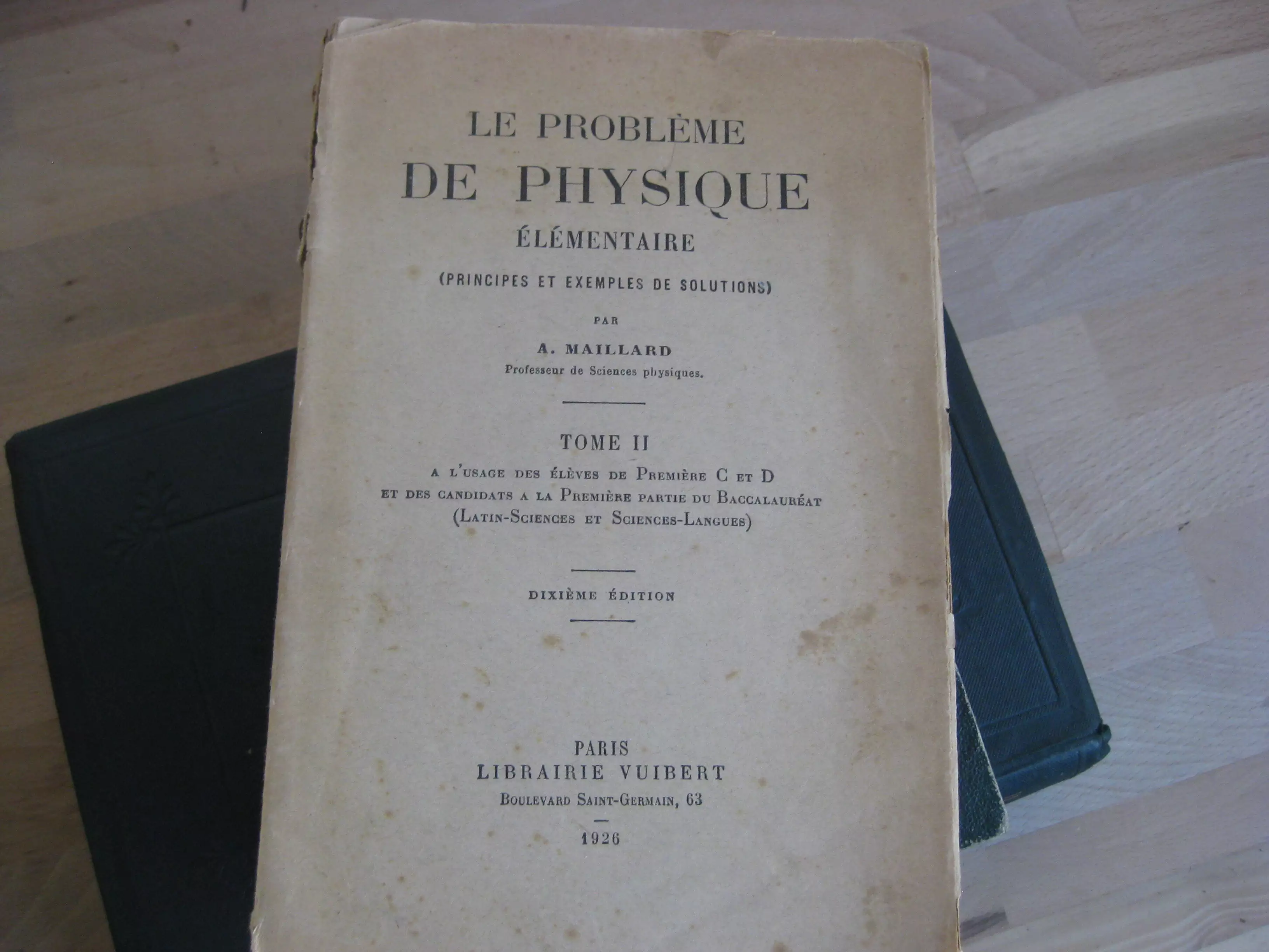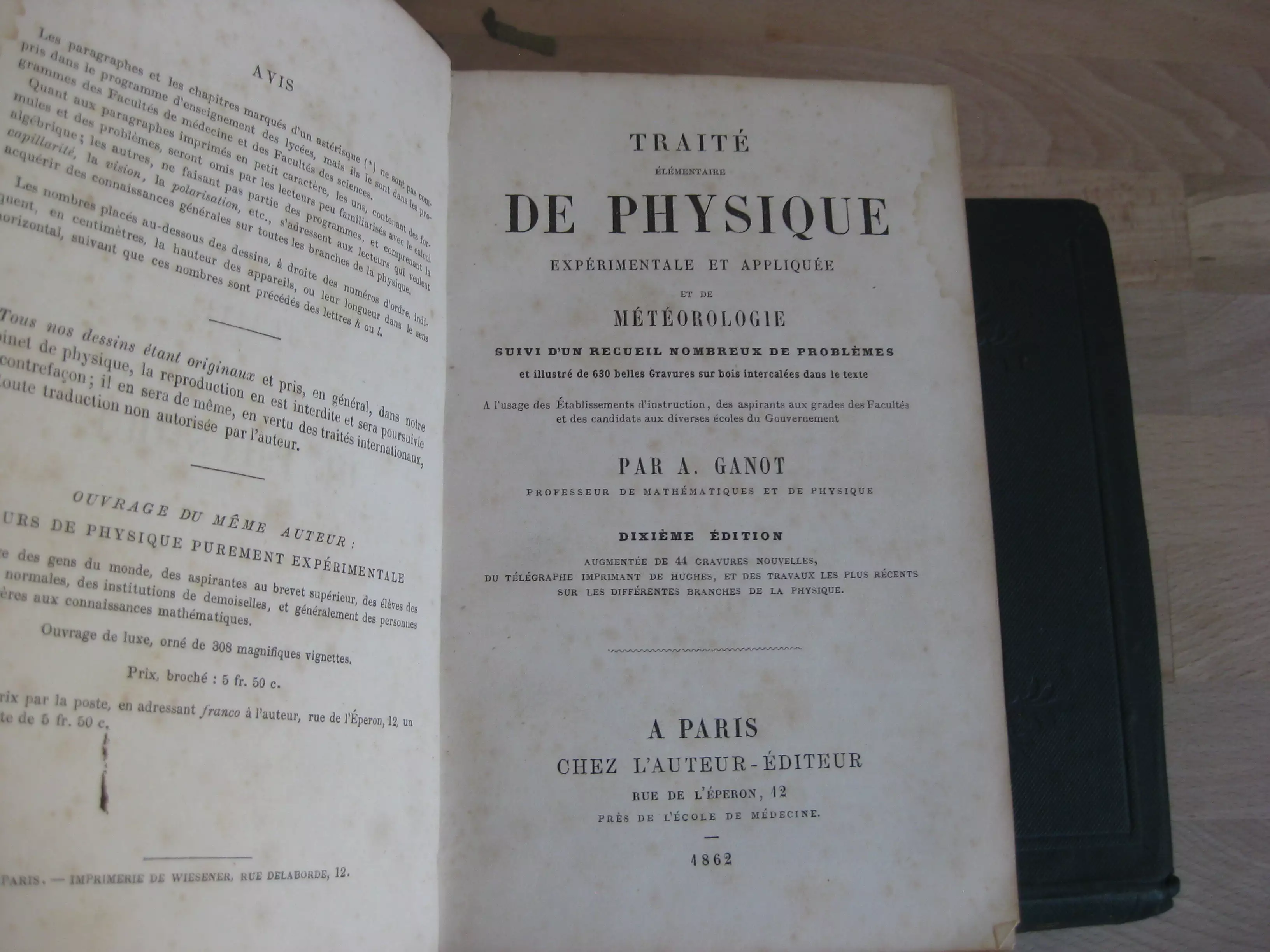 Nous joignons : « Traité élémentaire de physique expérimentale et appliquée et de météorologie ; suivi d’un recueil de 103 problèmes avec solutions : ill. de 630 belles gravures…. », par A. Ganot. 10 ème ed. 1862, en demi-chagrin chocolat en très bel état ; et : « Le problème de physique élémentaire (principes, exemples et solutions) », par A. Maillard, t2, 1926, défraîchi.