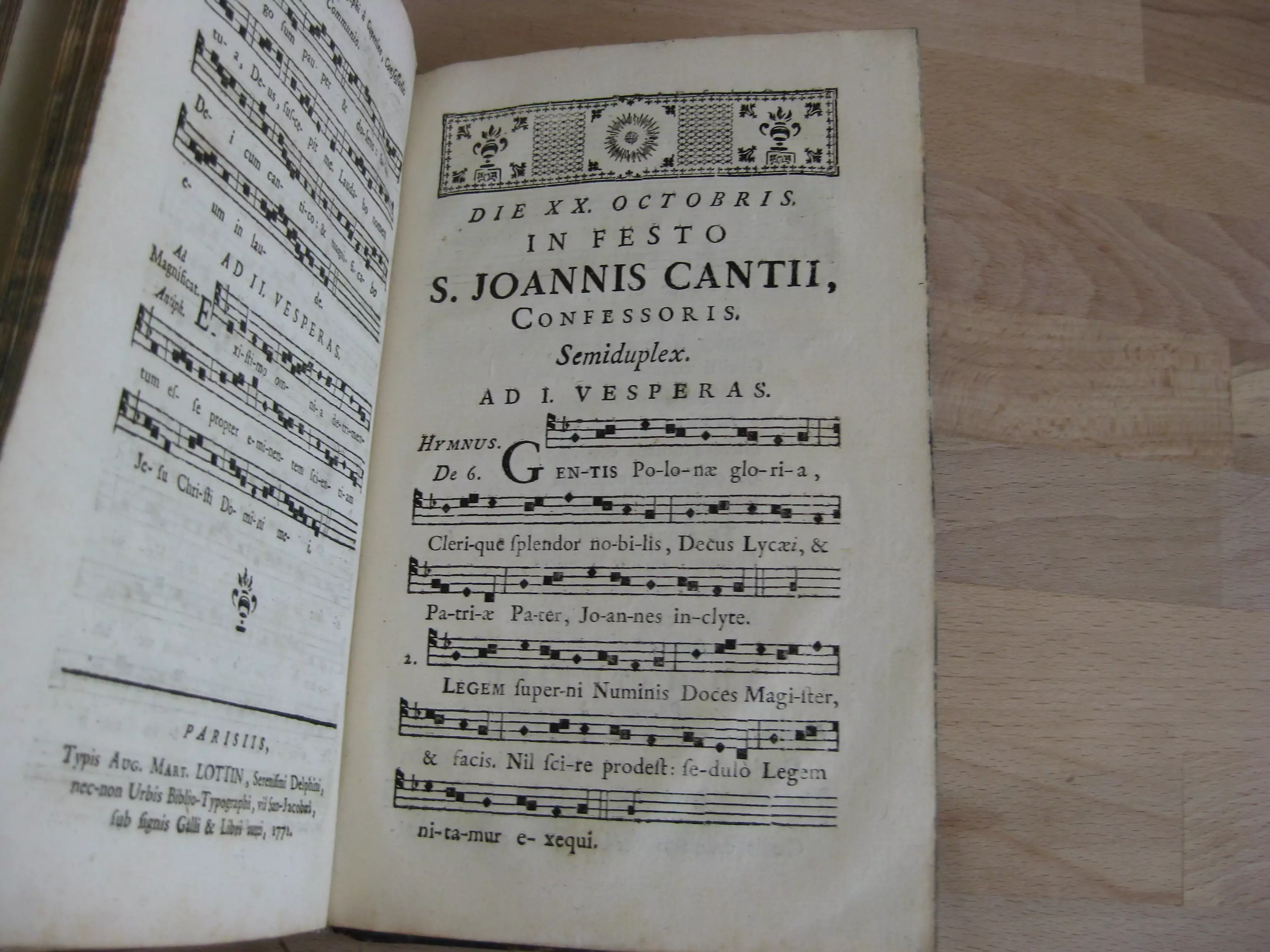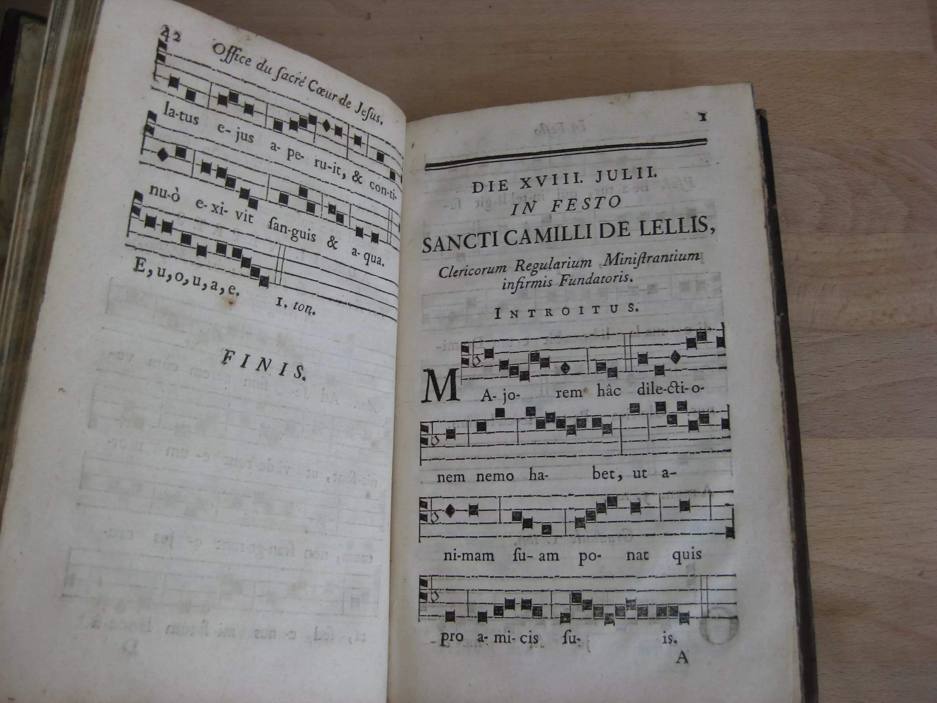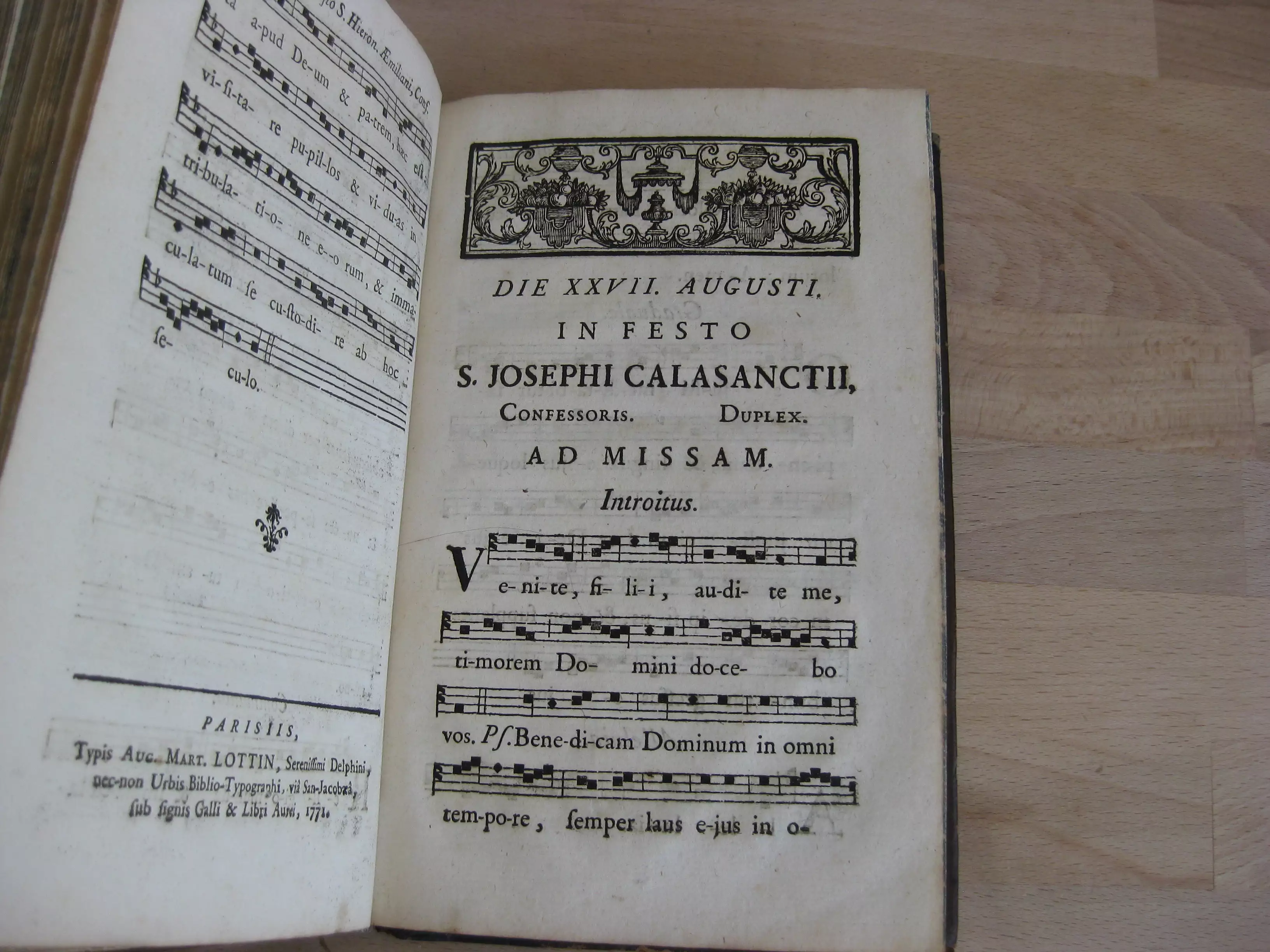 Suivi de 6 offices notés avec chants pour 5 saints : Die XVIII julii in festo Sancti Camilli de Lellis. Clericum regularium ministrantium infirmis fundatoris, 10p. Sans date. / Die XX julii in festo S. Hieronymi aemiliani , 4p. 1771. / Die XVII augusti in festo S. Josephi Calasanctii, 4p. 1771./ Die XVIII septembris in festo S. Josephi A. Cupertino, 4p. 1771 ; / Die XX octobris in festo S. Joannis Cantii ad vesperam, 4p. 1771/et : Die XX octobris in festo S. Joannis Cantii ad missam, 4p. 1771. Avec 3 entêtes et 2 culs-de-lampe gravés.