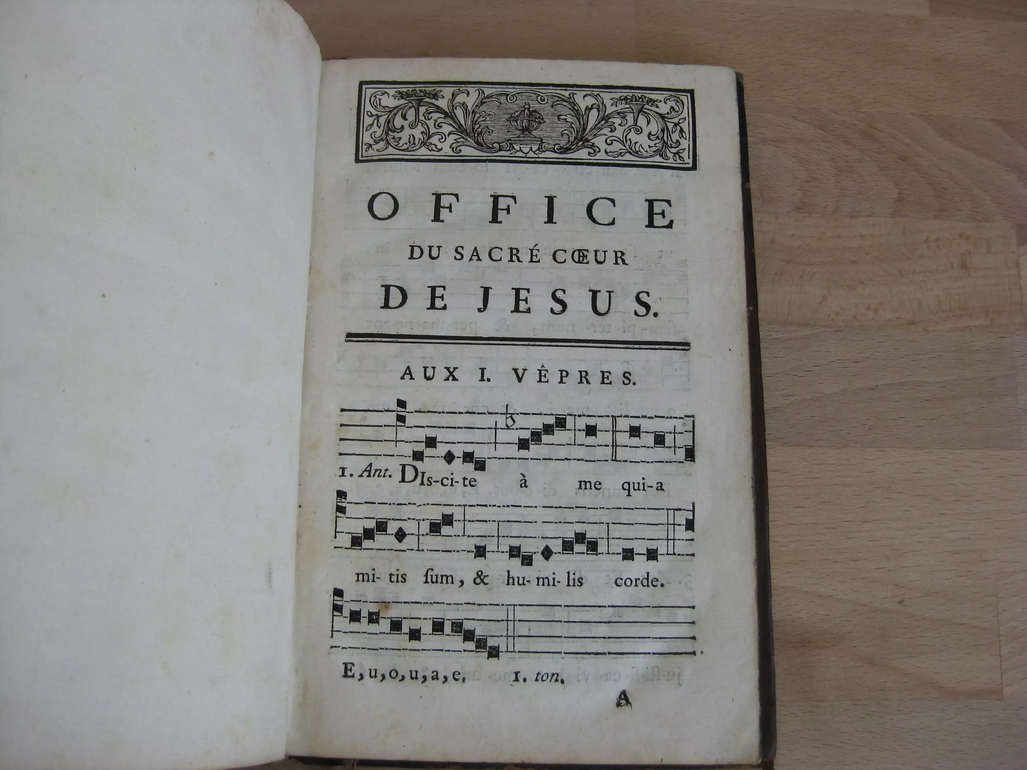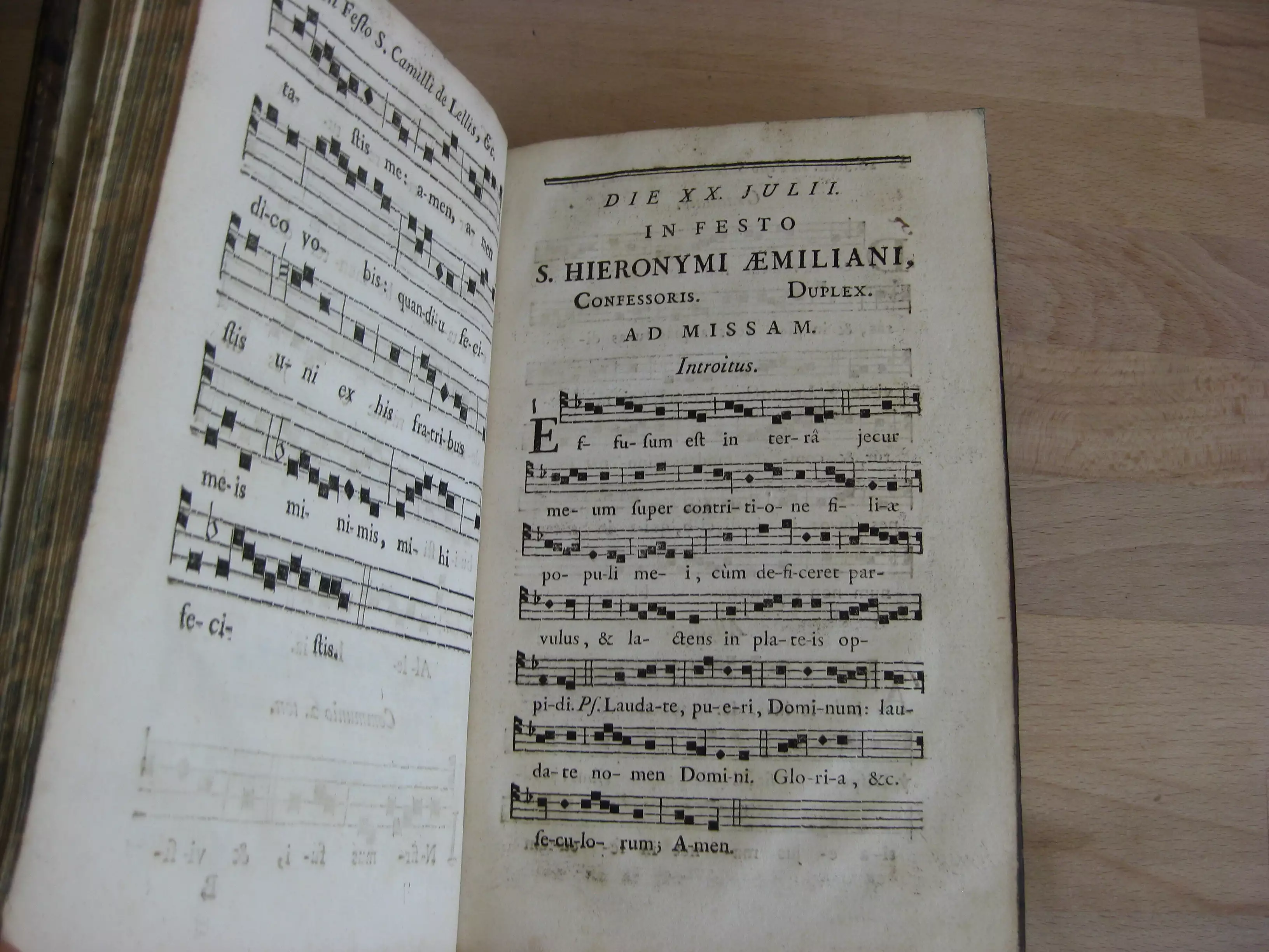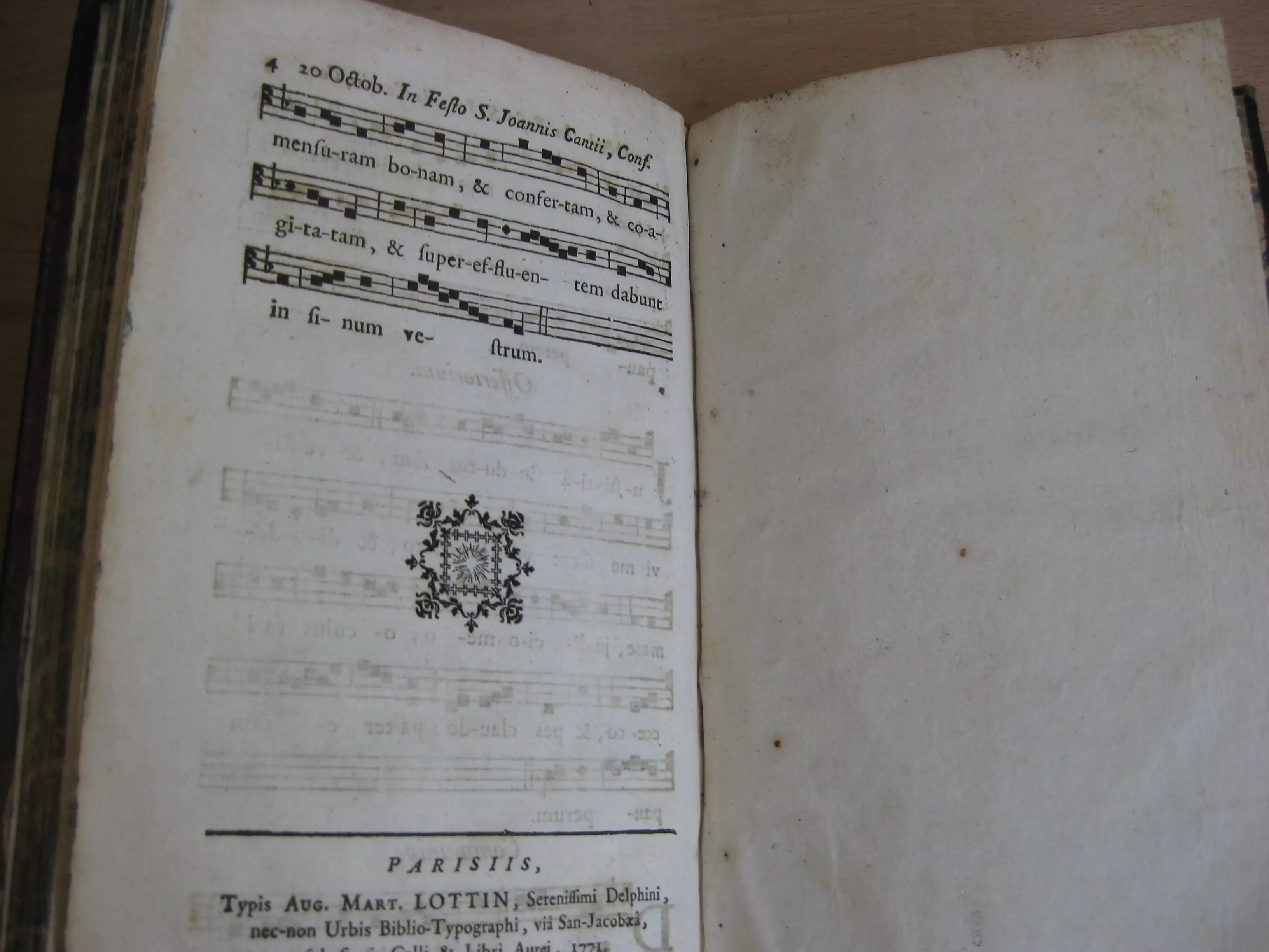 Suivi de 6 offices notés avec chants pour 5 saints : Die XVIII julii in festo Sancti Camilli de Lellis. Clericum regularium ministrantium infirmis fundatoris, 10p. Sans date. / Die XX julii in festo S. Hieronymi aemiliani , 4p. 1771. / Die XVII augusti in festo S. Josephi Calasanctii, 4p. 1771./ Die XVIII septembris in festo S. Josephi A. Cupertino, 4p. 1771 ; / Die XX octobris in festo S. Joannis Cantii ad vesperam, 4p. 1771/et : Die XX octobris in festo S. Joannis Cantii ad missam, 4p. 1771. Avec 3 entêtes et 2 culs-de-lampe gravés.