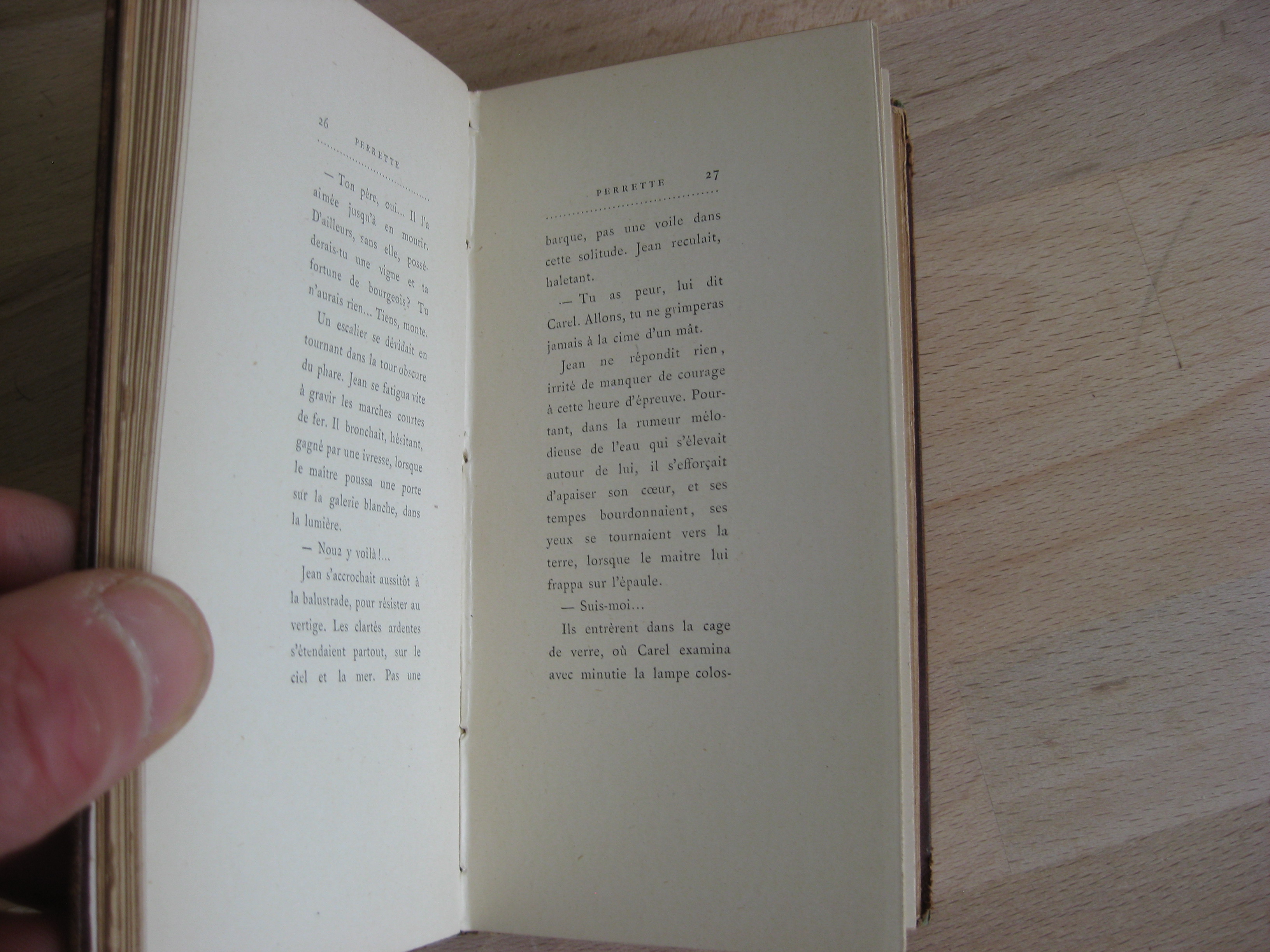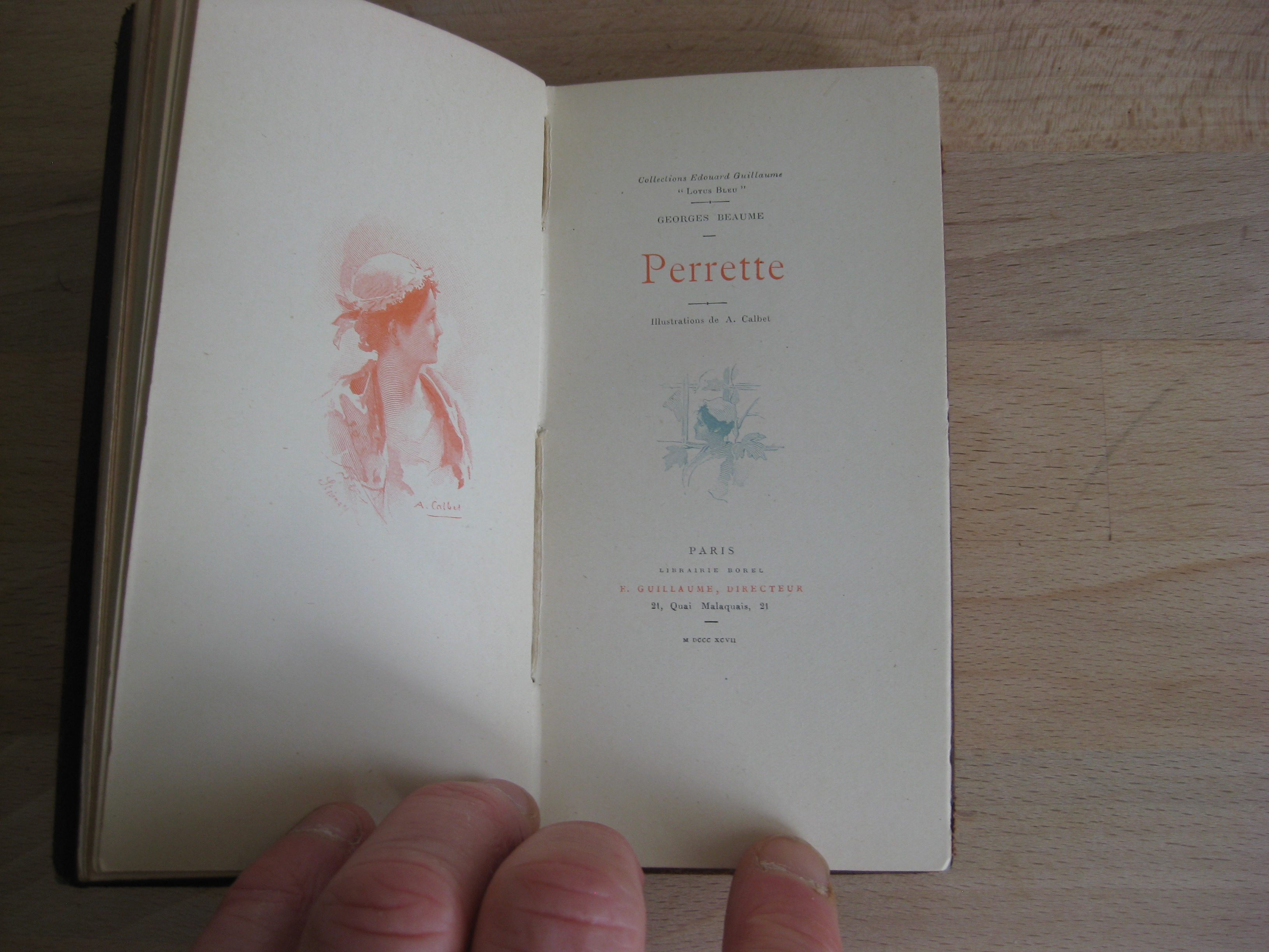 Librairie Borel – Pleine basane lie de vin à dos romantique orné de 5 faux-nerfs, de liserés, frises, pièce de titre havane, auteur estampé doré, couverture conservée, 140 x 77, 134p. 1897. Collection Edouard Guillaume « Lotus Alba ». Illustrations de Calbet. Page de titre illustrée. Avant la lettre : suite de 4 sanguines. Frontispice et 4 illustrations à pleine page, d’autres en entête. Intérieur très bon, propre et intègre. Des frottements à la reliure (champs, coins). Quelques griffes aux plats. Dos insolé avec épidermures en coiffe et en queue. Mors inférieur très frotté. Bon exemplaire bien ferme.
