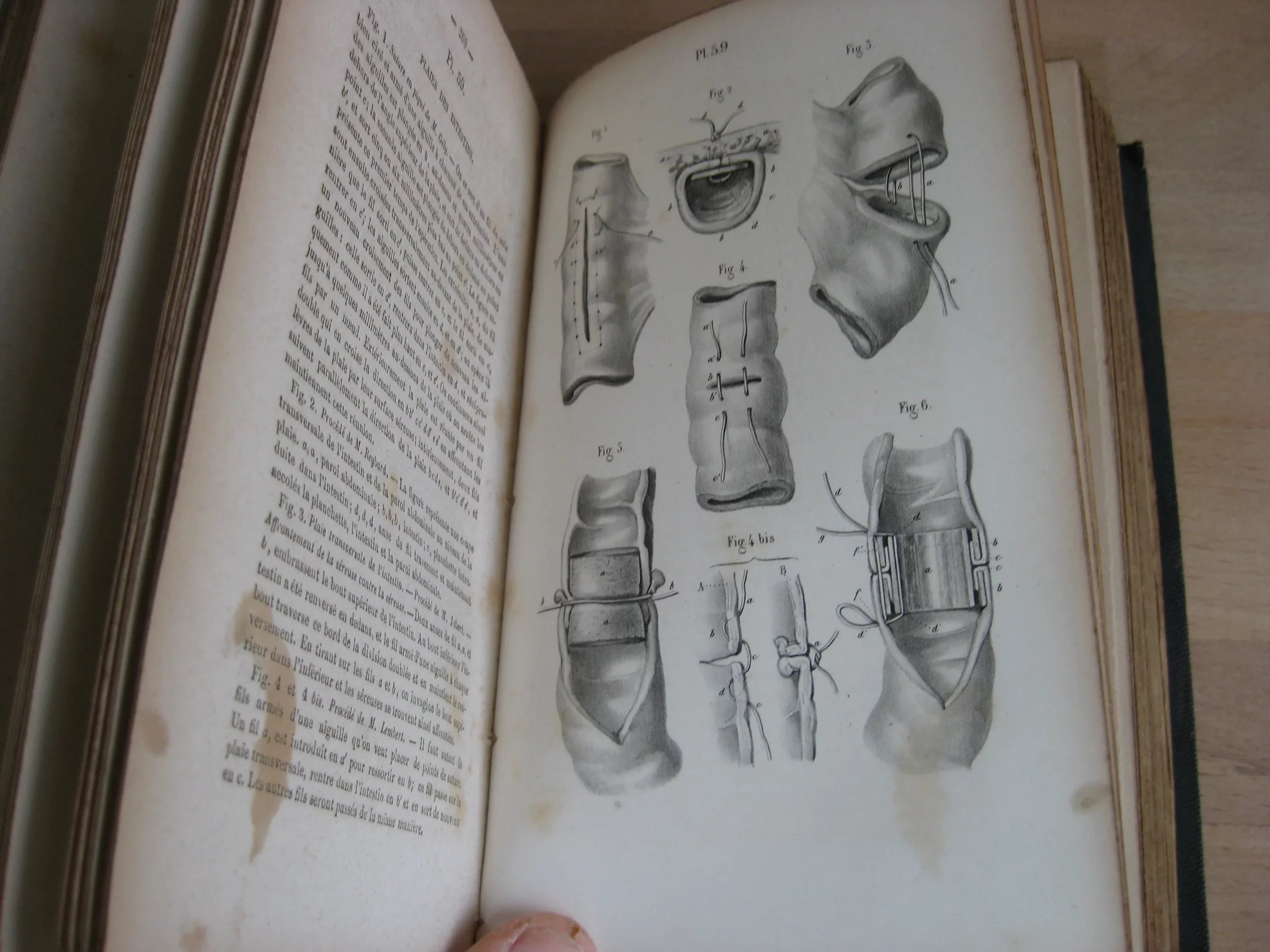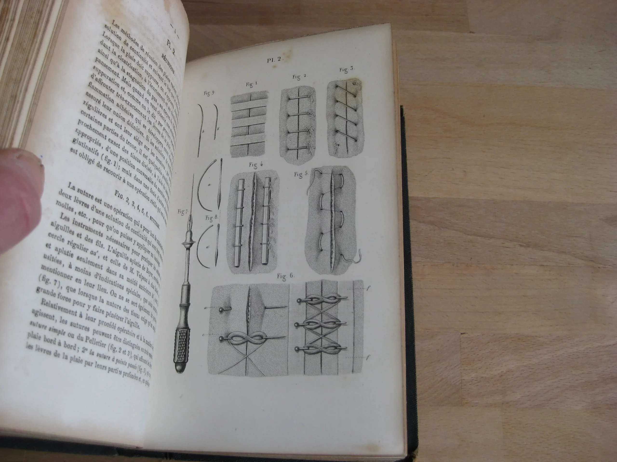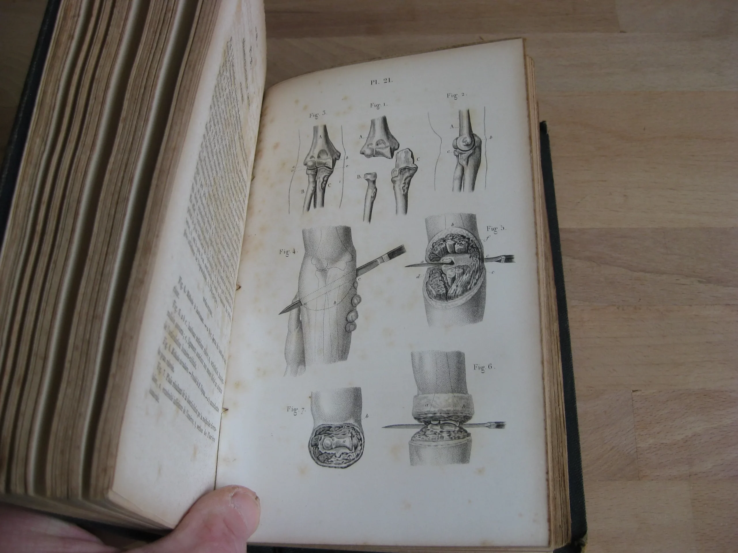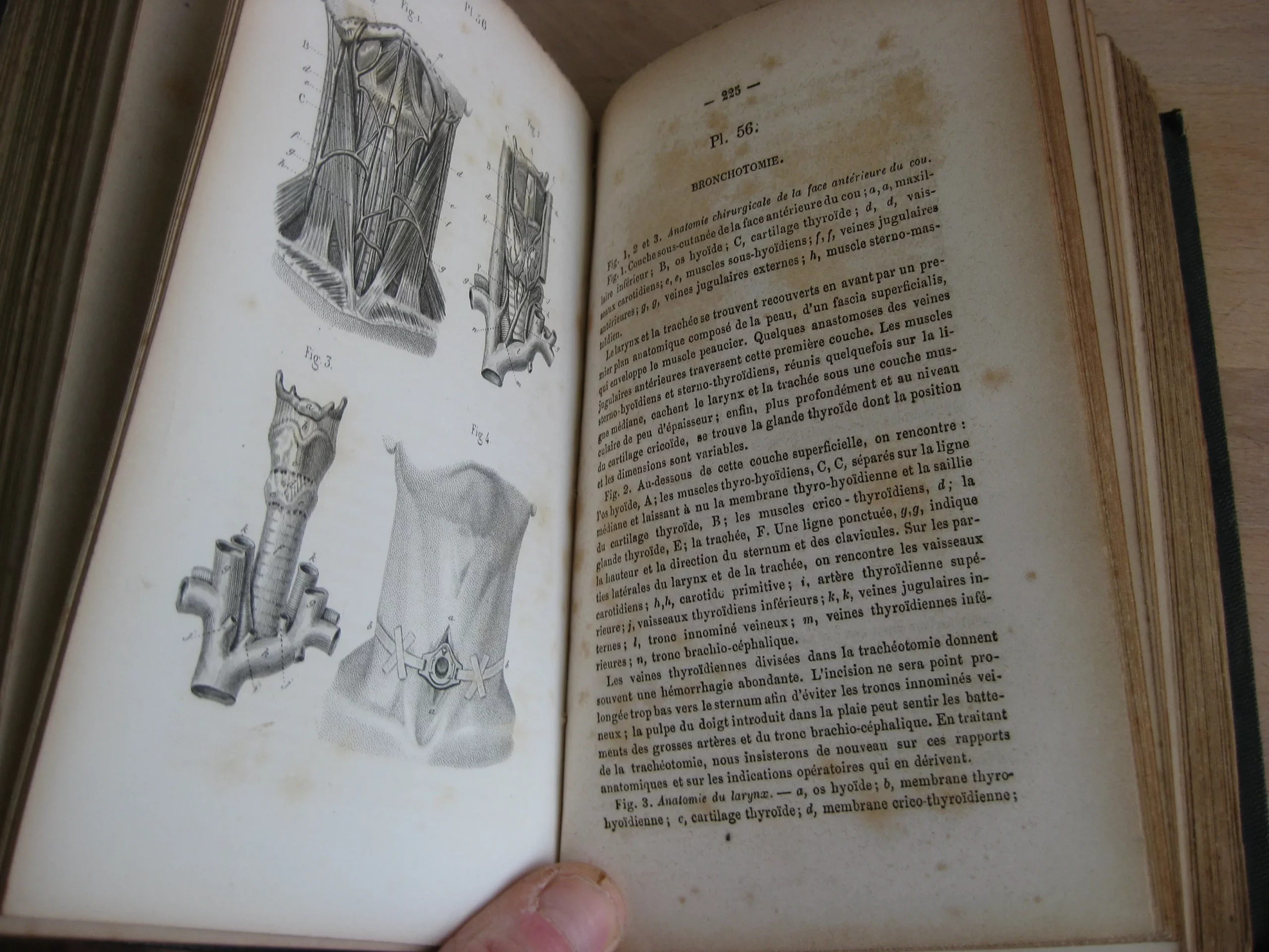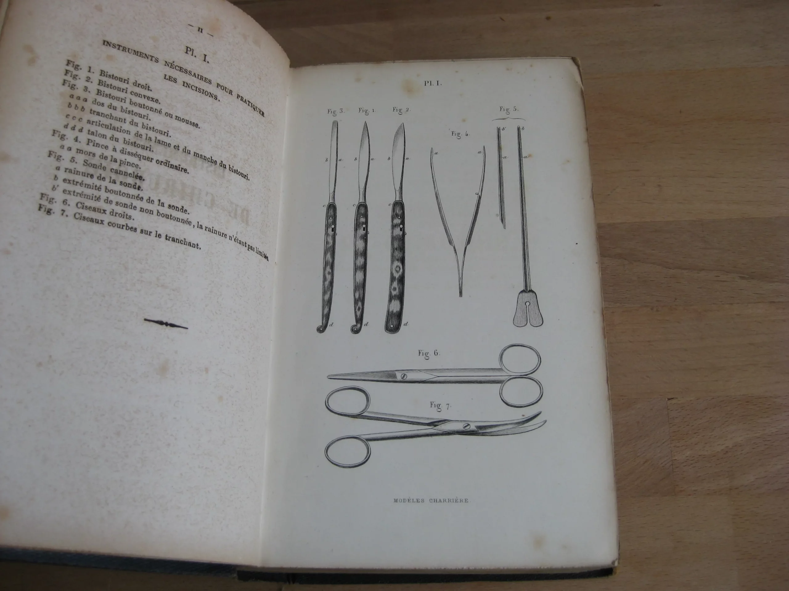 Pleine percaline noire, à dos long orné des titre, auteur, éditeur, et plats estampés, 191 x 125, 495p. Avec tables des planches et des matières. (In fine l’annonce à paraître du Nouveau dictionnaire de médecine et de chirurgie pratiques, et le catalogue de l’éditeur, 35p.). 1866. Avec 113 planches dessinées d’après nature, gravées au burin sur acier. Légendes en vis-à-vis des planches ou à la suite. Frontispice sous serpente. Comprend : Instruments de chirurgie, 25 planches. / Anatomie chirurgicale de médecine opératoire, 88 planches. Complet de toutes ses planches. Intérieur avec rousseurs, planches plutôt épargnées et propres. Charnière intérieur du plat supérieur ouverte. Reliure mobile. Coins légèrement émoussés. Champs frottés. Plats frottés. Mors frottés et bien usagés, ouvert en tête et pied de plat supérieur, et en tête de plat inférieur. Un petite déchirure en plein mors supérieur et inférieur. Dos frottés avec épidermures en coiffe et pied.