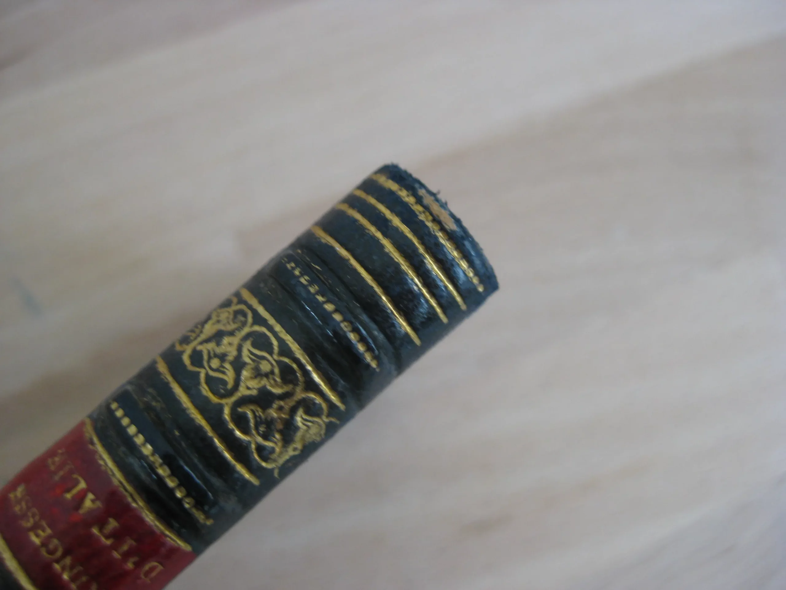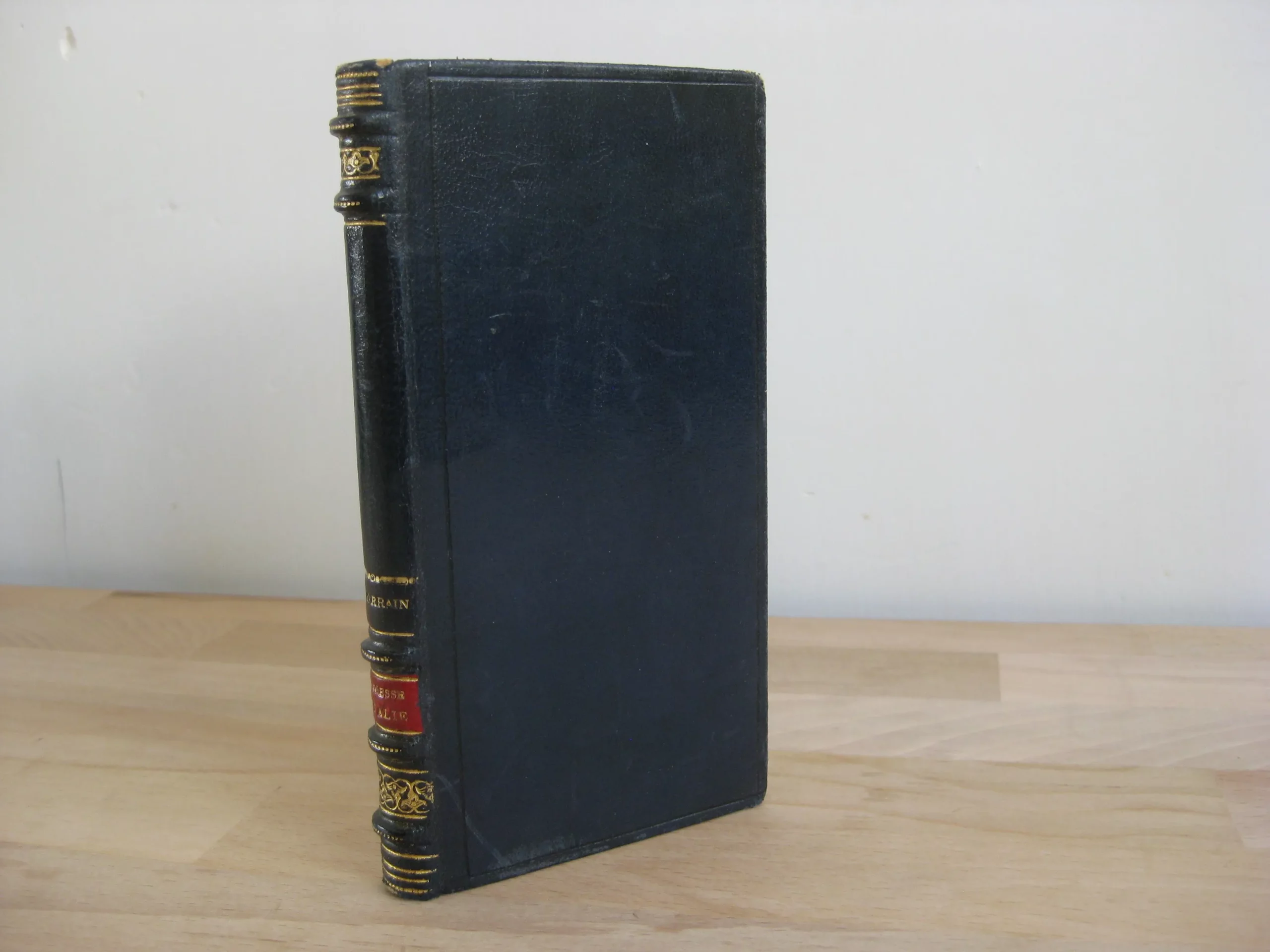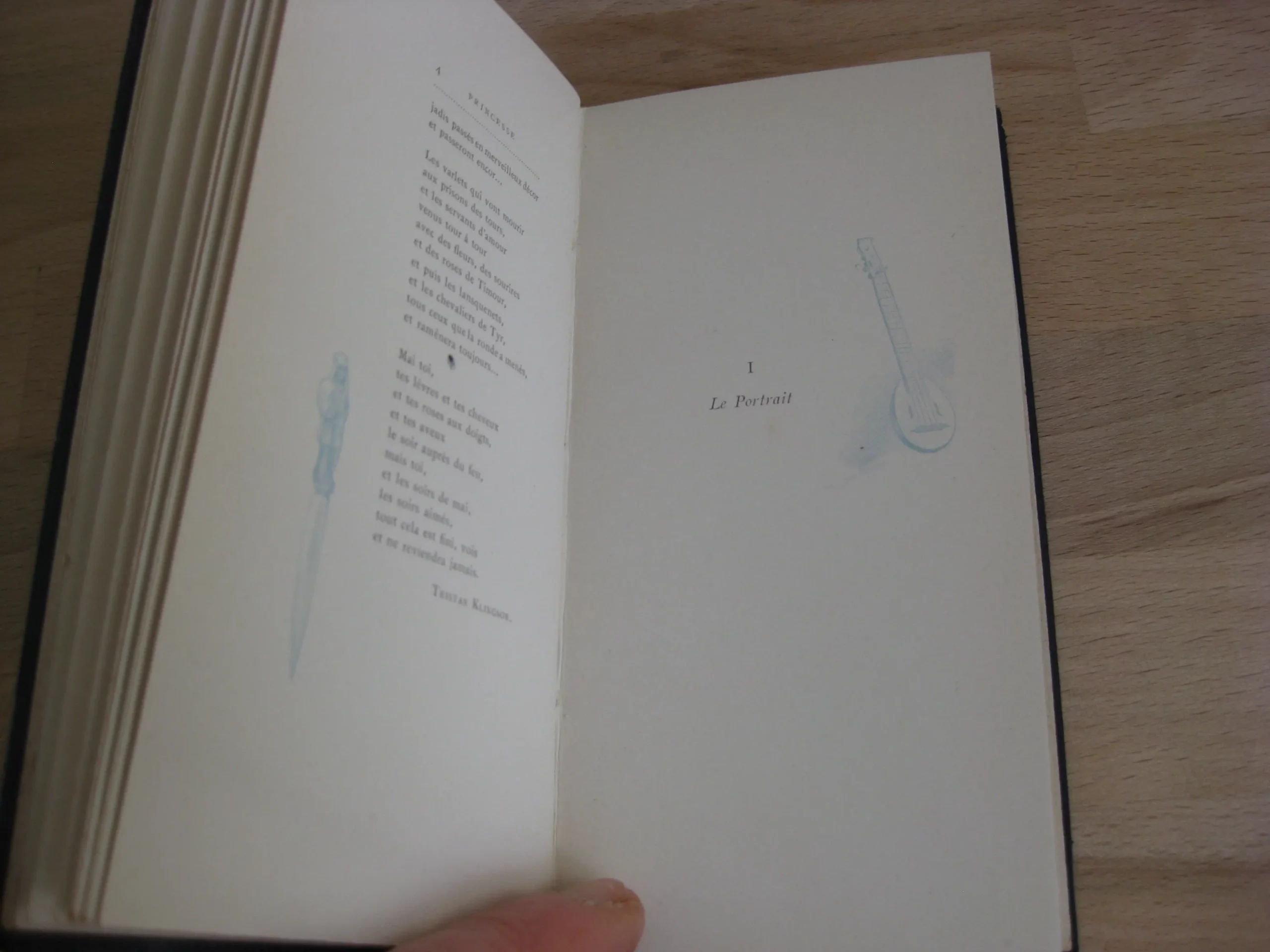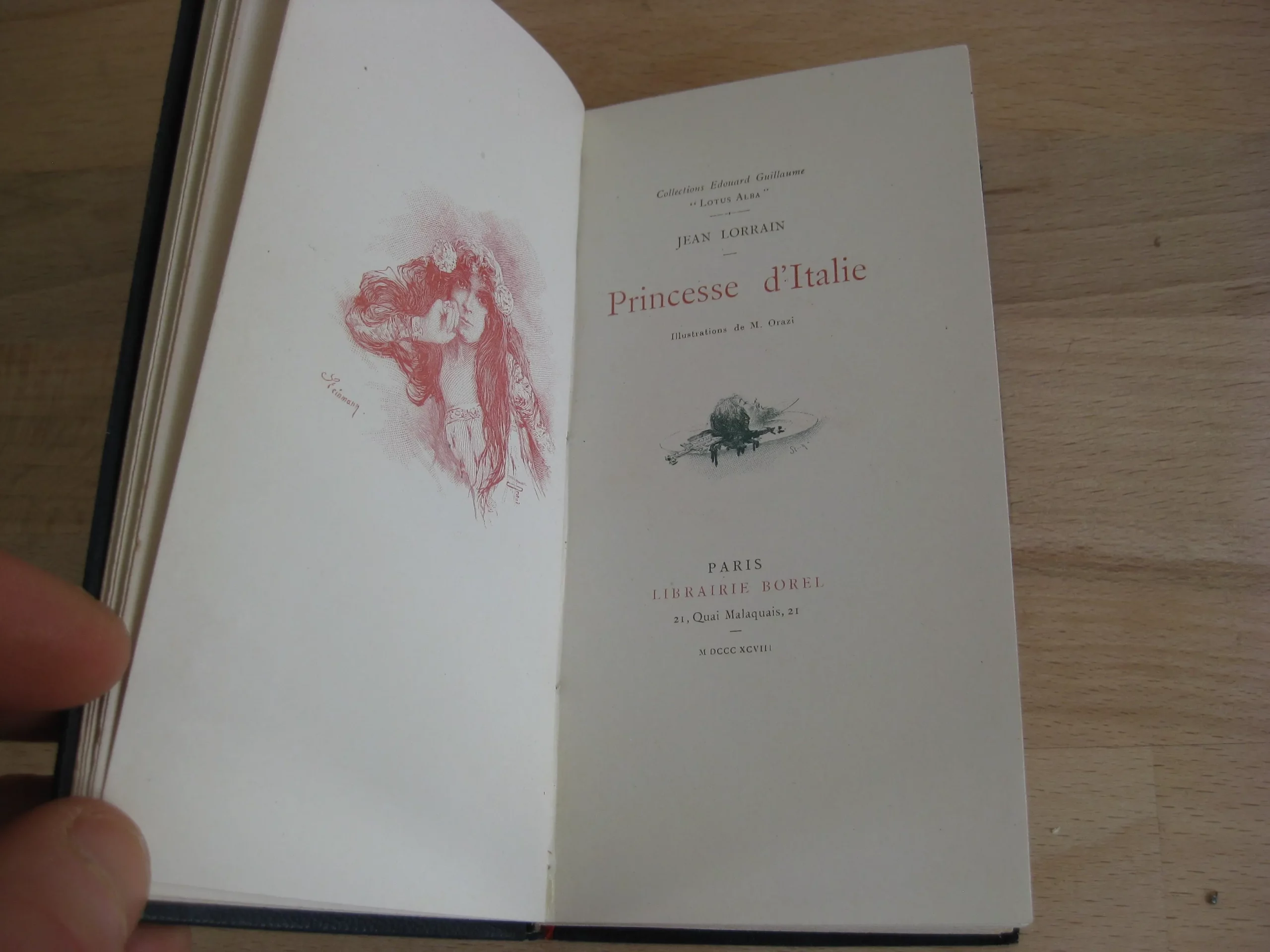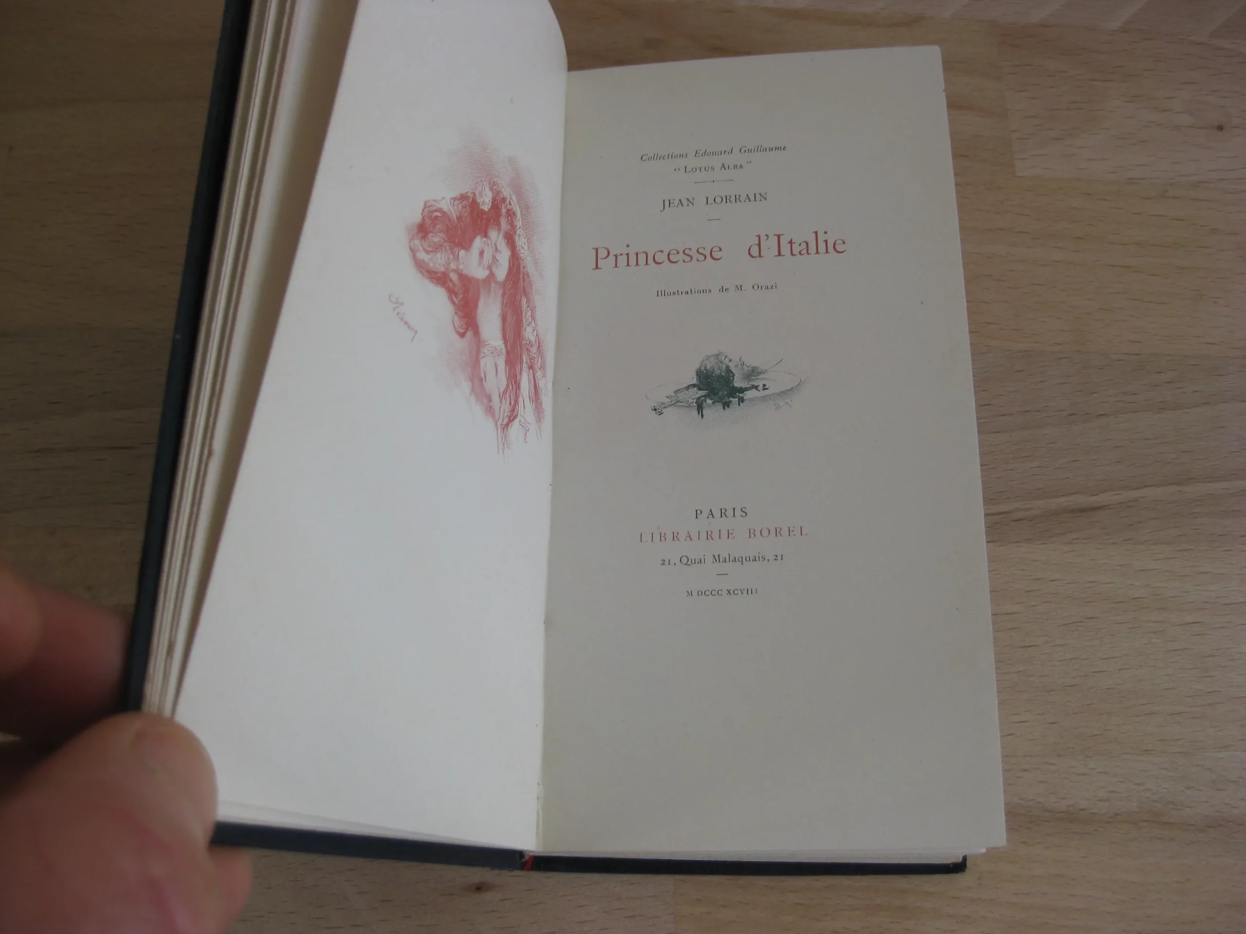 Pleine basane marine à dos romantique orné de 5 faux-nerfs, de liserés, frises et pièce de titre rouge, et de l’auteur estampé doré, tranche de tête dorée, couverture couleur conservée, signet rouge, 140 x 77, 78p. 1898. Collection Edouard Guillaume « Lotus Alba ». Illustrations de Manuel Orazi. ; page de titre illustrée, frontispice sanguine, 5 pleine page et des illustrations couleur en tête et en marge. Exemplaire non numéroté. Intérieur très bon, propre et intègre. Coins frottés avec épidemures. Plats avec griffes légères, dos très bons, épidermure en coiffe. Bel exemplaire bien ferme.