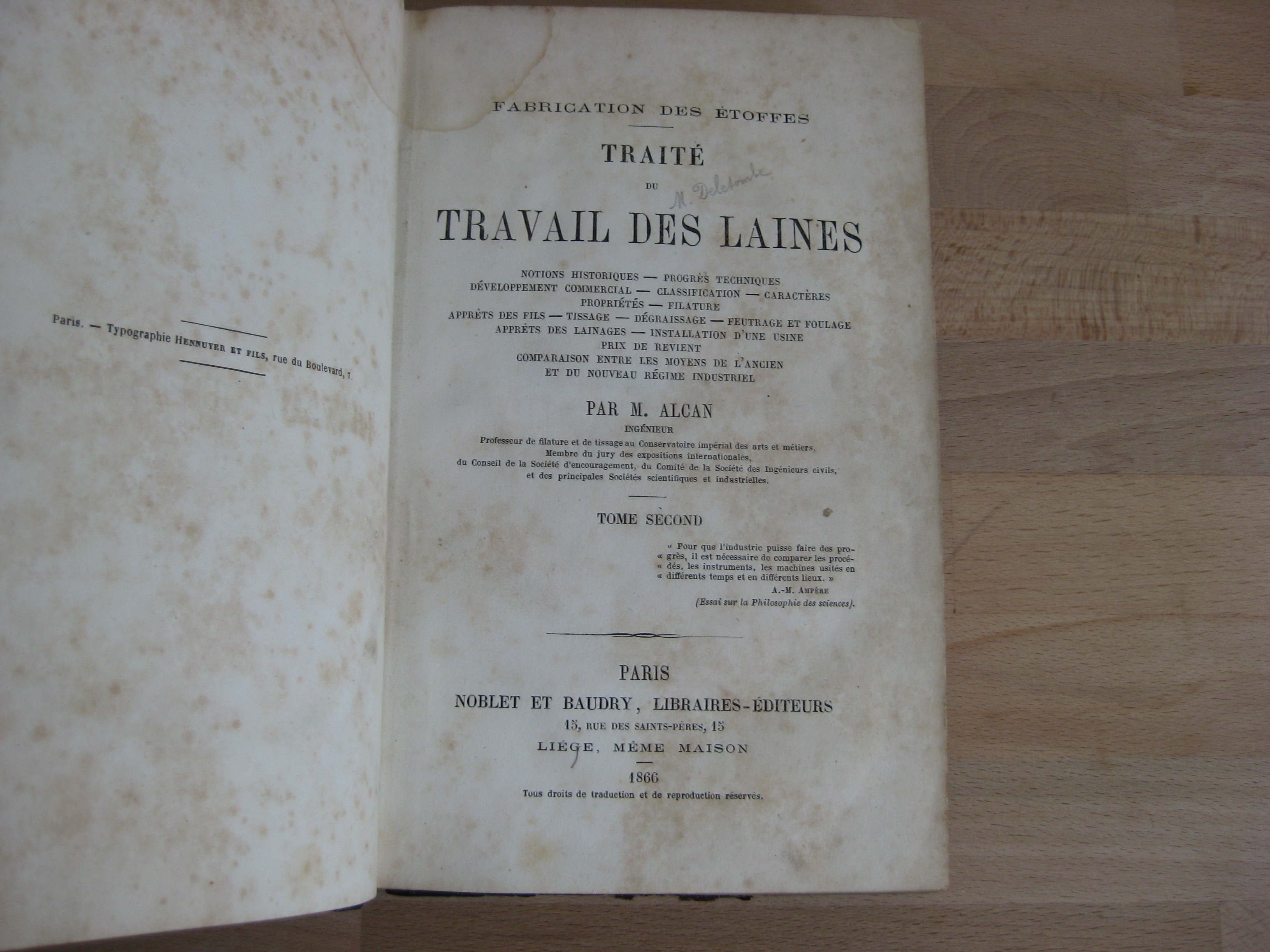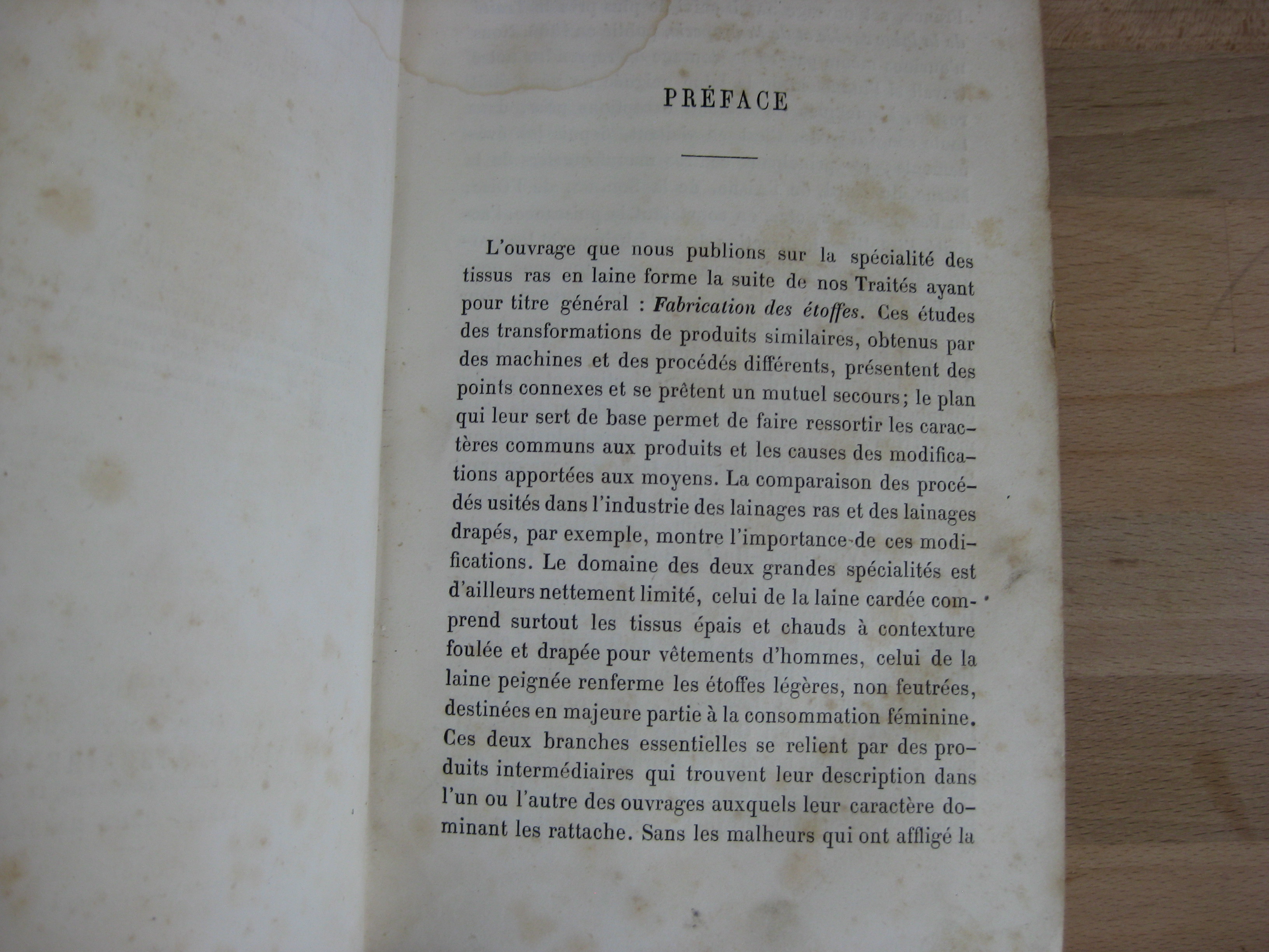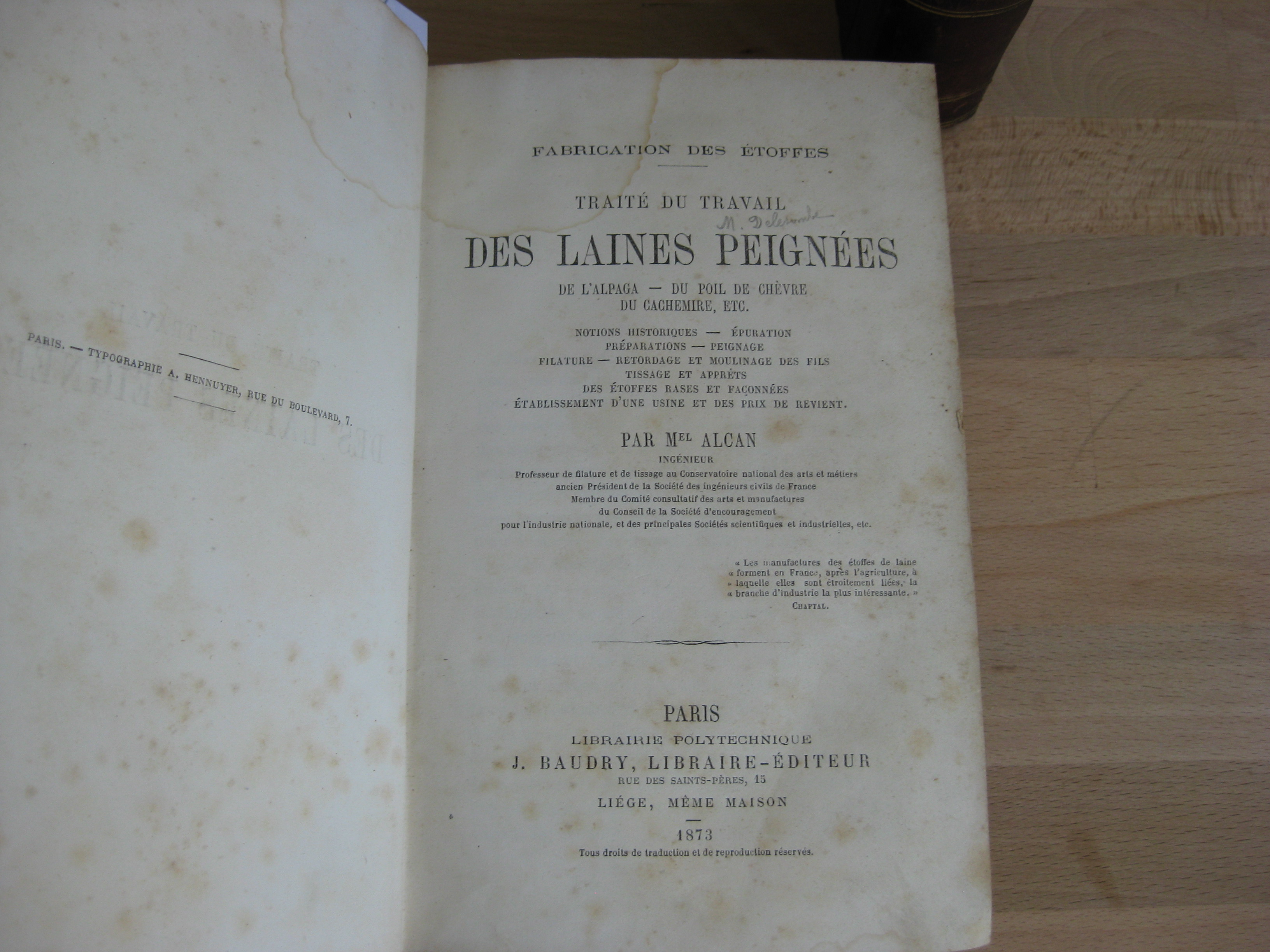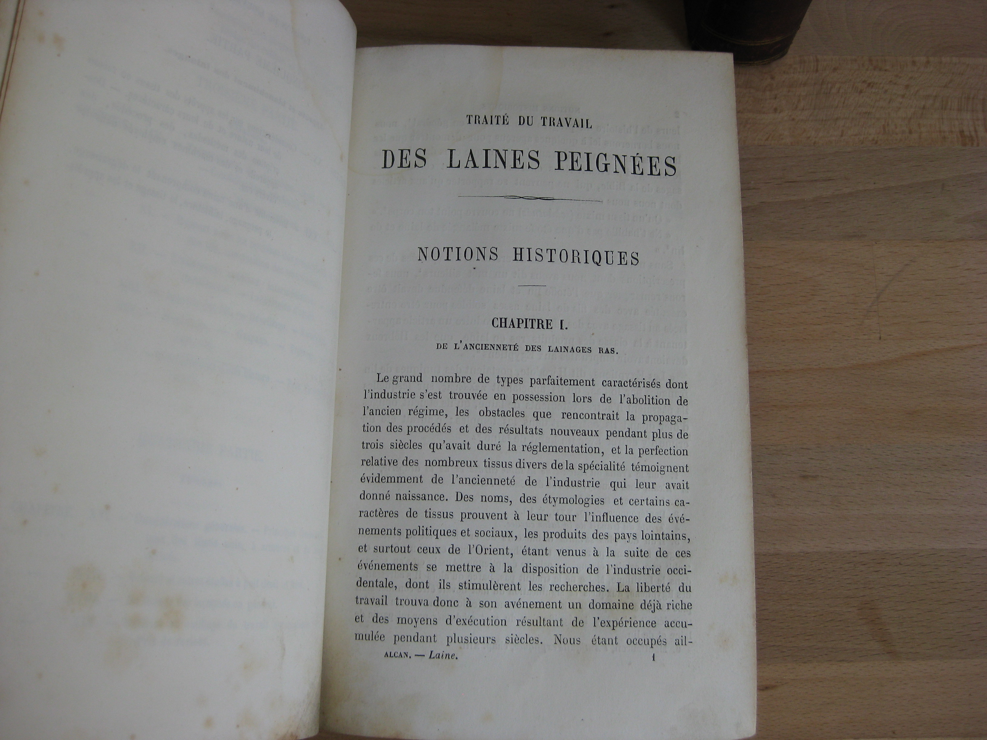 Michel Alcan – Demi-veau brun à dos long, liserés, orné des titre et auteur, 215 x 136, 679p. Avec table. 1873. Édition originale. Des rousseurs. Des épidermures à la reliure, mais bon exemplaire, bien ferme. Nous joignons du même dans la même reliure et dans la série « Fabrication des étoffes » : Traité du travail des laines, tome second, 441p. 1866. Egalement en stock du même : Traité complet de filature du coton, 2 volumes (un volume de texte et un atlas)