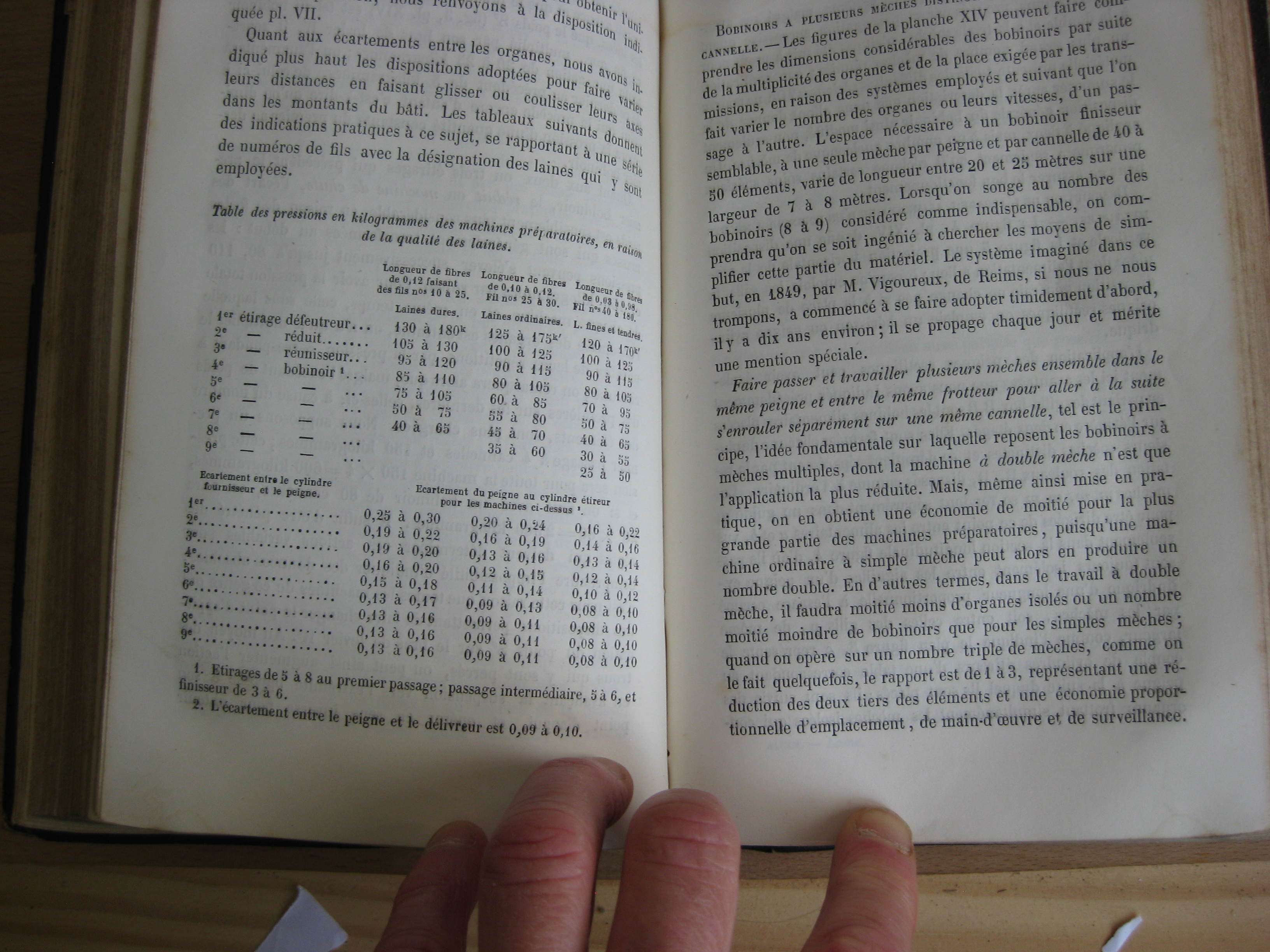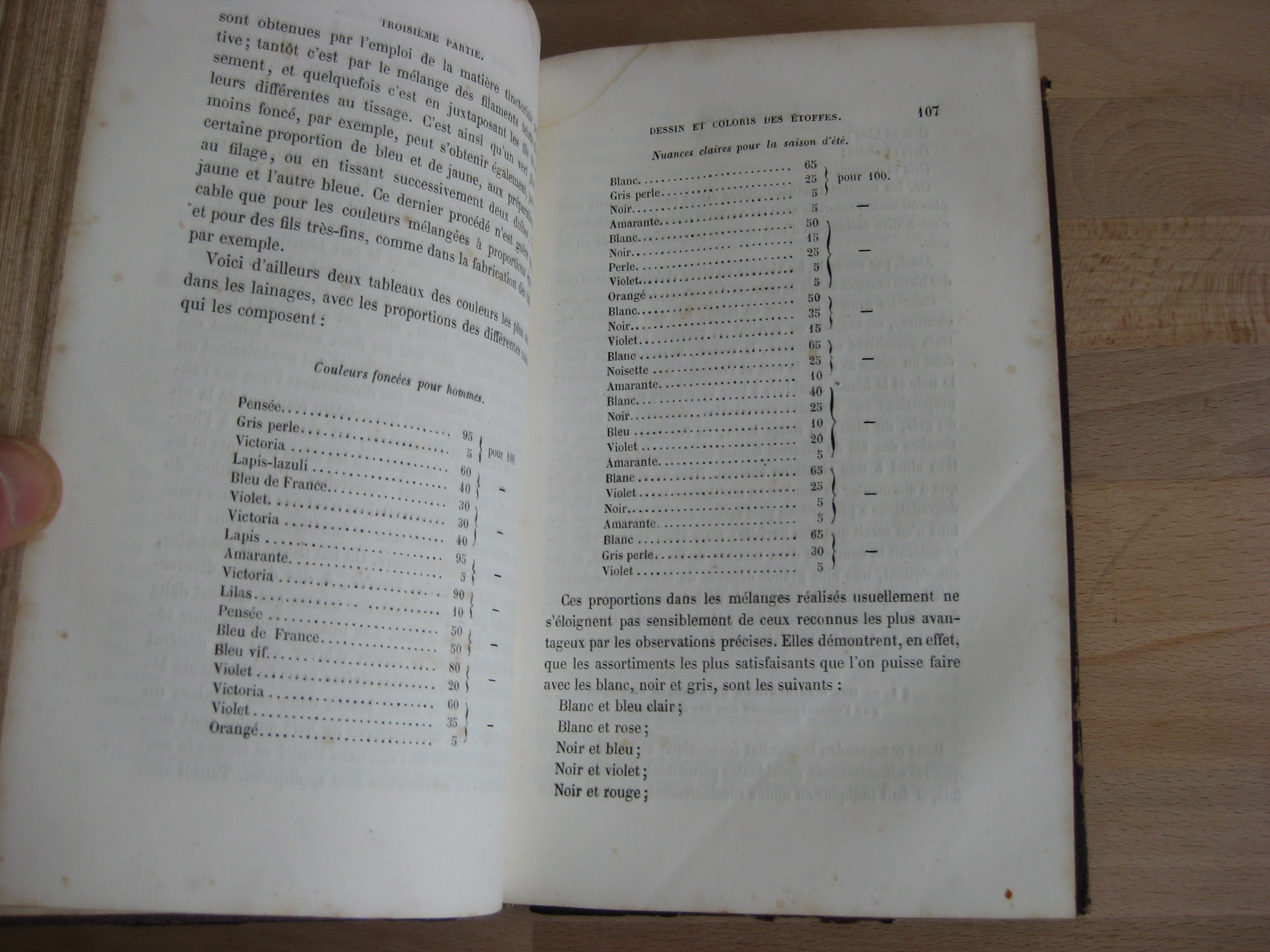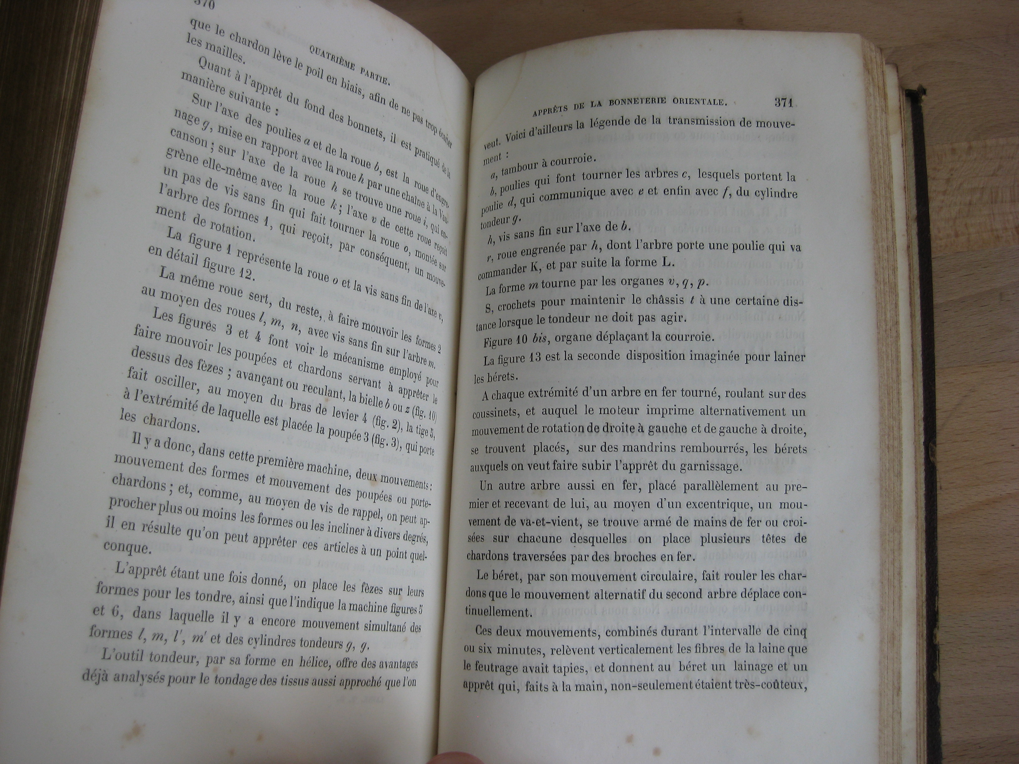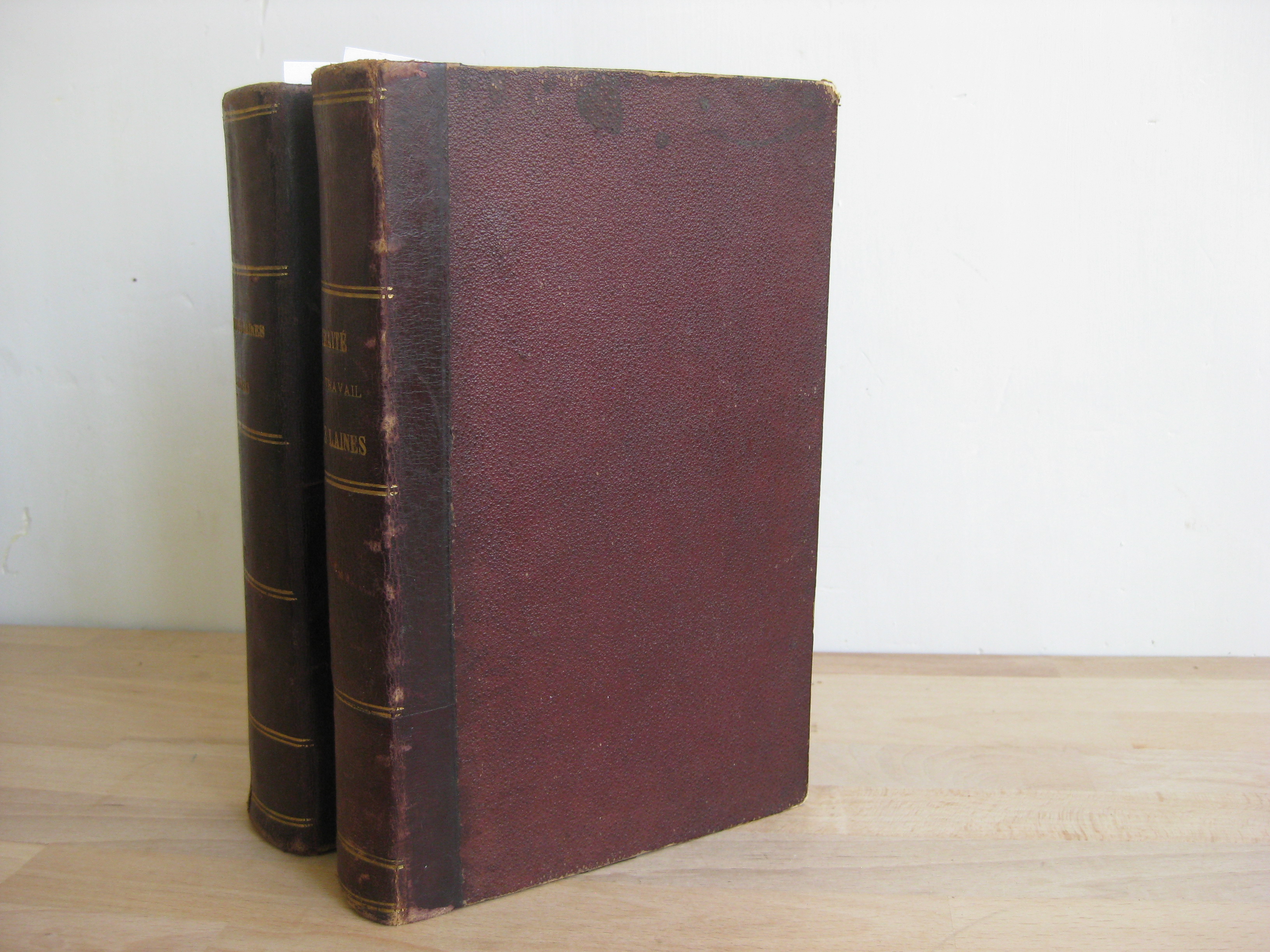 Michel Alcan – Demi-veau brun à dos long, liserés, orné des titre et auteur, 215 x 136, 679p. Avec table. 1873. Édition originale. Des rousseurs. Des épidermures à la reliure, mais bon exemplaire, bien ferme. Nous joignons du même dans la même reliure et dans la série « Fabrication des étoffes » : Traité du travail des laines, tome second, 441p. 1866. Egalement en stock du même : Traité complet de filature du coton, 2 volumes (un volume de texte et un atlas)