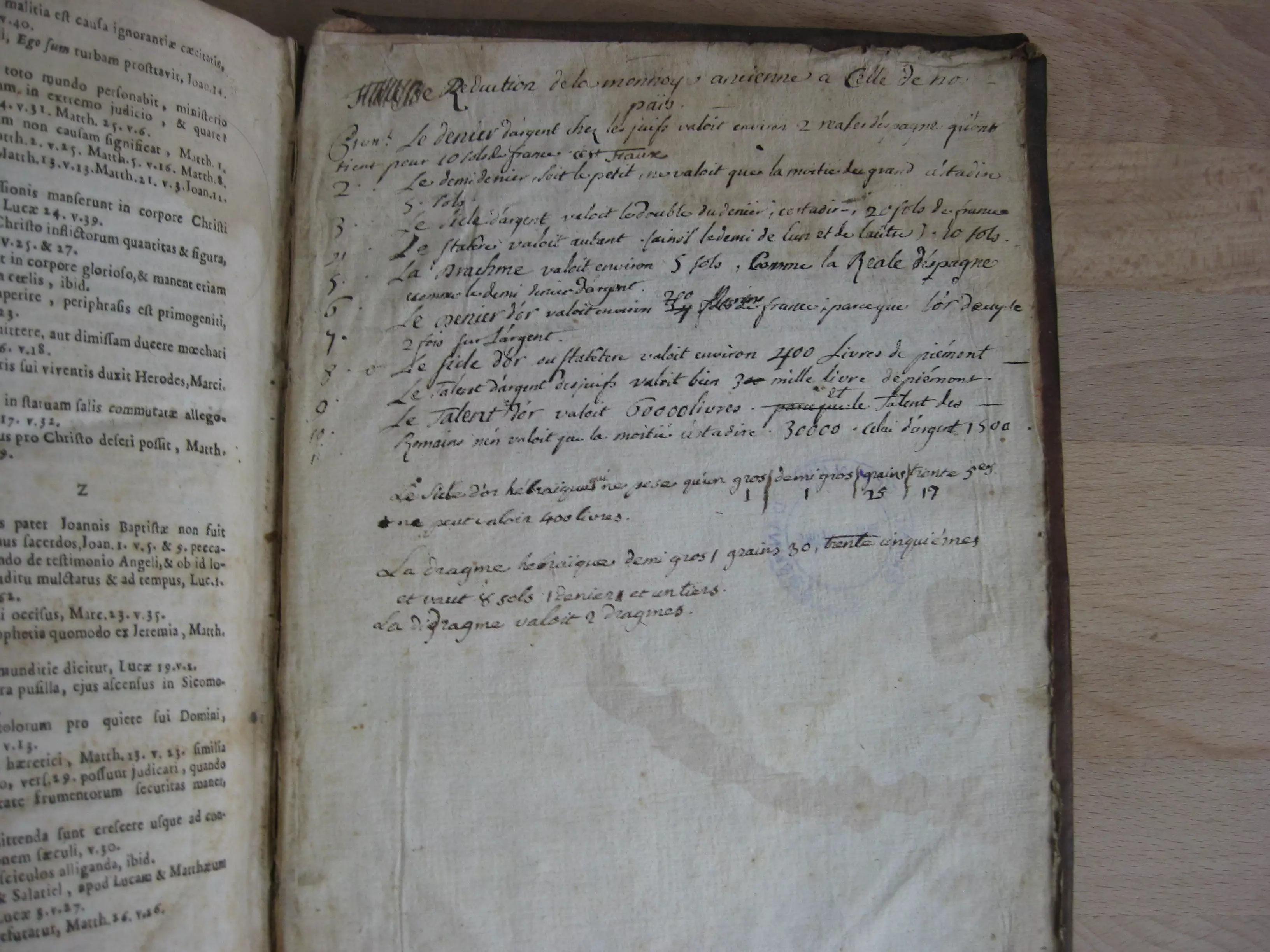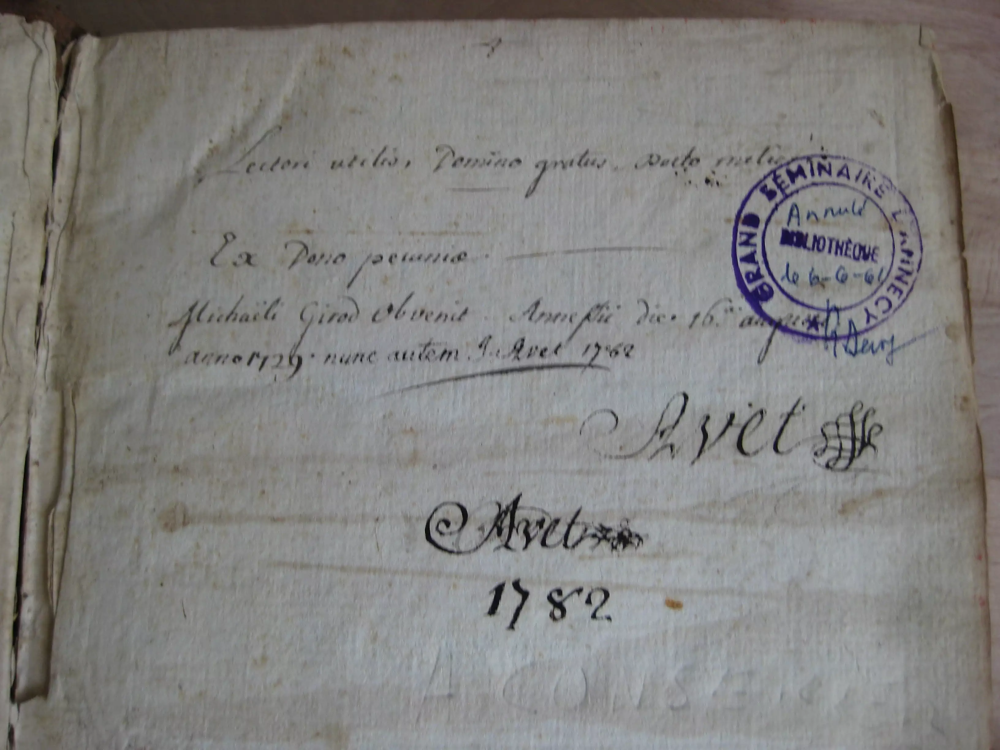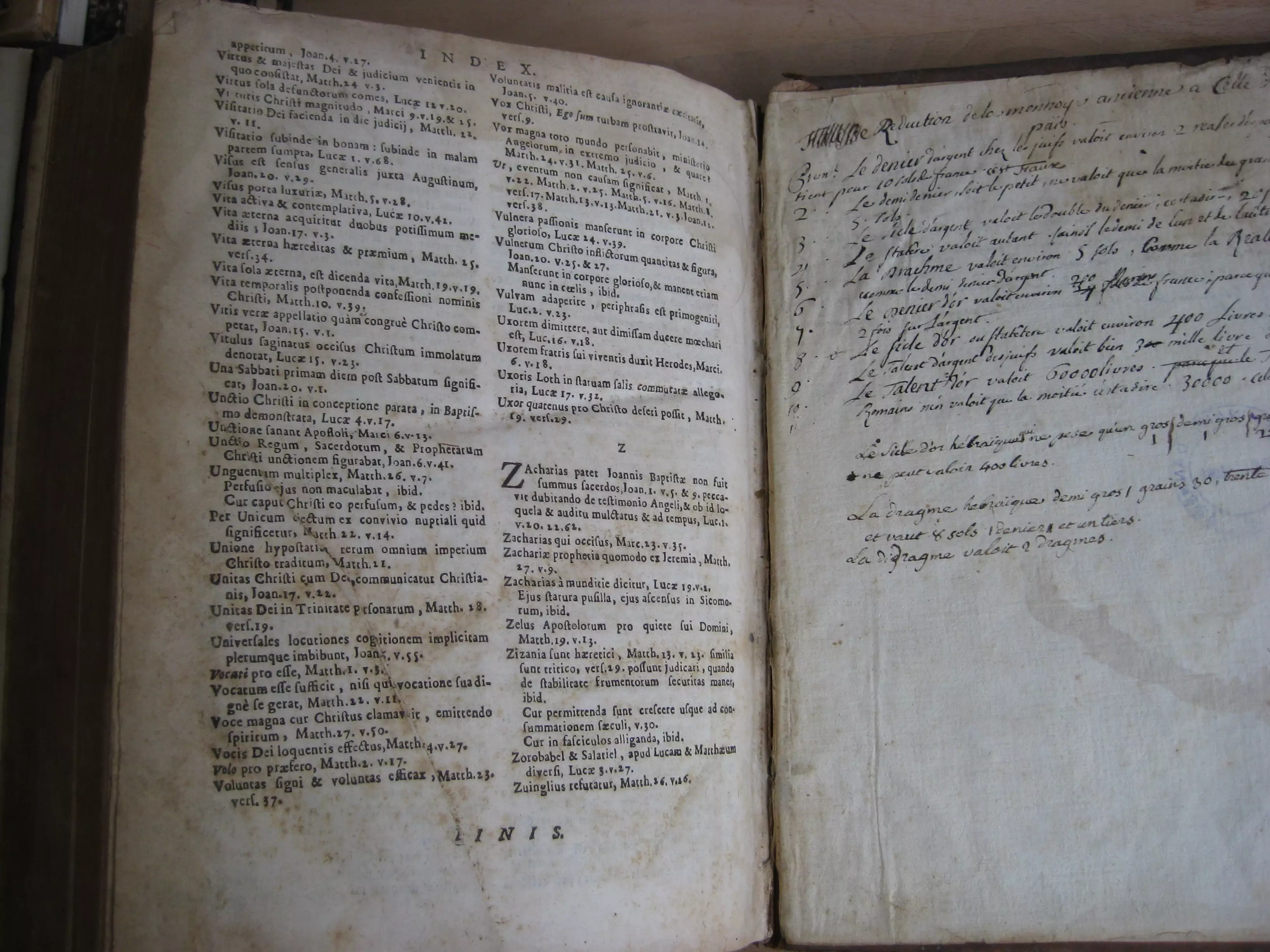 Exemplaire enrichi en garde d’un ex-dono latin manuscrit, de l’ex-libris manuscrit du donataire, et un cachet du Grand Séminaire d’Annecy, répété au titre et en dernière page. Exemplaire également enrichi au recto et verso de cette dernière page de deux textes manuscrits en français : au recto, « Réduction de la monnoye ancienne à celle de nos païs », (18 lignes abordant le denier d’argent, demi-denier, drachme, denier d’or, sicle hébraïque, etc. ; au verso : au verso « Remarques [sur la ] vie des pharisiens extérieure » (9 lignes).