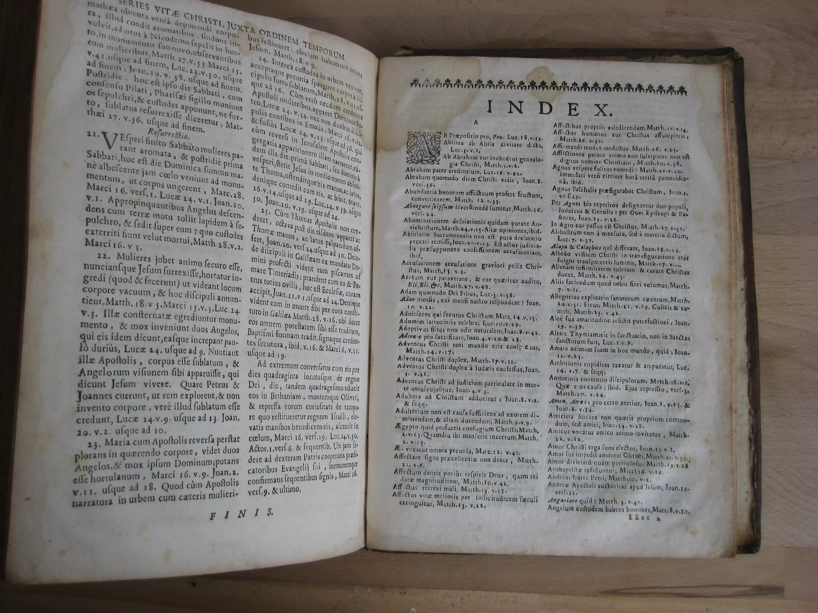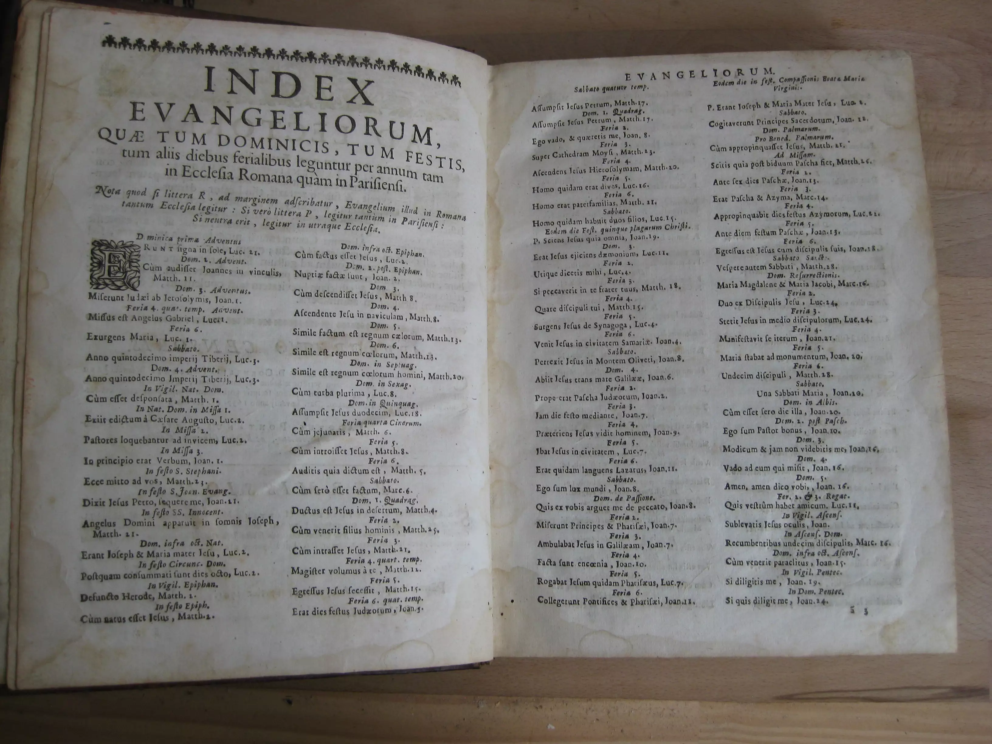 Plein veau, dos à cinq nerfs orné d’une pièce de titre, caissons décorés, 240 x 183, 586p. Suivi de l’index, 28p. 1703. Editio nova accuratior, et à quamplurimis mendis, quibus & terare scatebant, expurgata. Précédé avant la lettre : titre, adresse, approbation, et Index Evangeliorum, 7p. Texte sur deux colonnes.