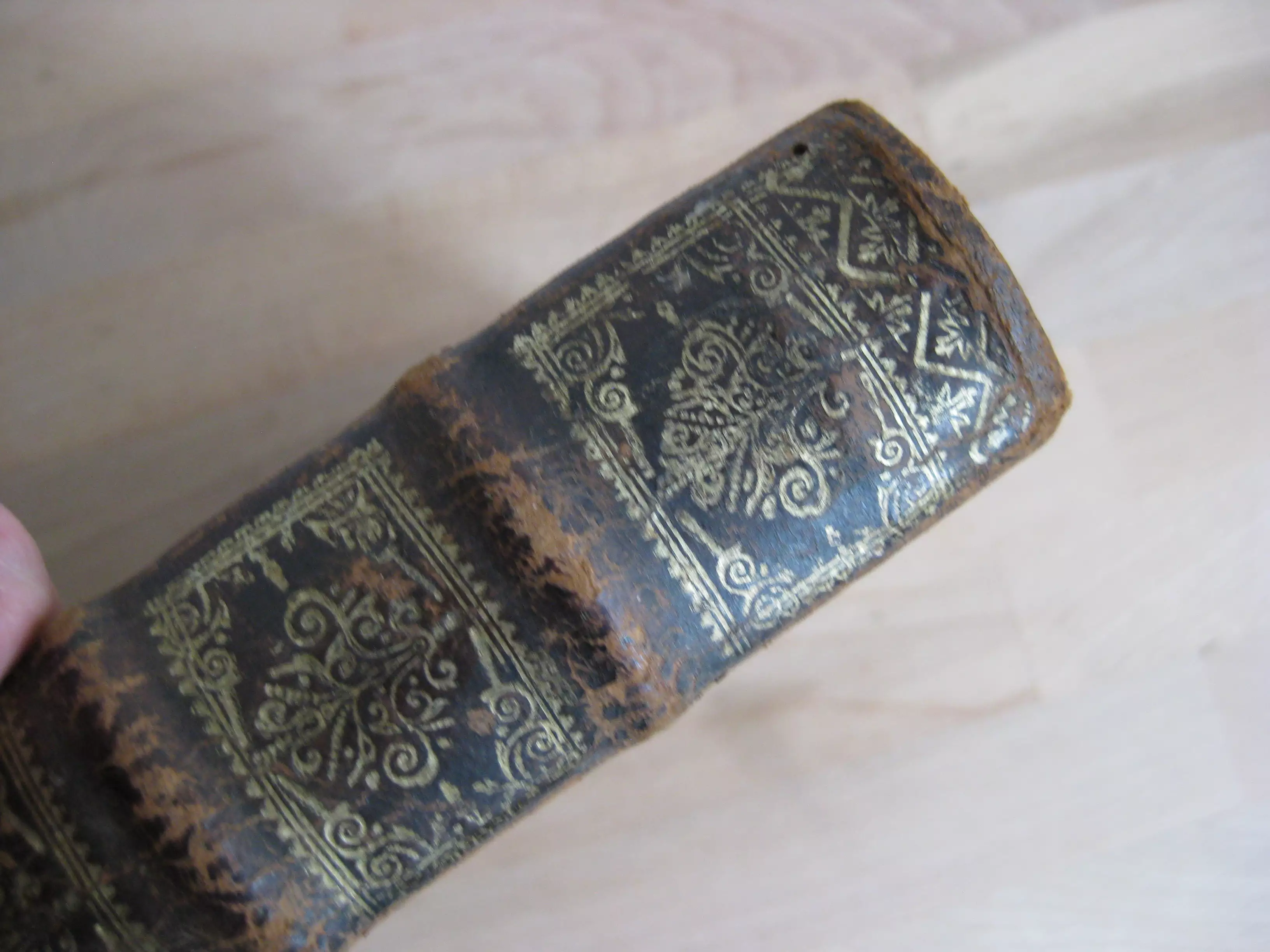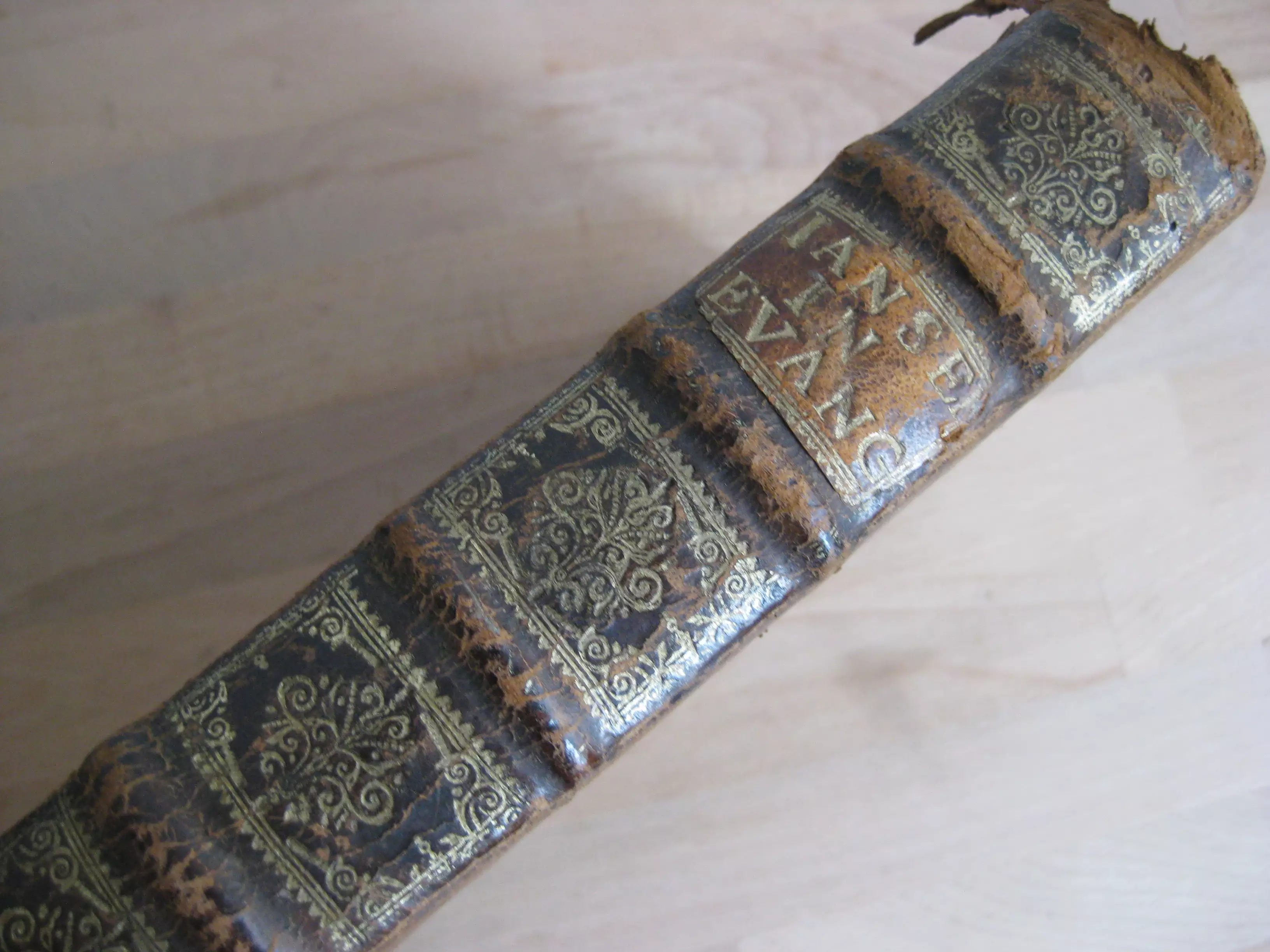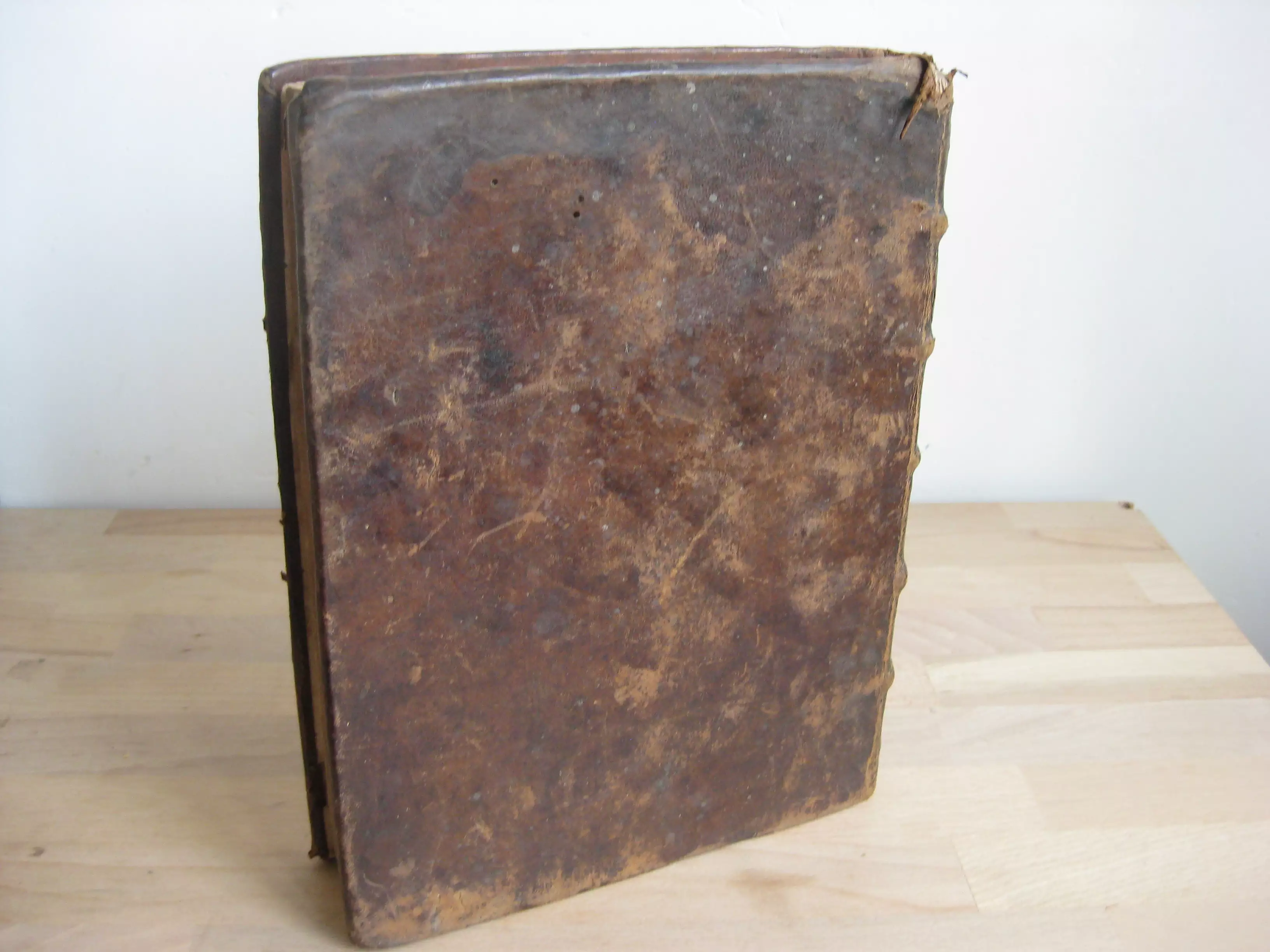 Rousseurs continues, plus fortes parfois en marge. Page de garde qui se détache en tête. Trace de mouillure en seconde partie de volume. Coins, champs et plats frottés avec épidermures, trois trous de vers en plat inférieur ; dos avec épidermures aux nerfs, coiffe et queue, avec coiffe en partie manquante. Exemplaire bien ferme.