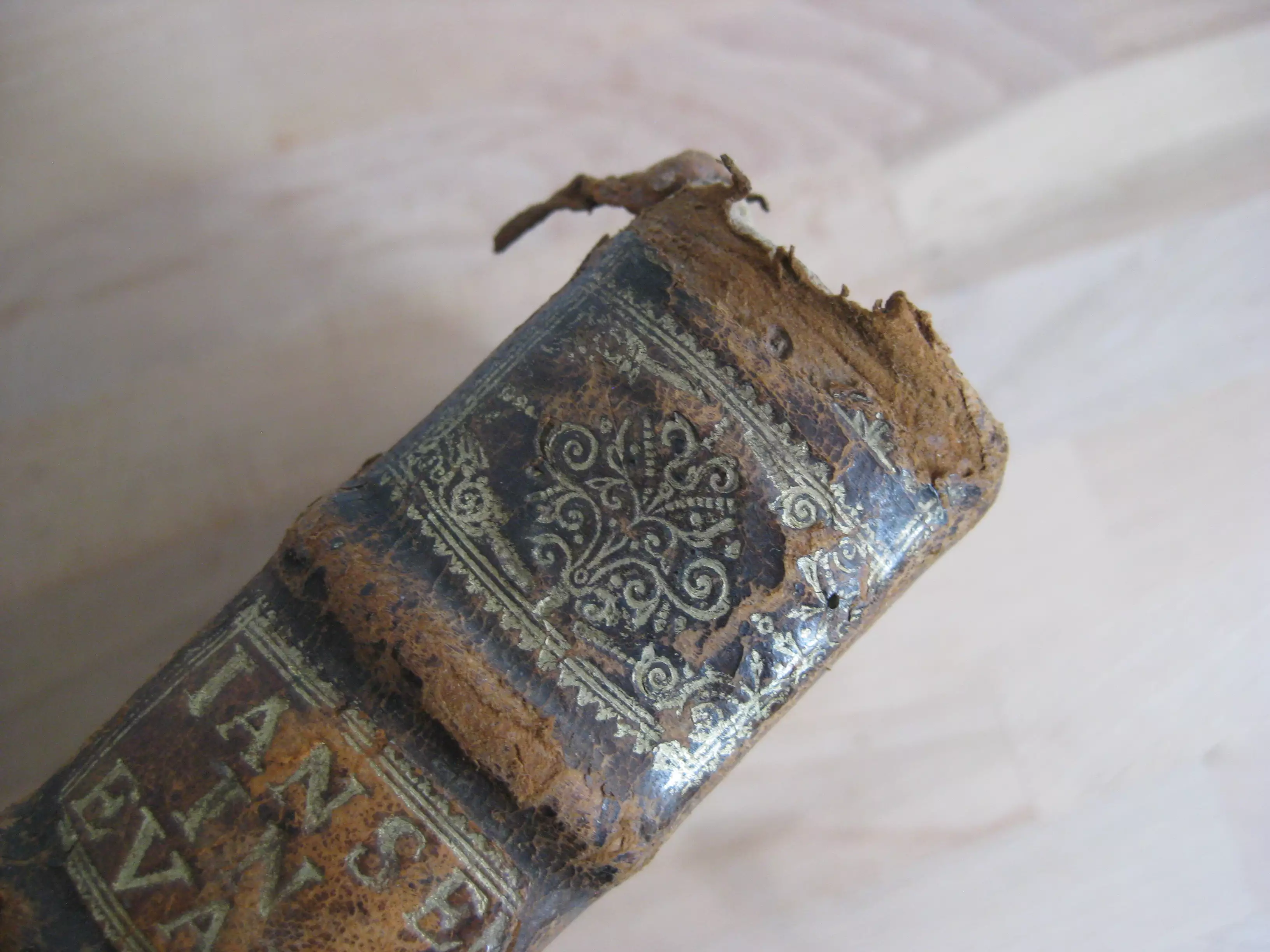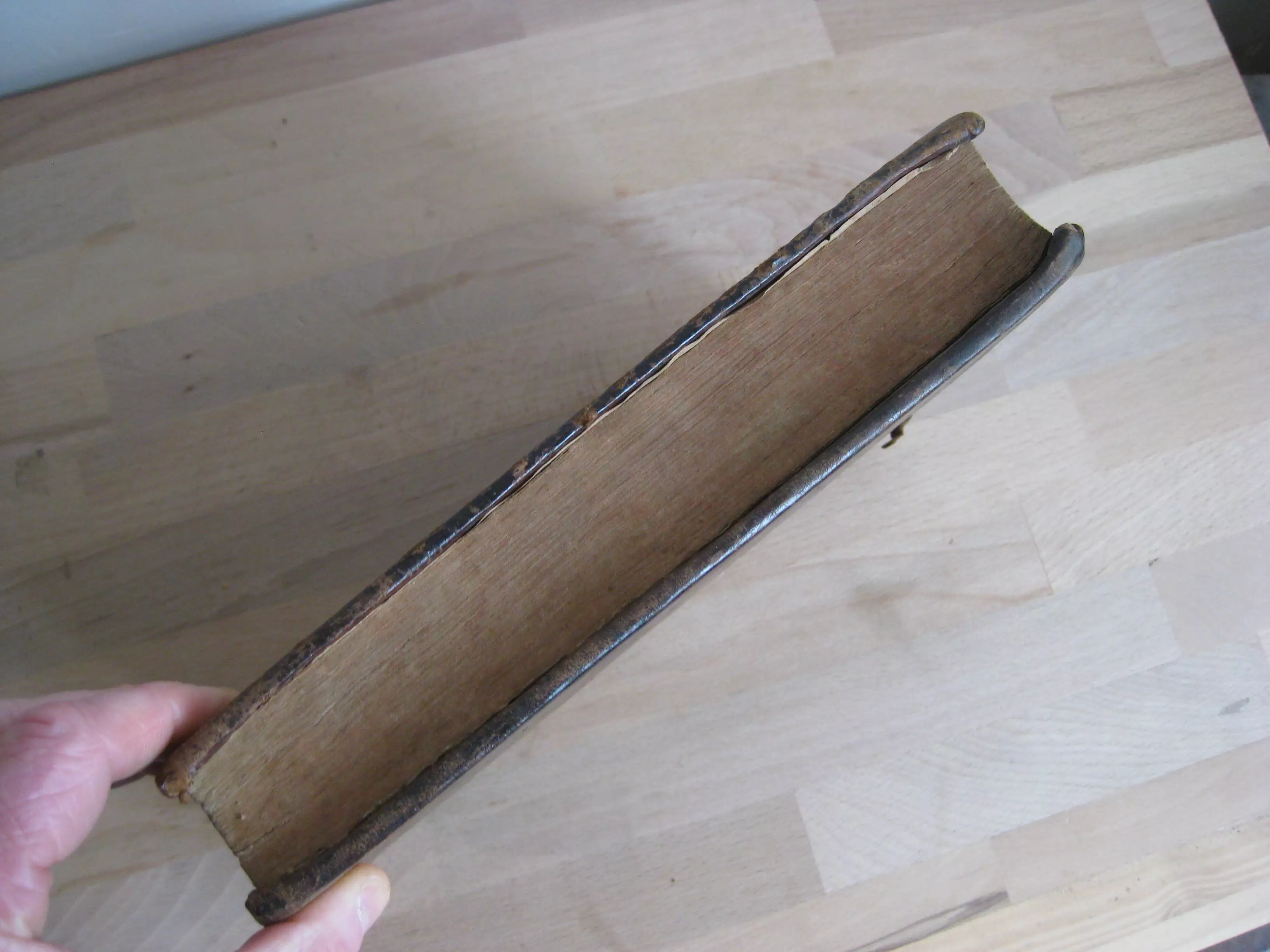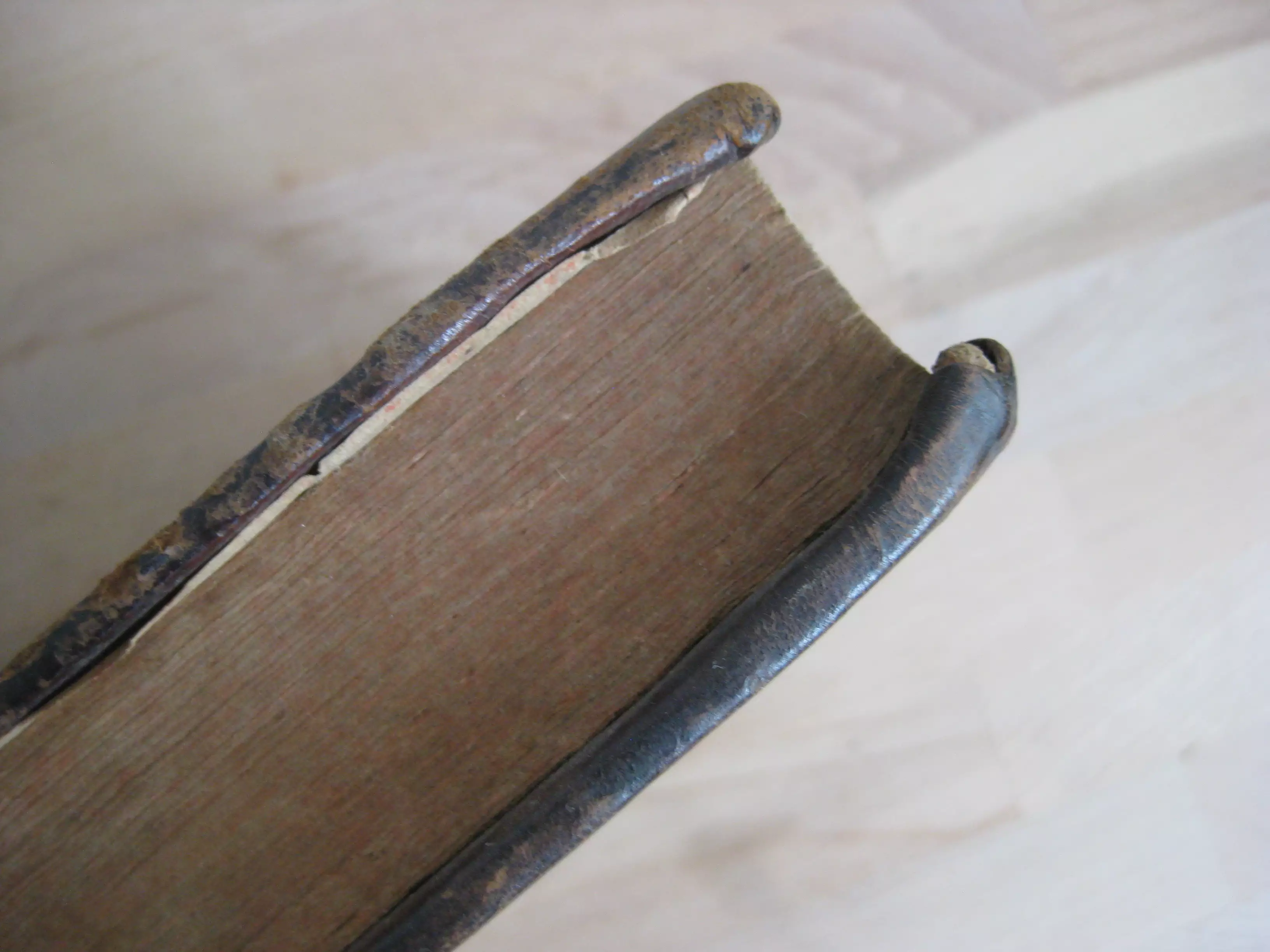 Rousseurs continues, plus fortes parfois en marge. Page de garde qui se détache en tête. Trace de mouillure en seconde partie de volume. Coins, champs et plats frottés avec épidermures, trois trous de vers en plat inférieur ; dos avec épidermures aux nerfs, coiffe et queue, avec coiffe en partie manquante. Exemplaire bien ferme.