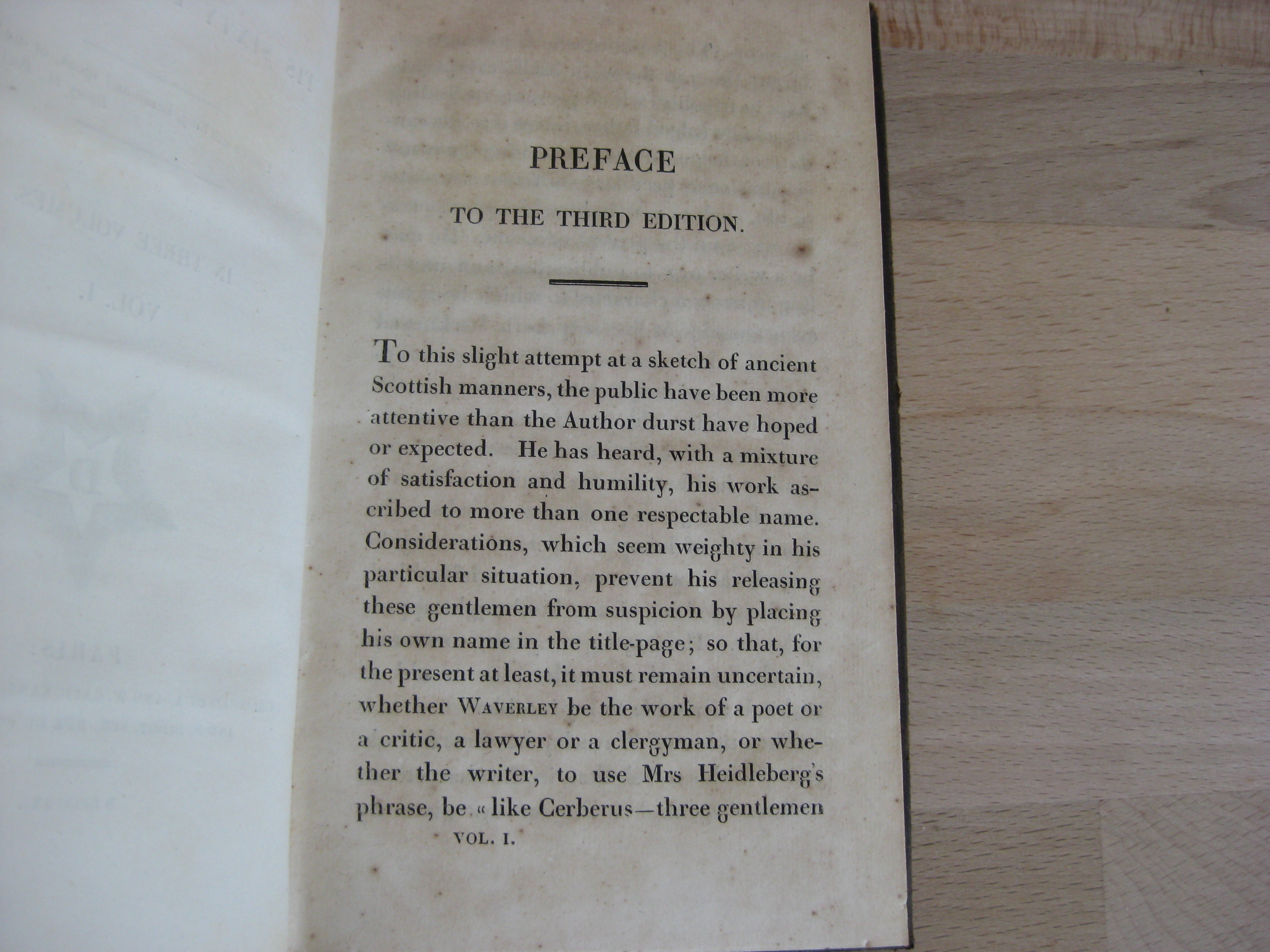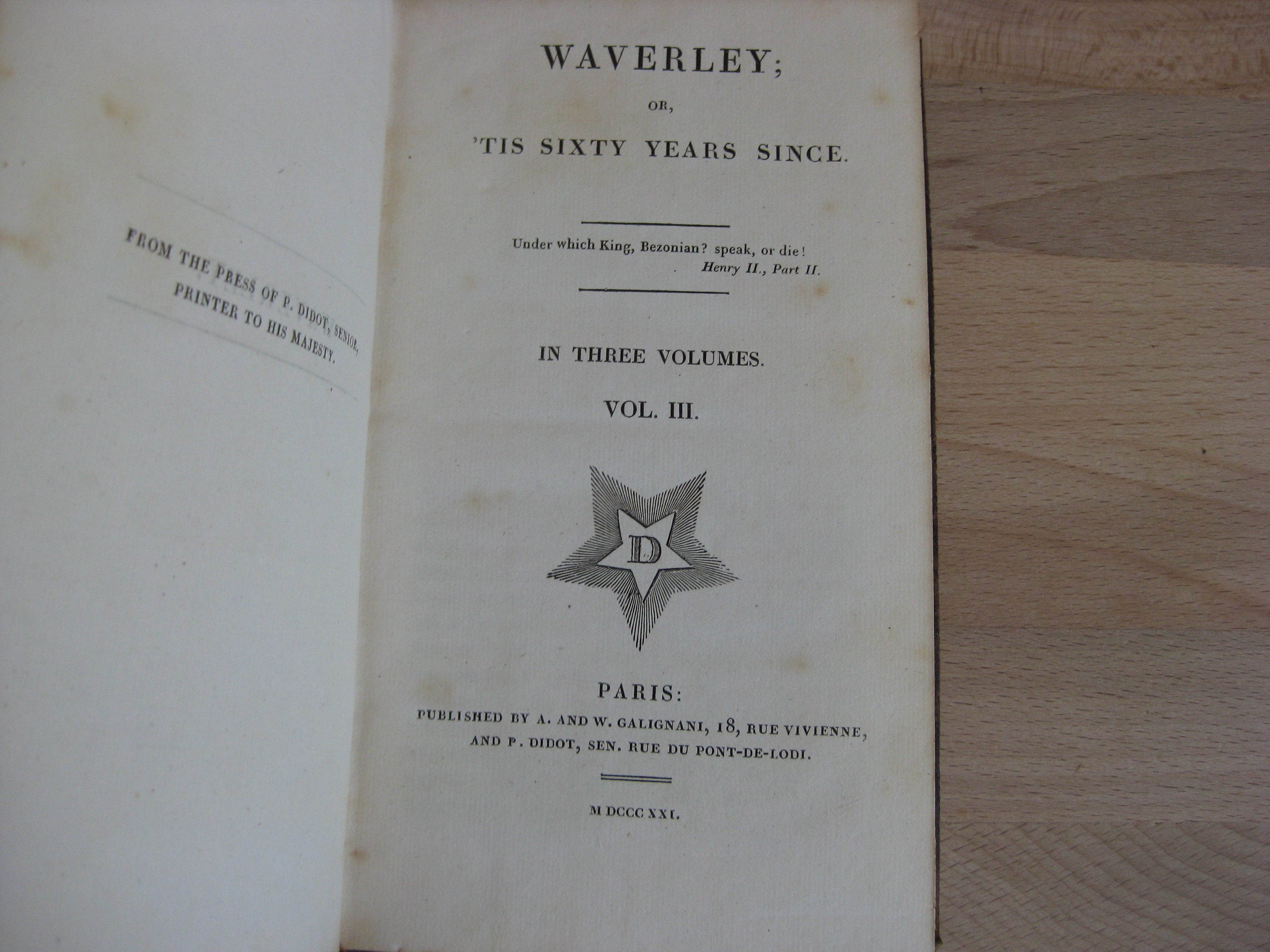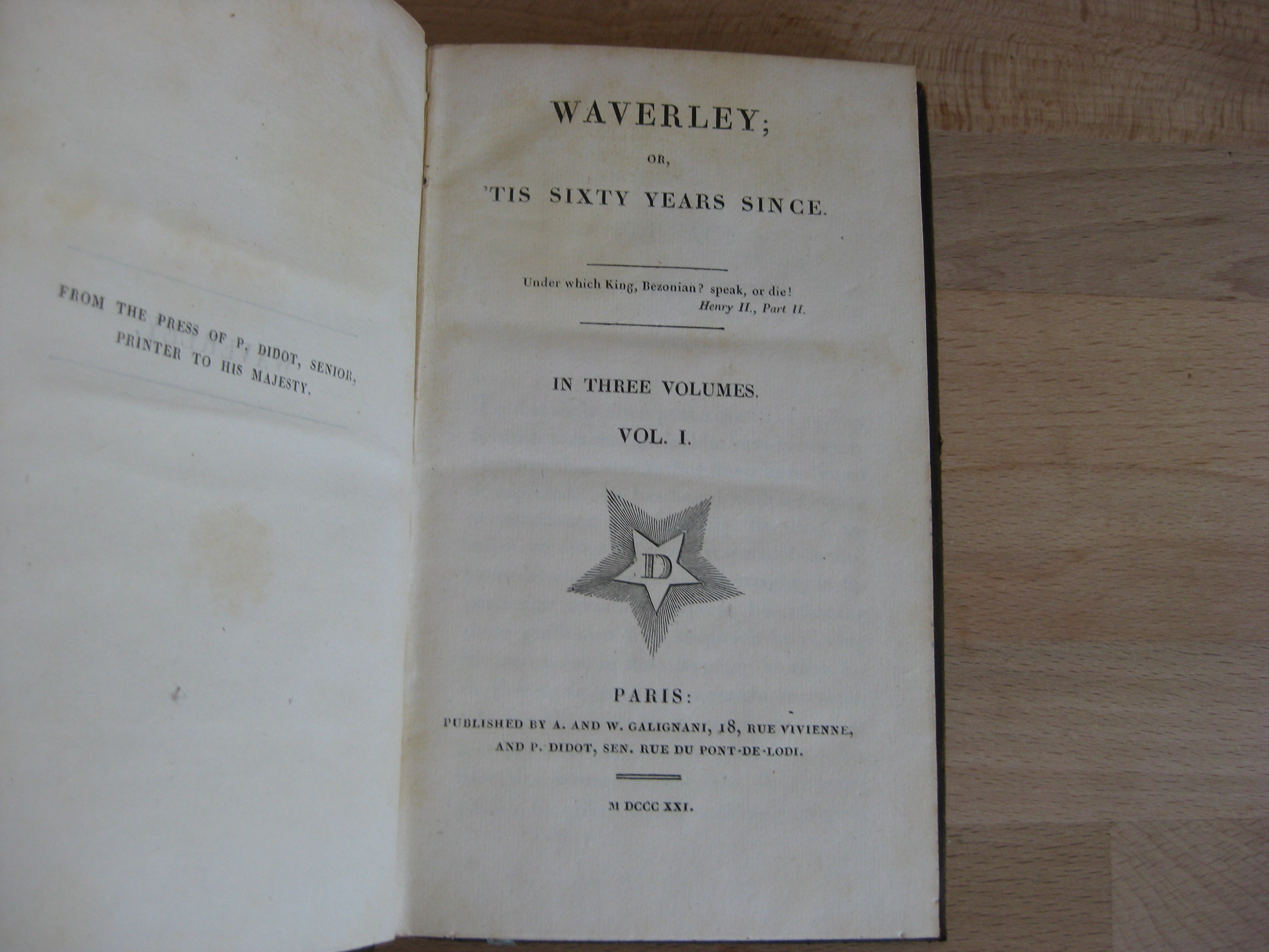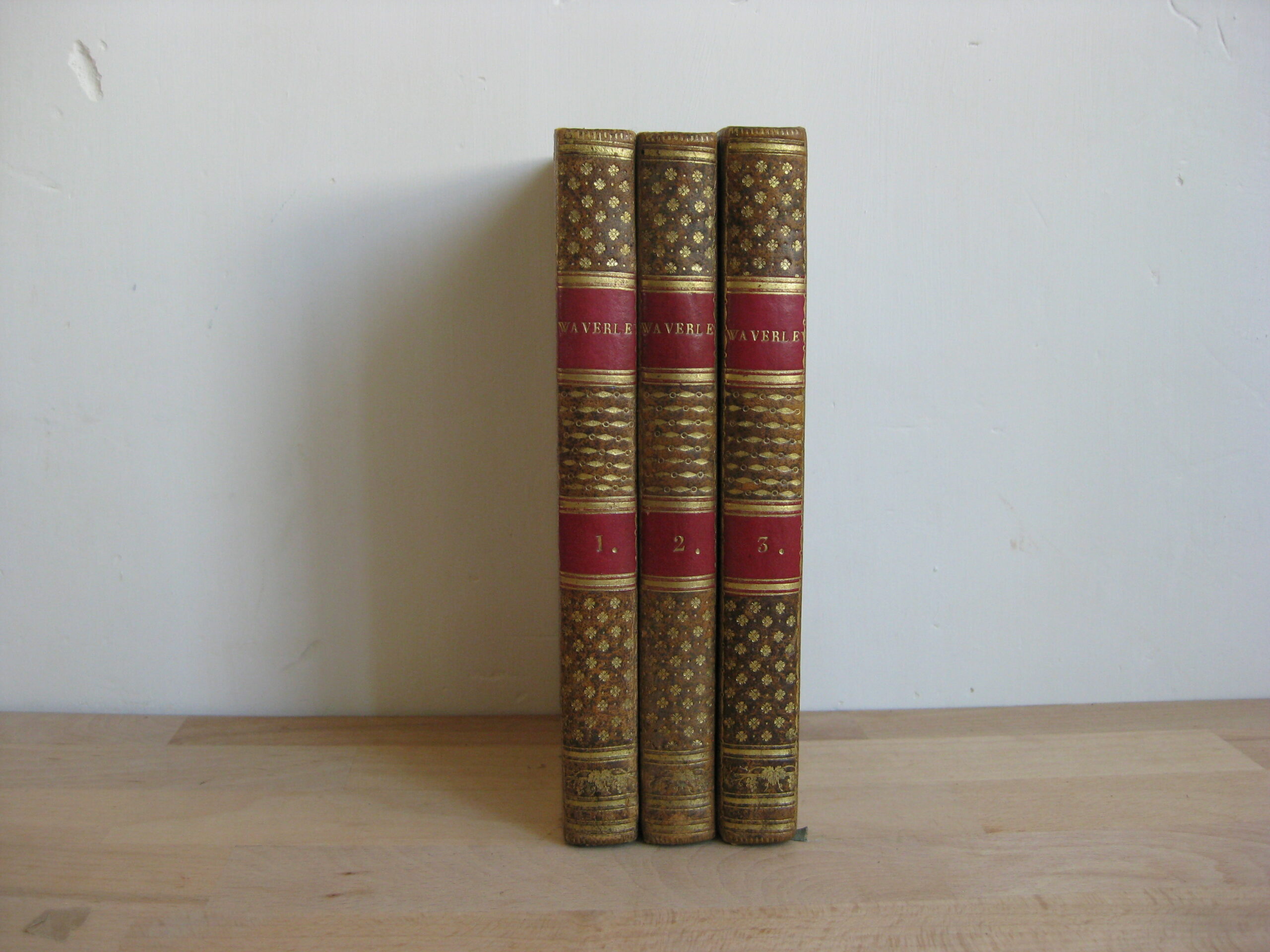 A. and W. Galignani – Plein veau marbré, dos long orné d’une pièce de titre et de tomaison en maroquin rouge, dos richement décoré frises et fleurons, plats à encadrement à liseré et frise, tranches jaspées, signet bleu-gris, 174 x 105, Third edition. 3 tomes. T1, Preface to the third edition, vi-viii, et 239p. TII, 247p. TIII, 248p. Rousseurs marginales, intérieurs propres. Coins, plats et champs frottés, avec épidermures, plats très bons ; mors et dos légèrement frottés mais très bons. Waverley ou l’Écosse il y a soixante ans est une oeuvre importante dans l’histoire de la littérature. Premier roman de l’auteur paru anonymement en 1814, il est considéré par G. Lukacs comme le premier roman historique de « forme classique. Également en stock dans la même reliure :Essays ; Woodstock ; Guy Mannering ; Kennilworth ; Peveril of the Peak