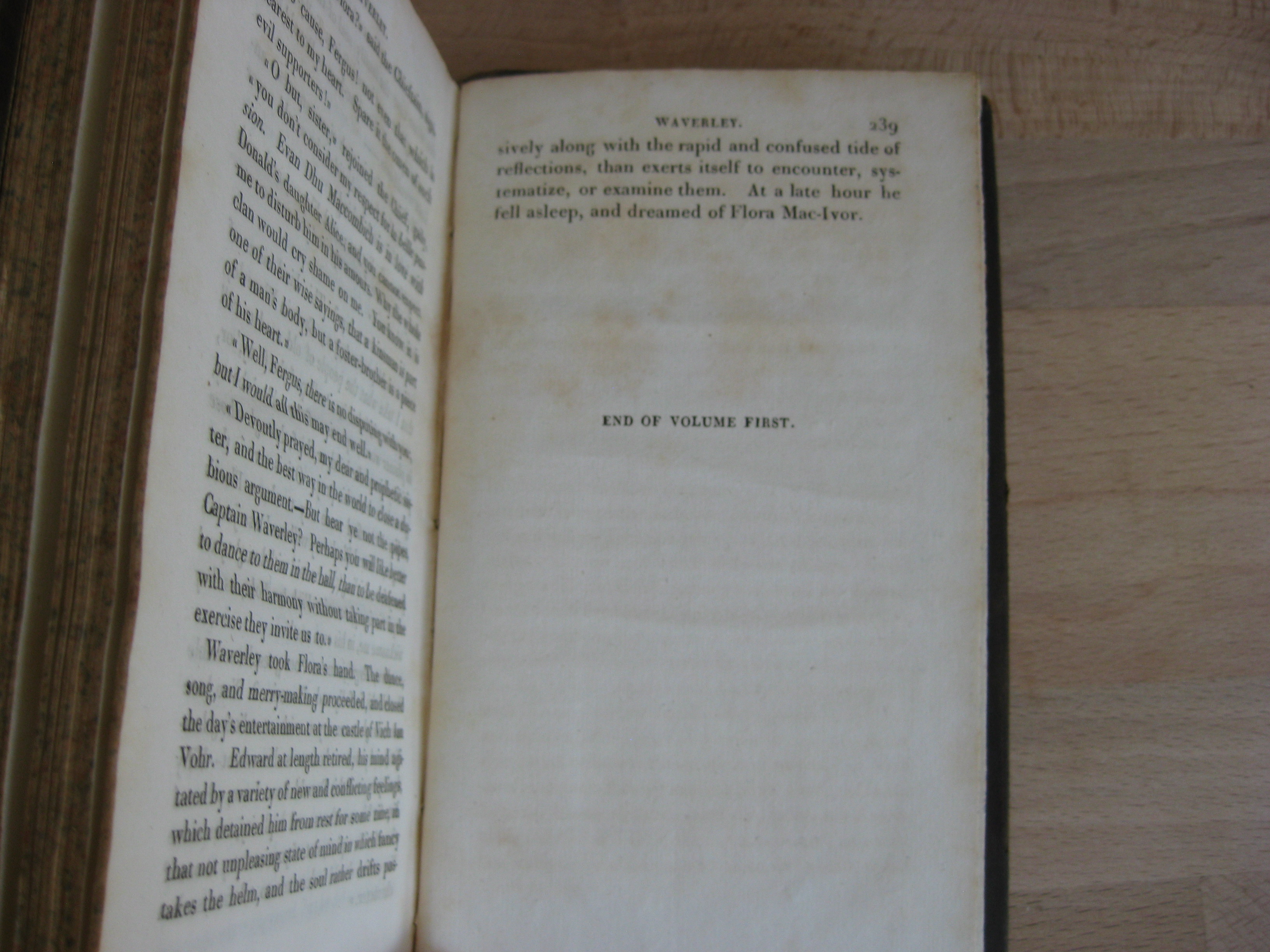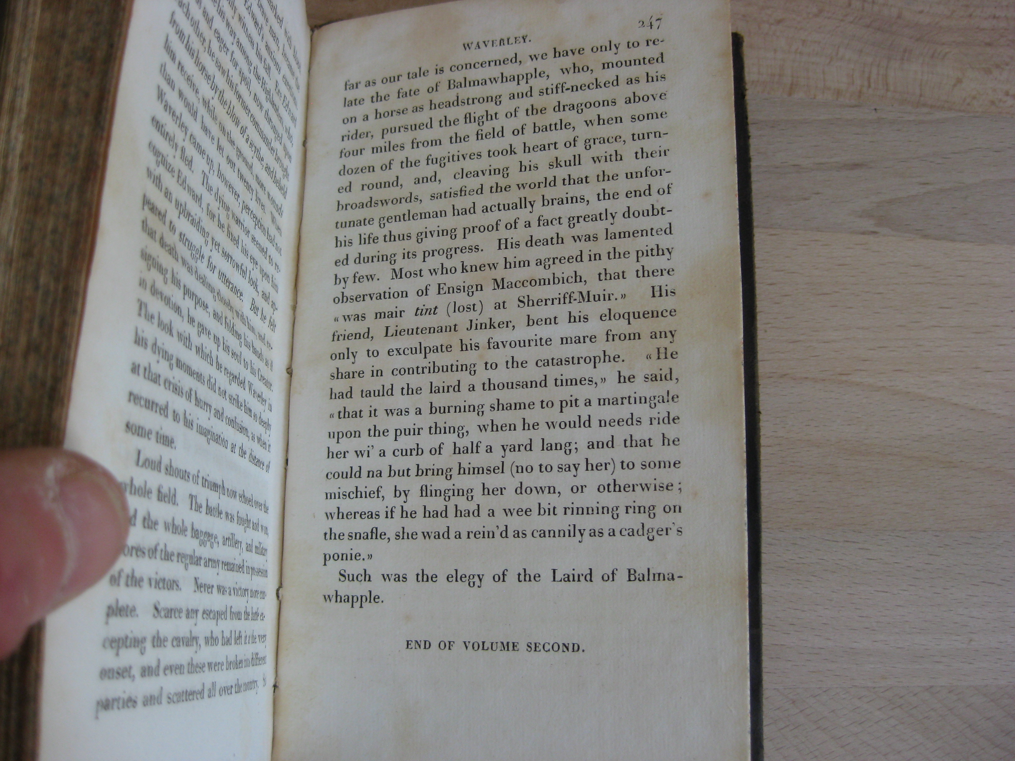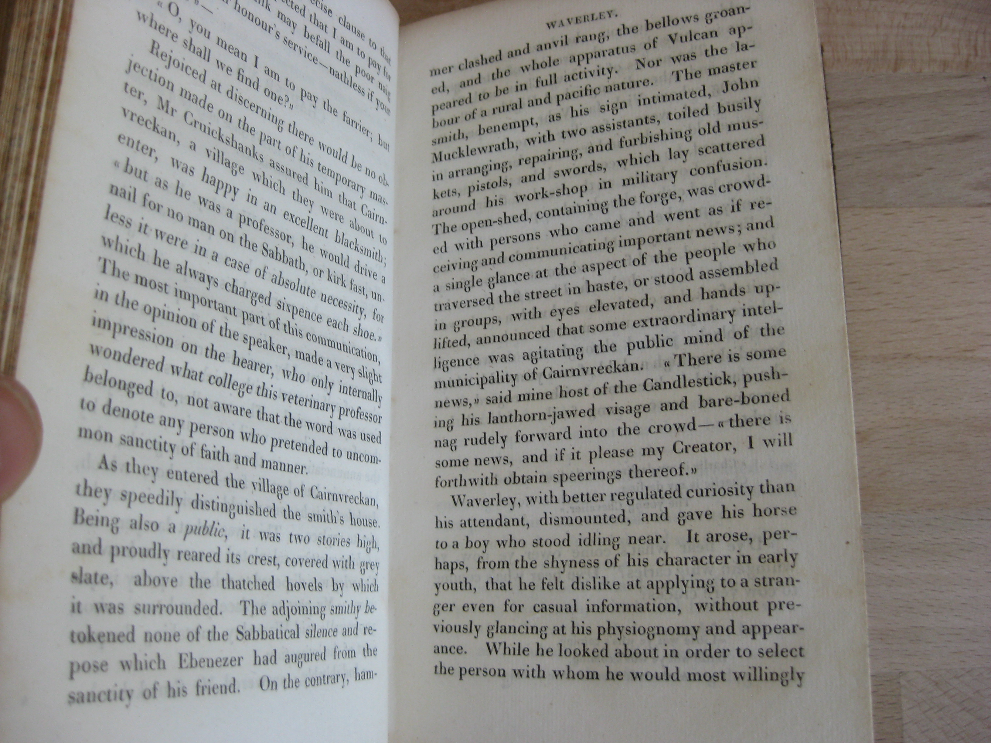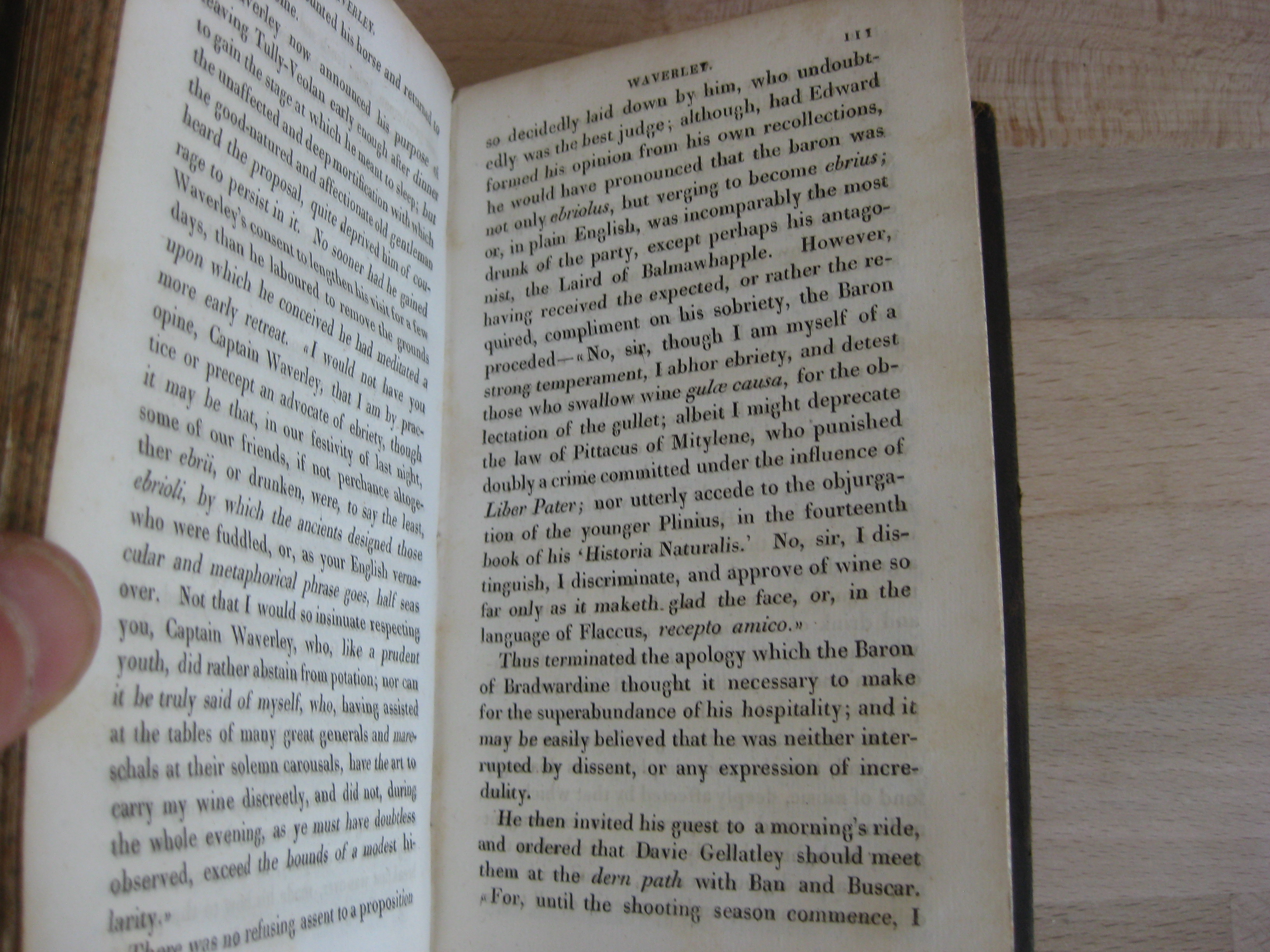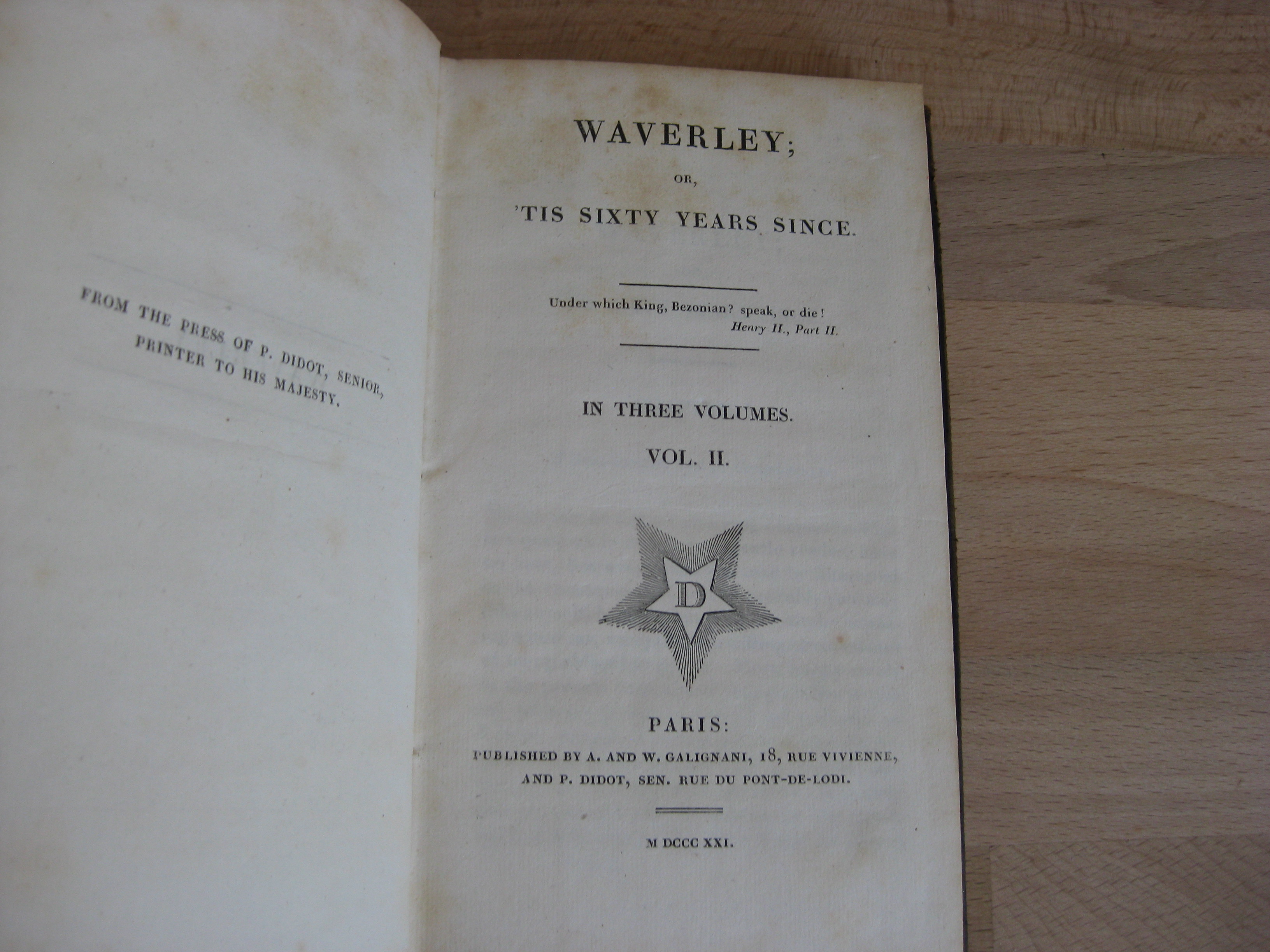 A. and W. Galignani – Plein veau marbré, dos long orné d’une pièce de titre et de tomaison en maroquin rouge, dos richement décoré frises et fleurons, plats à encadrement à liseré et frise, tranches jaspées, signet bleu-gris, 174 x 105, Third edition. 3 tomes. T1, Preface to the third edition, vi-viii, et 239p. TII, 247p. TIII, 248p. Rousseurs marginales, intérieurs propres. Coins, plats et champs frottés, avec épidermures, plats très bons ; mors et dos légèrement frottés mais très bons. Waverley ou l’Écosse il y a soixante ans est une oeuvre importante dans l’histoire de la littérature. Premier roman de l’auteur paru anonymement en 1814, il est considéré par G. Lukacs comme le premier roman historique de « forme classique. Également en stock dans la même reliure :Essays ; Woodstock ; Guy Mannering ; Kennilworth ; Peveril of the Peak