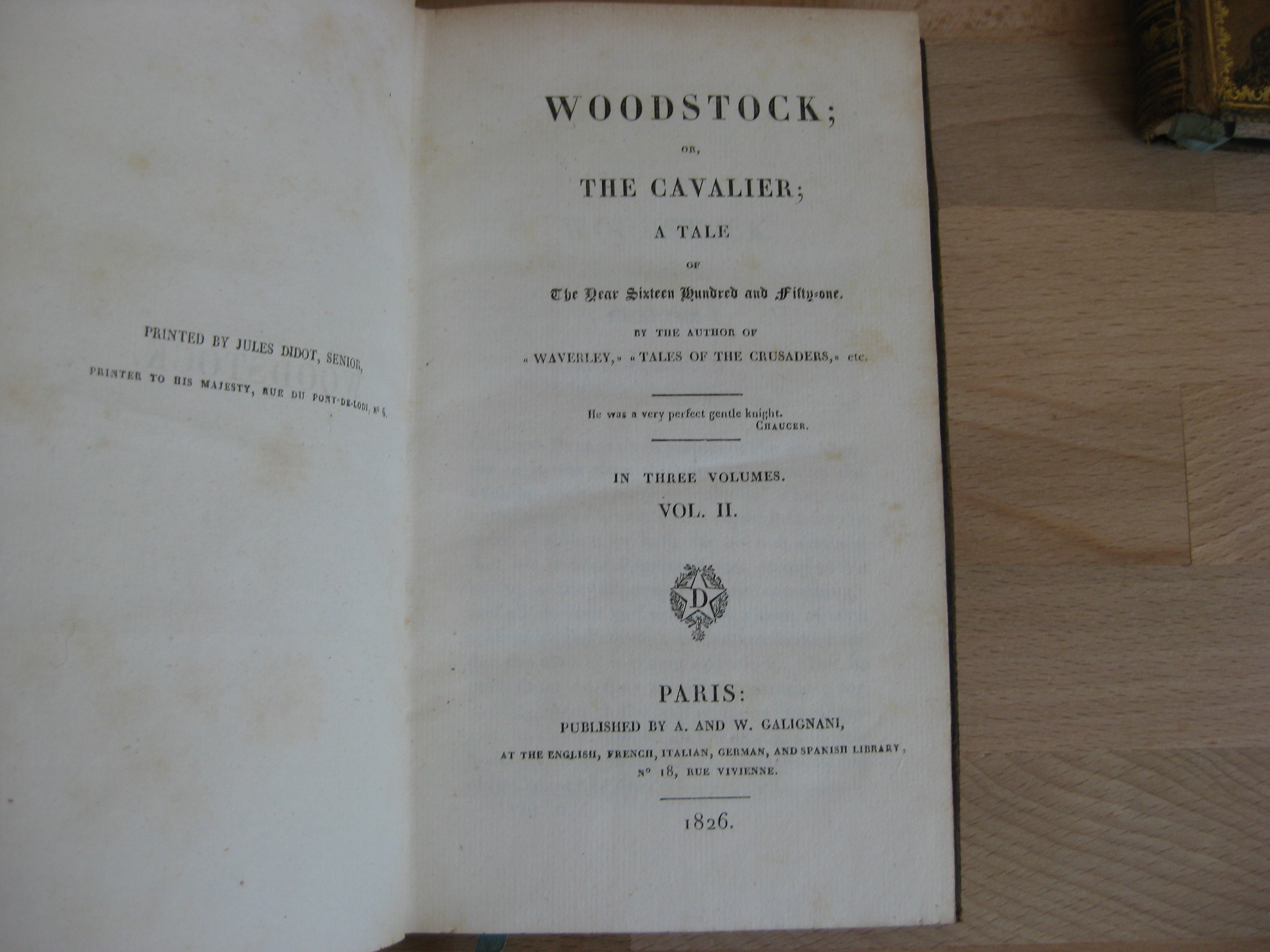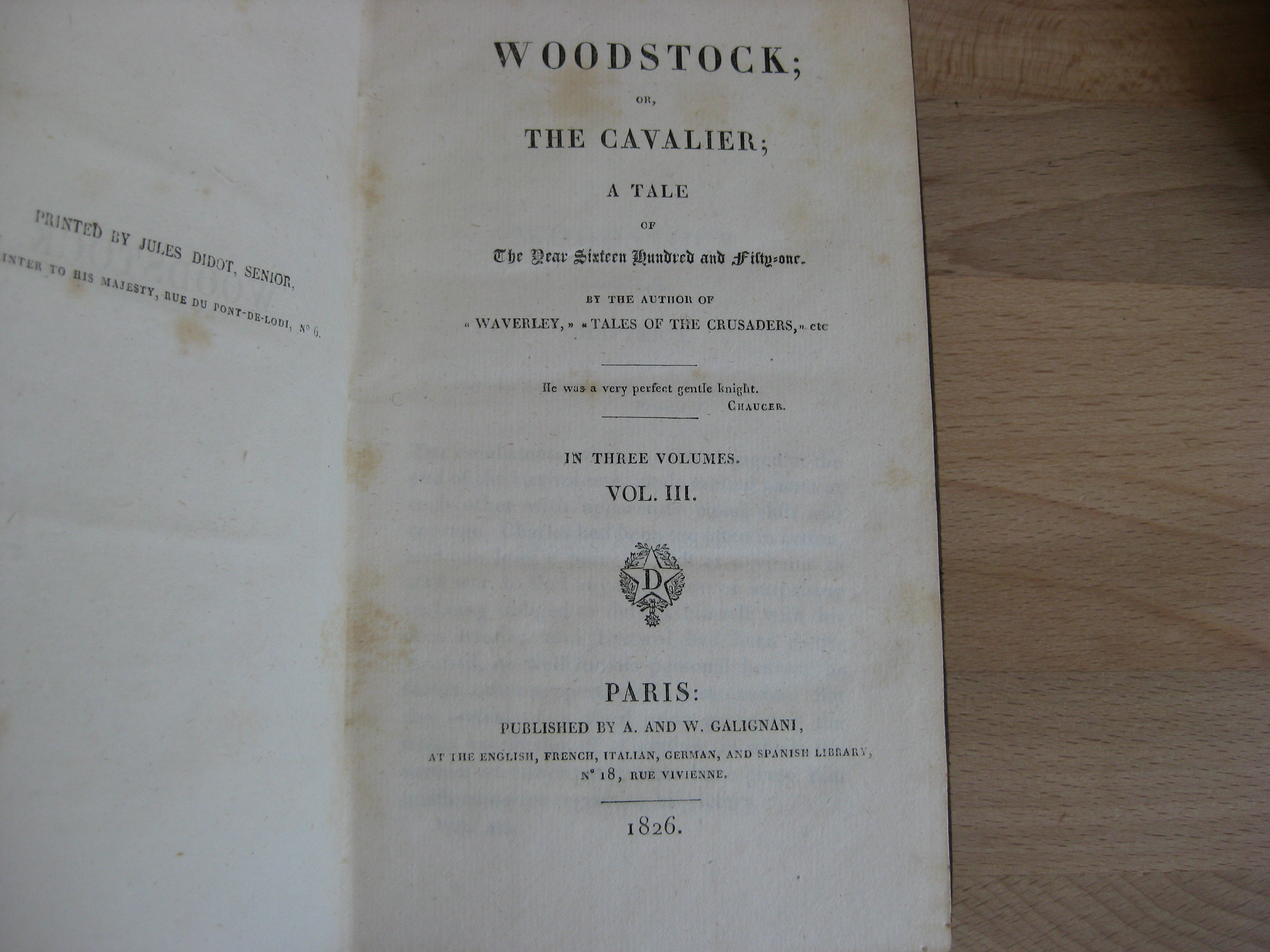 3 tomes, complet – A. and W. Galignani Plein veau marbré, dos long orné d’une pièce de titre et de tomaison en maroquin rouge, dos richement décoré frises et fleurons, plats à encadrement à liseré et frise, tranches jaspées, signet bleu-gris, 174 x 105, 1826. Même année que la première édition parue chez Archibald Constable and Co. 3 tomes. T1, Preface, ii-xii, et 259p. TII, 378p. TIII, 306p. Rousseurs marginales, intérieurs propres. Coins et champs légèrement frottés, avec épidermures, plats très bons ; mors et dos légèrement frottés mais très bons. Bel ensemble. Également en stock dans la même reliure : Essays ; Waverley ; Guy Mannering ; Kennilworth ; Peveril of the Peak